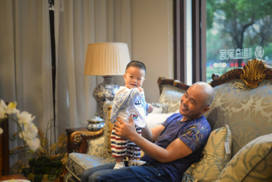 爸爸和孩子帶著融情的蜜意看著沉浸在幸福花海當中的媽媽,在不經意間笑靨如花。