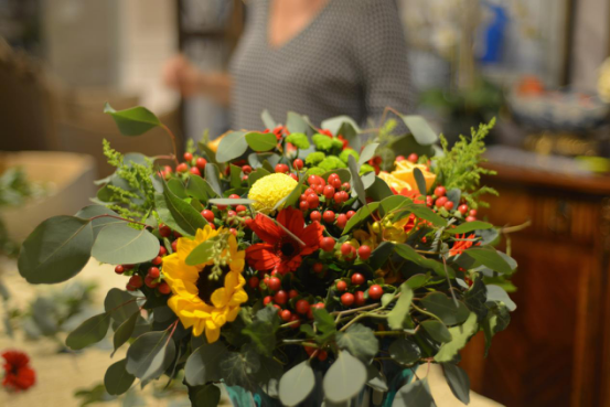 進口的鮮花芬芳四溢,色彩鮮艷,黃色的向日葵搭配大紅色的火龍珠,輔以香檳玫瑰、黃櫨,幾種不同的顏色,卻在一束花中各自美好,相映成趣。