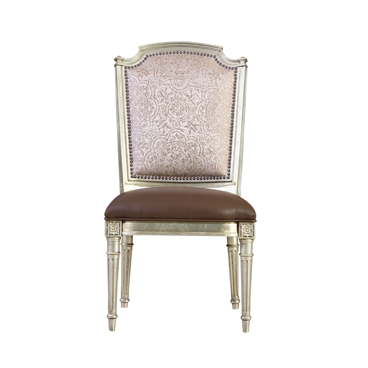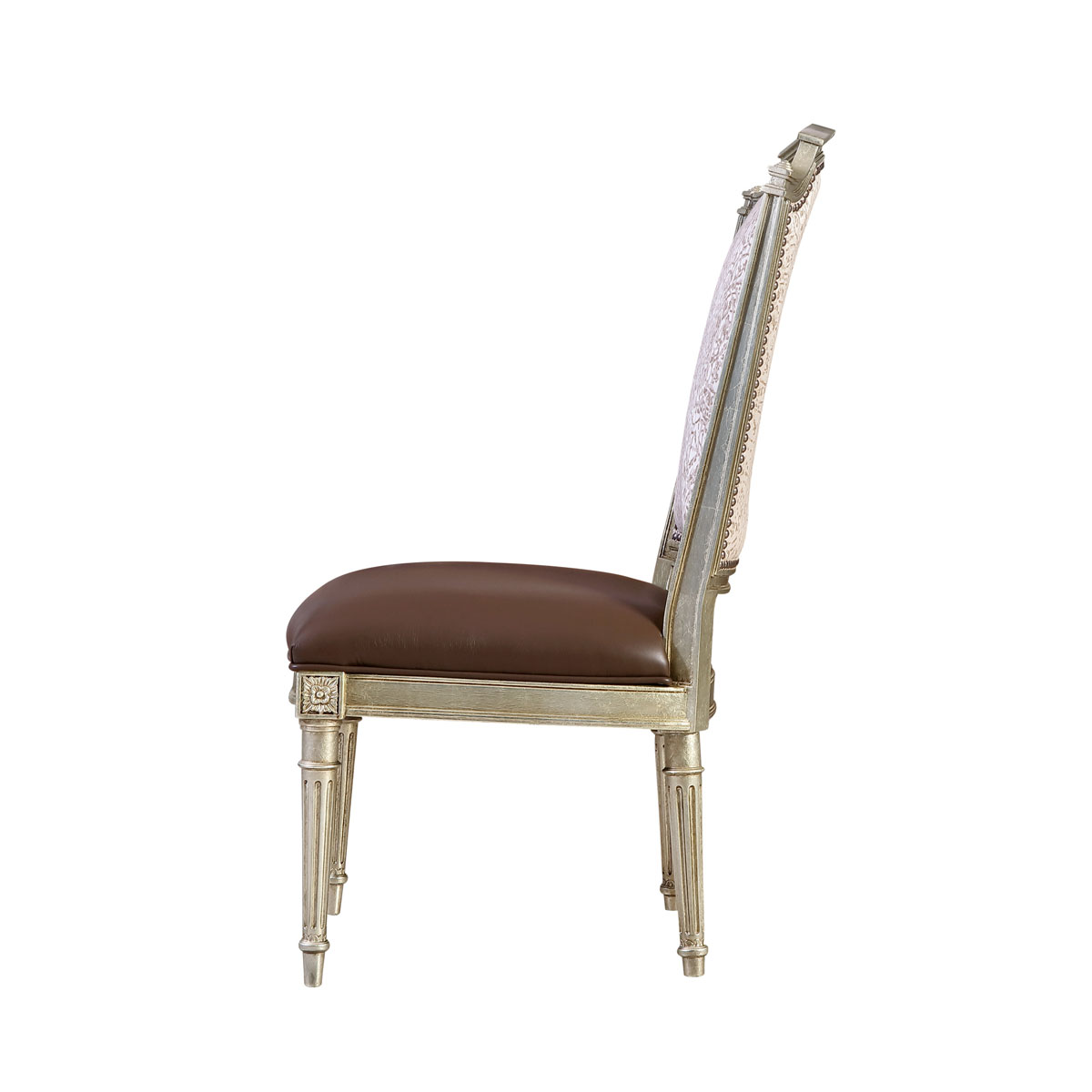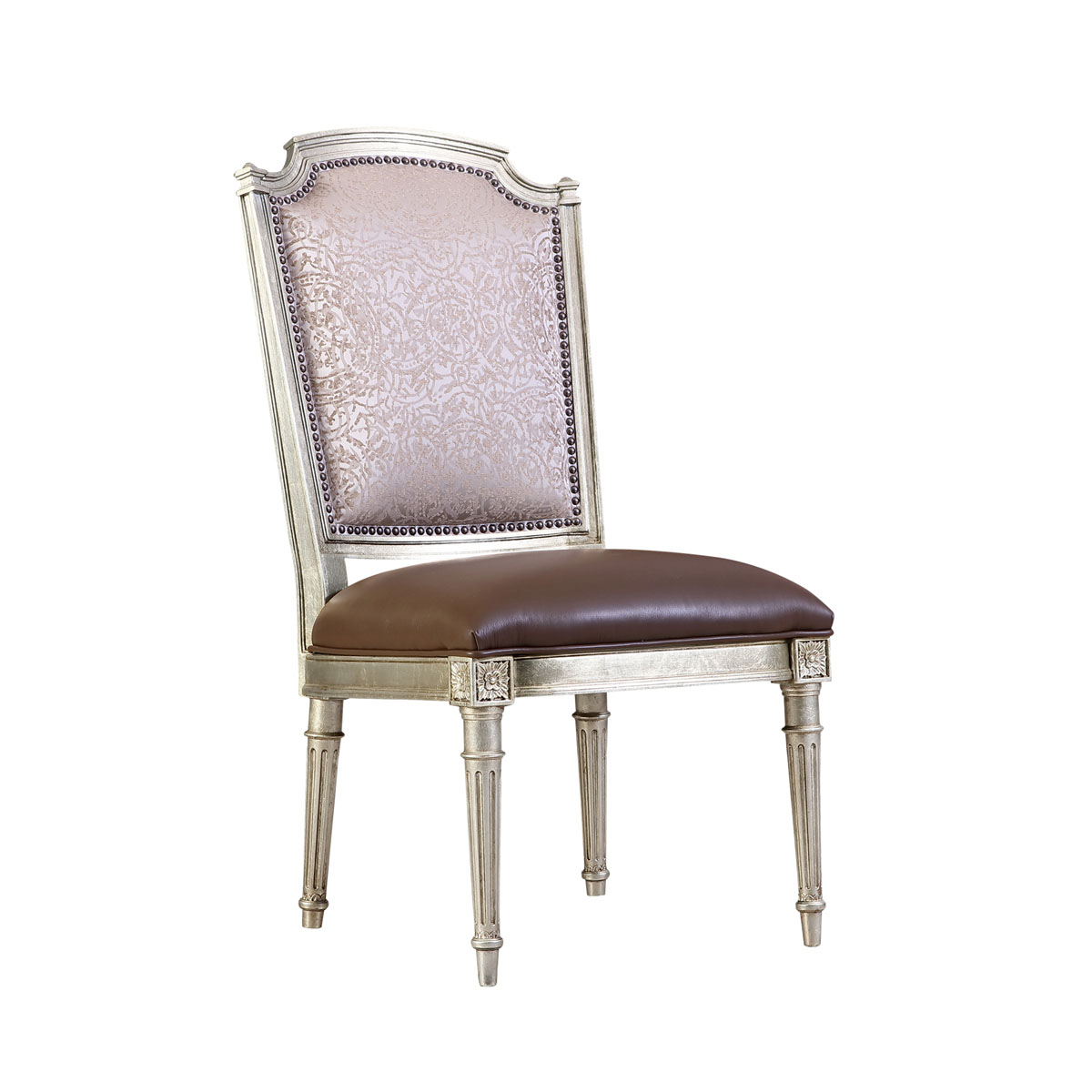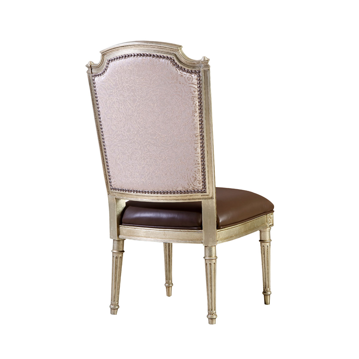 赫普爾懷特風(fēng)格的盾形背搭配車織雕刻腿比例優(yōu)美,造型優(yōu)雅,兼有古典式的華麗和路易十六式的纖巧。描金工藝與淡紫色軟裝布藝的交織,是自然的色彩密碼與權(quán)利至上的象征。