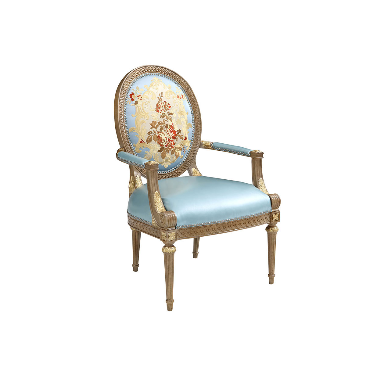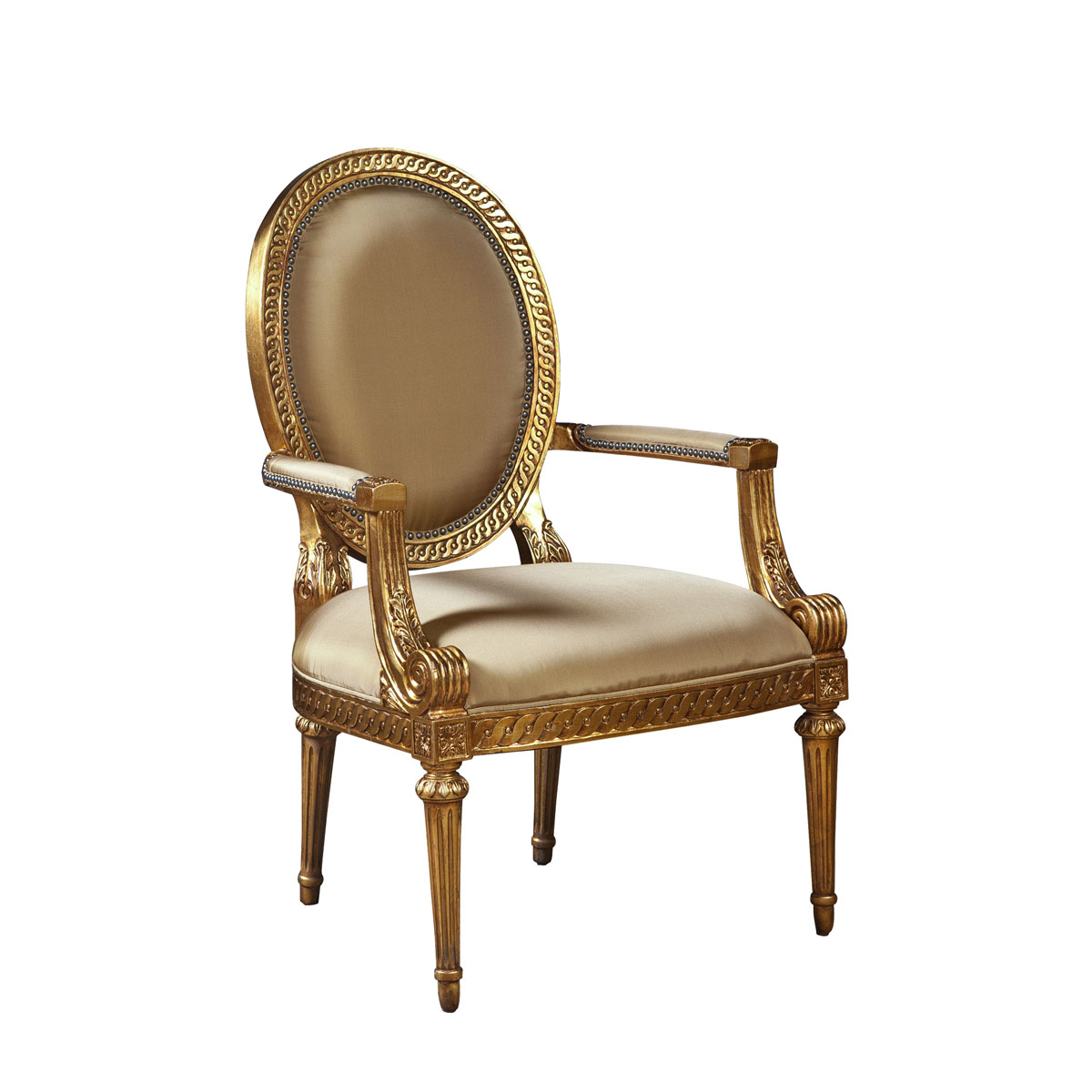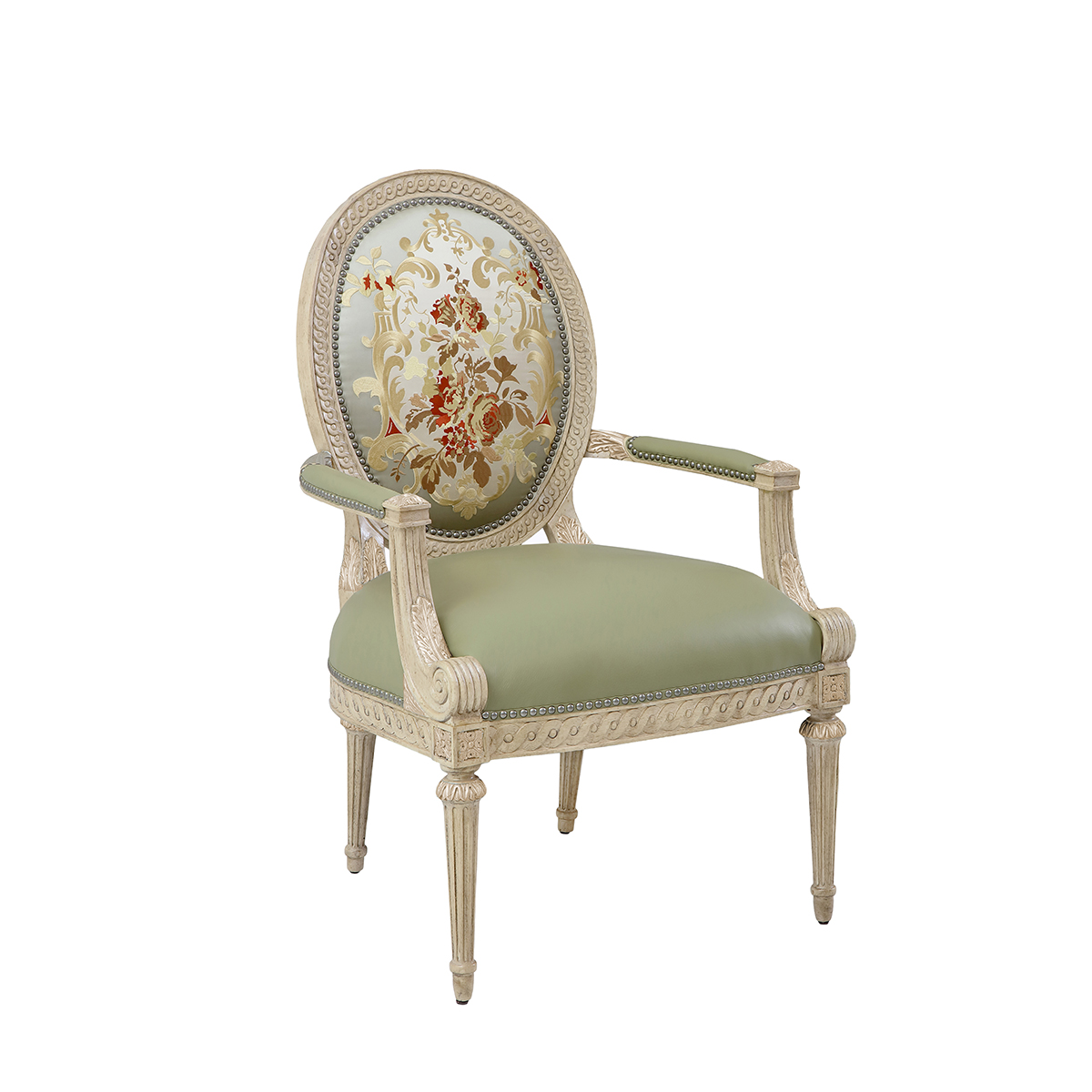 這款休閑椅是參考18世紀法國路易十六時期涂金扶手椅古董設計,并結合同時期的圓面背板設計。配上精致的連續雕刻、錐形腳設計、觸感舒適的布藝和包有豐厚的填充物坐墊和靠背。