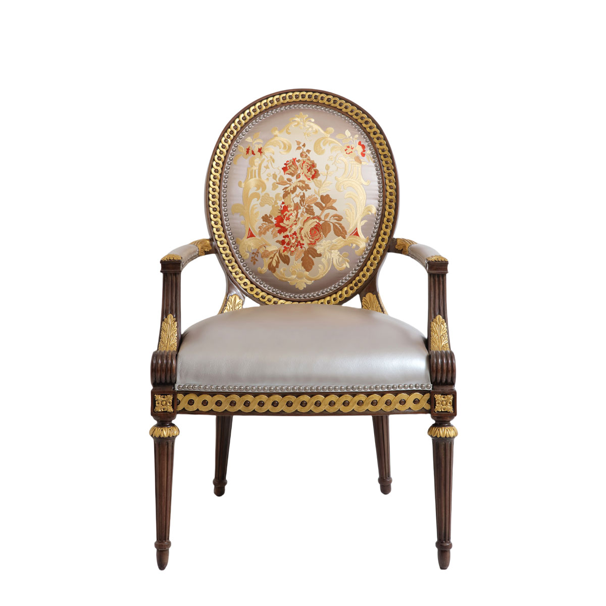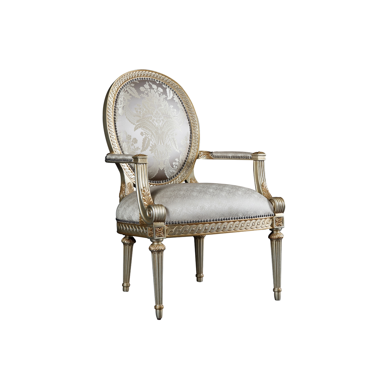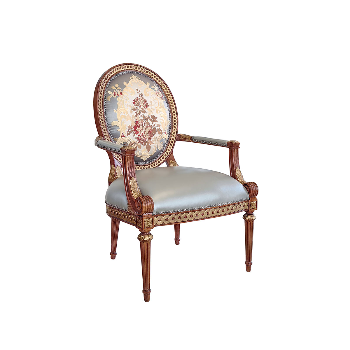 這款休閑椅是參考18世紀法國路易十六時期涂金扶手椅古董設計,并結合同時期的圓面背板設計。配上精致的連續雕刻、錐形腳設計、觸感舒適的布藝和包有豐厚的填充物坐墊和靠背。