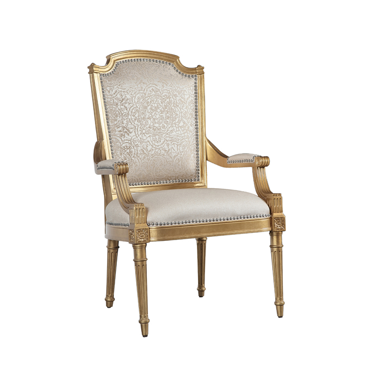 赫普爾懷特風格的盾形背搭配車織雕刻腿比例優美,造型優雅,兼有古典式的華麗和路易十六式的纖巧。描金工藝與淡黃色軟裝布藝的交織,是自然的色彩密碼與權利至上的象征。
