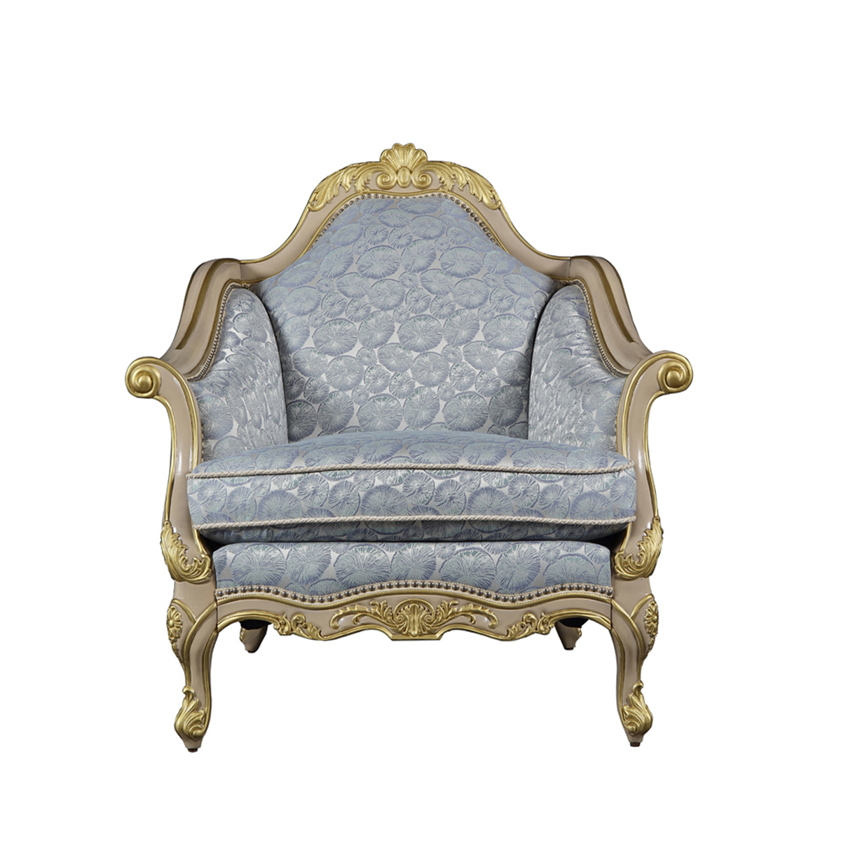 * 線條的沙發造型猶如連綿不斷的花海,實木的藤花雕刻搭配繁花點綴的沙發布藝,盡情演繹普羅旺斯的萬種風情,行如流水的銀色釘扣,給自由的生活空間裝飾上浪漫的色彩。