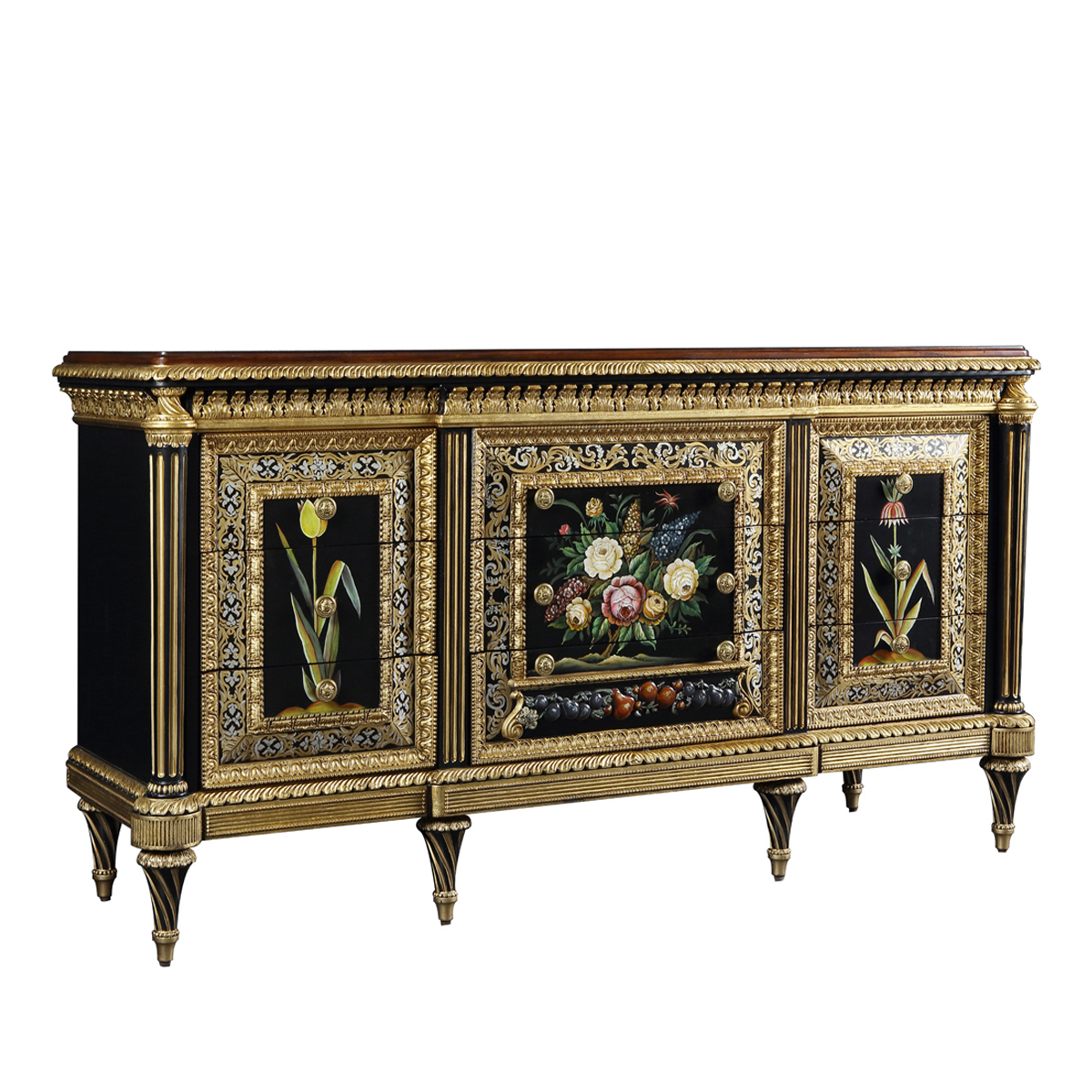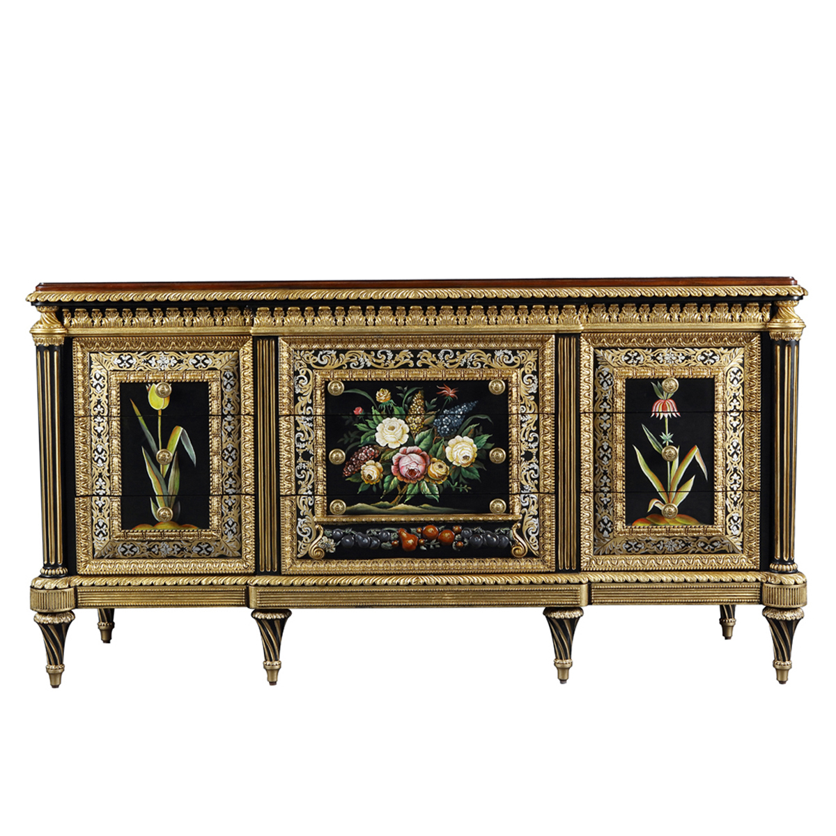 以英國溫莎堡中的新古典風(fēng)格長柜為意念,設(shè)計出古典復(fù)刻版。絕美的植物彩繪和花朵蔓藤雕刻,撲捉溫莎城堡的淺谷繁花;英國皇室家具完美呈現(xiàn),形象逼真地描繪了貴族家居生活美學(xué)的真諦。