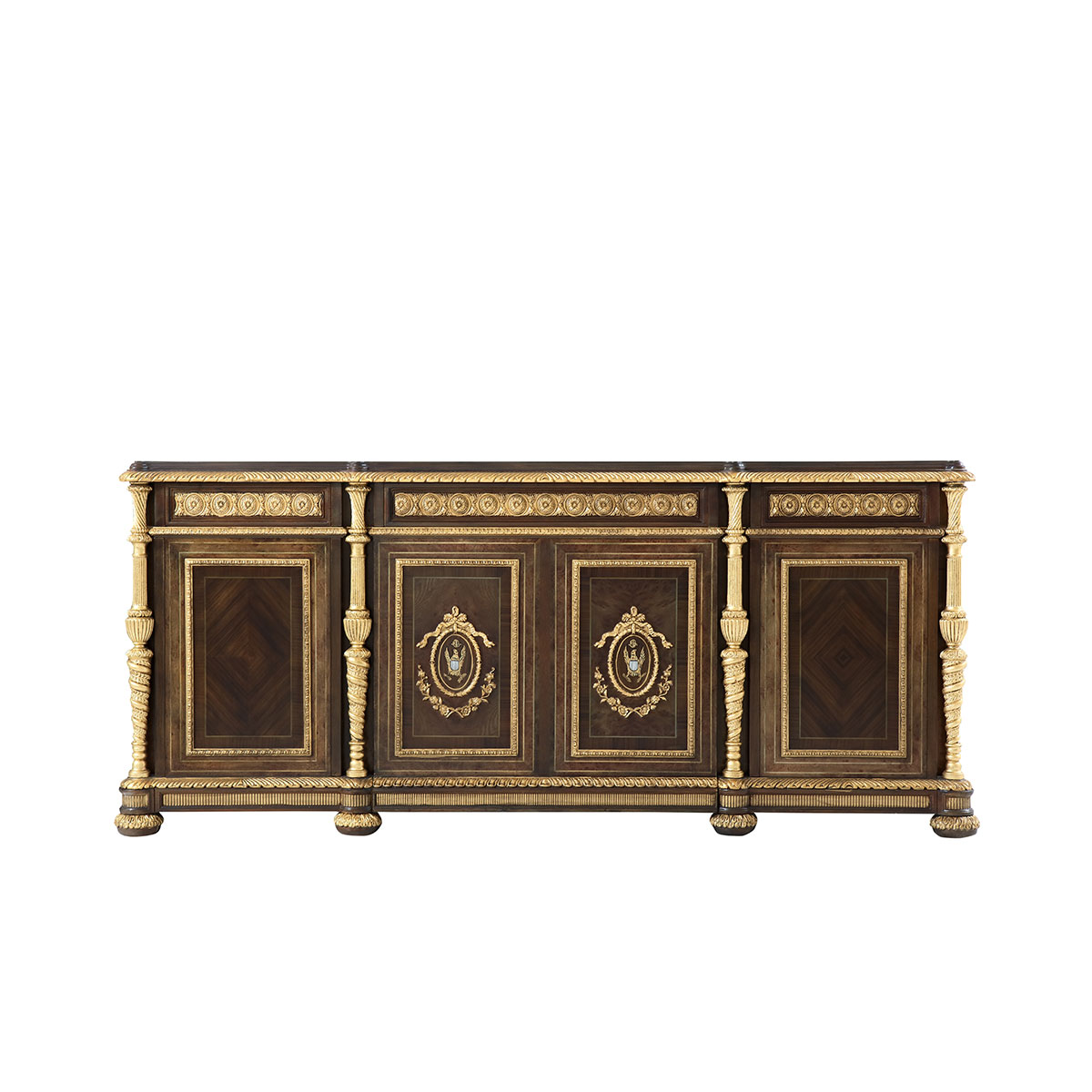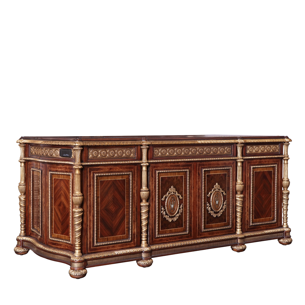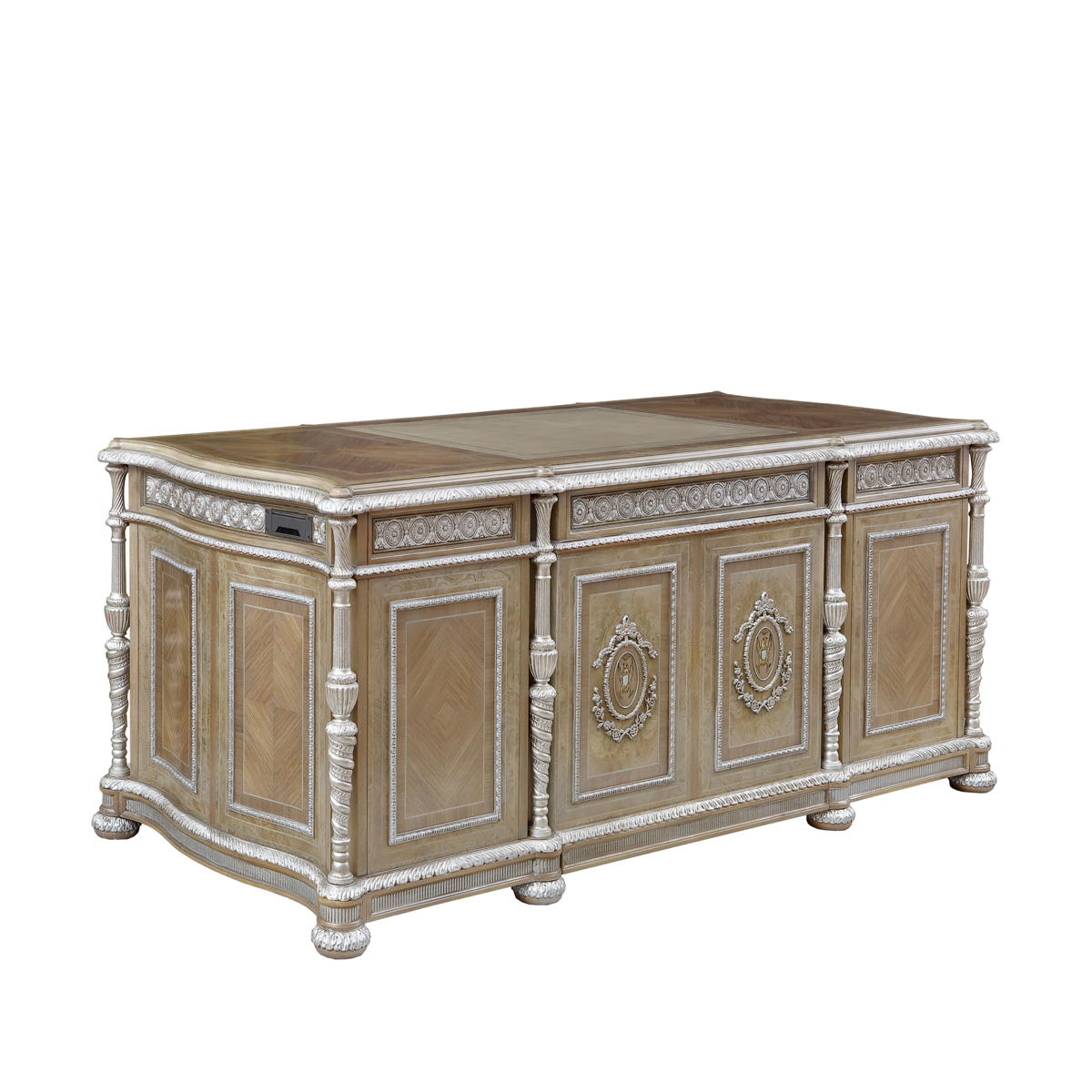 采用謝拉頓風格經典桌腿,上端配以常用的箍和腳輪,參考優(yōu)雅高貴的 Ionic Order(愛奧尼克式羅馬柱)雕刻,鑿刻出精致的手工雕刻細節(jié),以及輔以紋理清晰而有層次的木皮拼花,帶來溫莎堡皇廷般奢雅的辦公體驗。