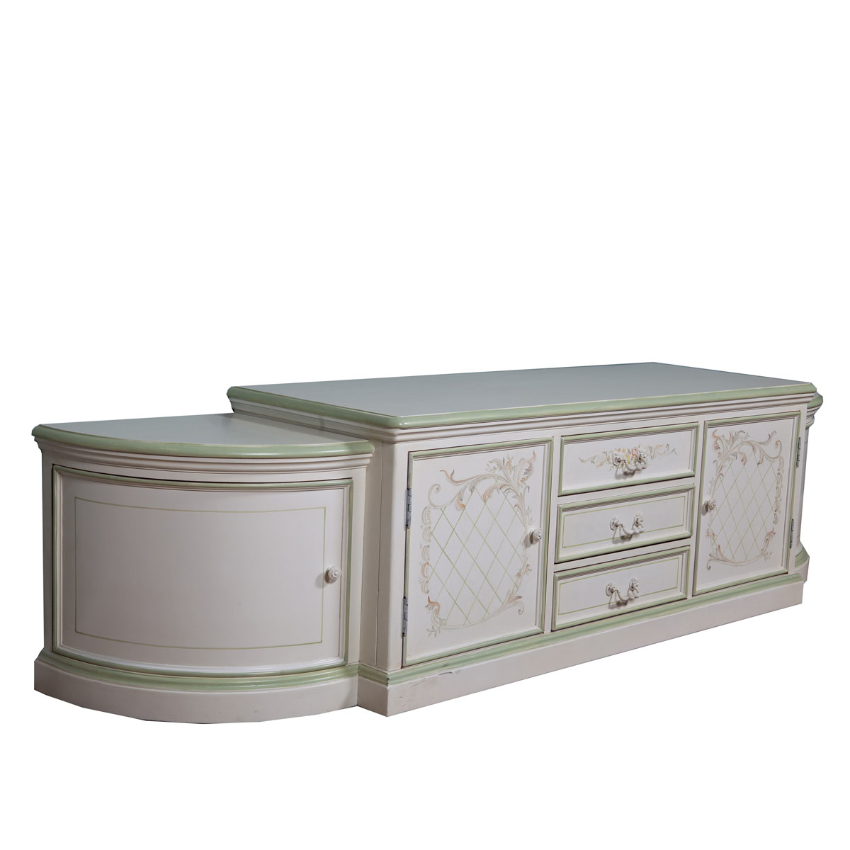 * 手工拼花更顯藝術(shù)價(jià)值,左右合拼制成半月形狀 * 門內(nèi)各有一塊可調(diào)層板 * 三個(gè)儲(chǔ)物抽斗,底部采用硬木實(shí)木滑軌 * 腳底部裝有可調(diào)整腳釘.