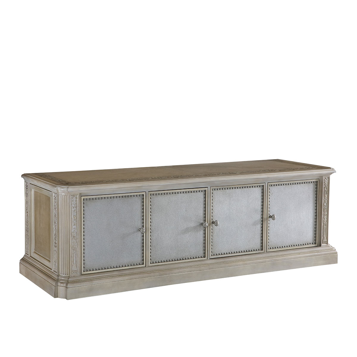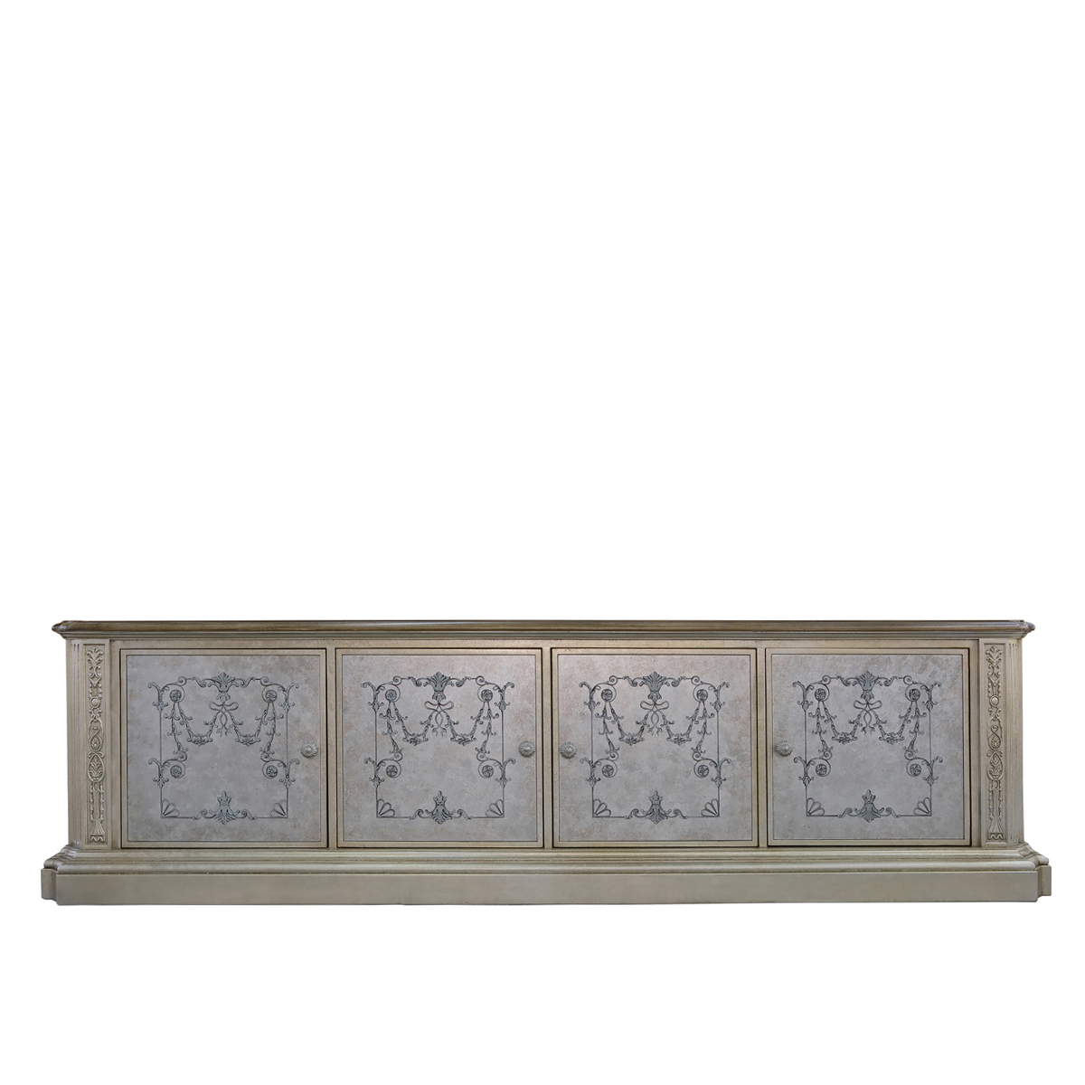 玻璃為畫板,銀箔壓花,在復(fù)古彩繪色調(diào)中傾注人性情感,原本單調(diào)的美便生動(dòng)了起來。栩栩如生的花紋圖案帶來幸福的福音,彰顯頑強(qiáng)的生命力量;沉穩(wěn)端莊的電視柜遵循著對稱的法則。