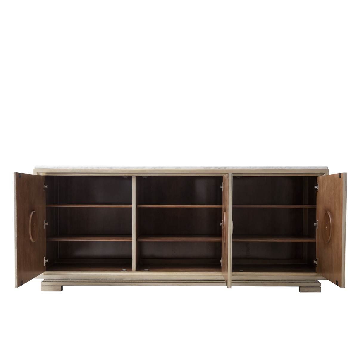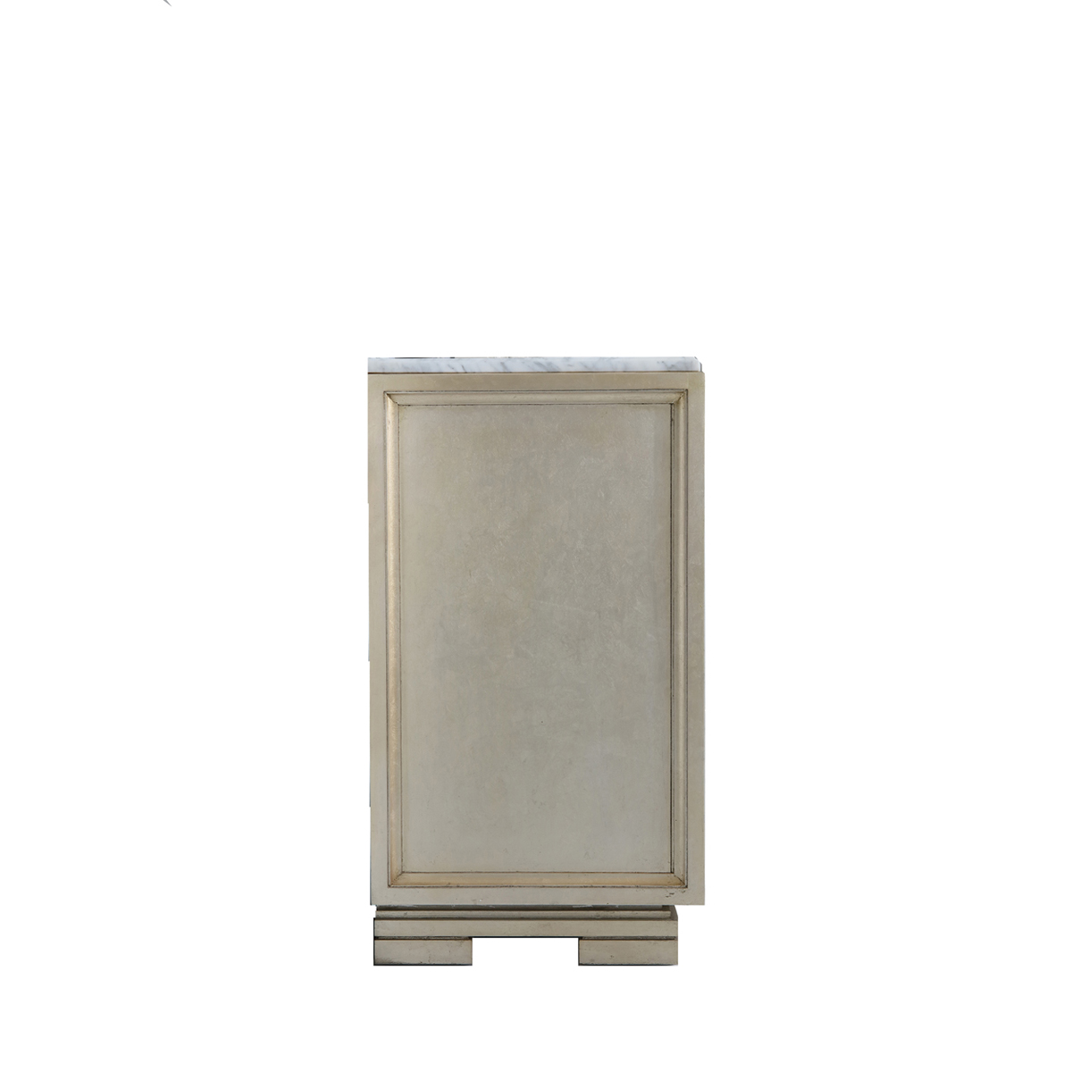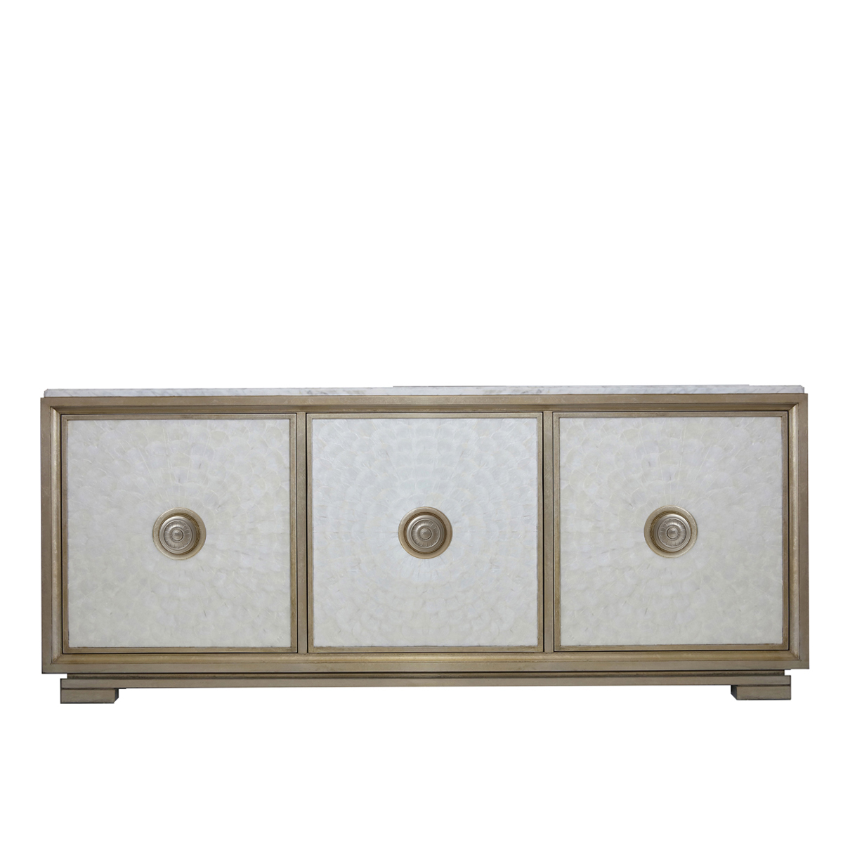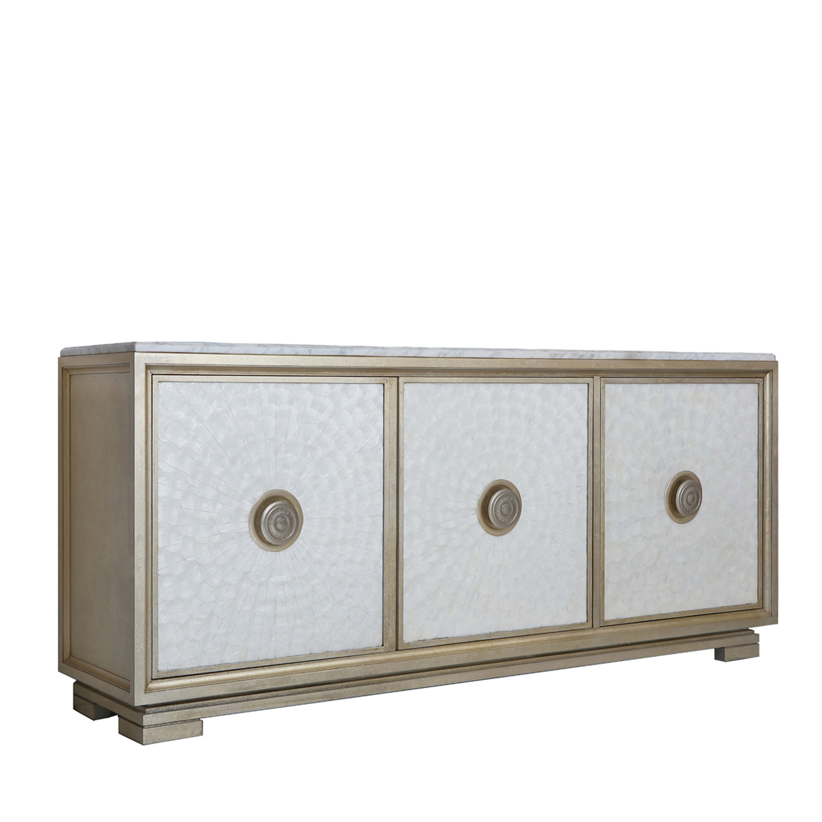 剛純的云石柜面,手工仿金箔貼飾,甄選珍珠母貝材質的鑲嵌工藝,工匠將珍珠母貝打磨成統一厚度,再拋光處理,令其呈現出美麗的虹彩效果。多鐘不同材料的跨界融合,表現出淡雅而濃烈的時尚新宮廷高雅。
