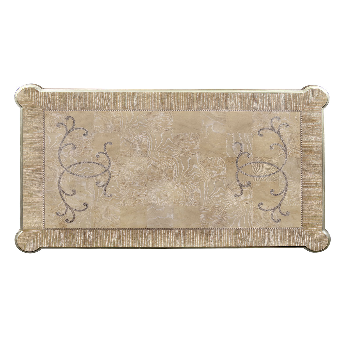 以直線為美的的羅馬柱元素打造而成,桌面的圖案使用名貴的白栓樹瘤,由工藝嫻熟的匠師純手工拼貼而成,紋理較亂,木紋呈自然凌亂之美,木質細膩,如蝙蝠翅膀的底座寓意“福”到,寓意深遠。