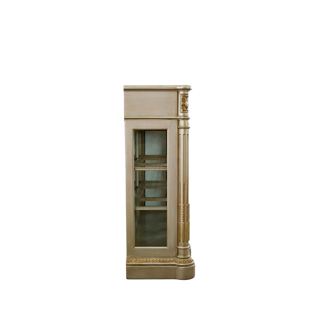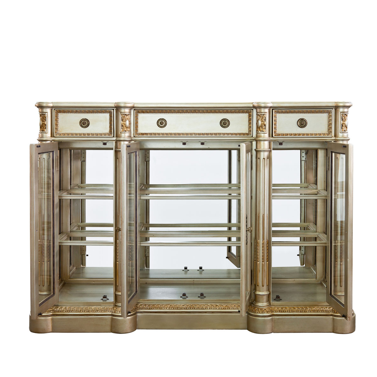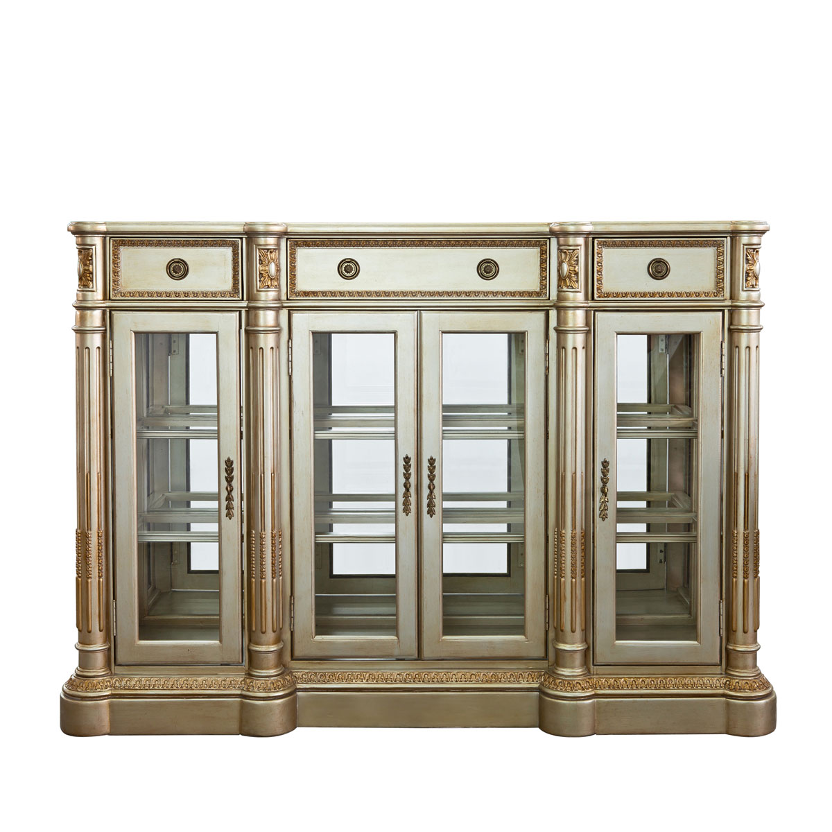 * 以法國路易十六時(shí)期的古董家具為設(shè)計(jì)基礎(chǔ),采用同時(shí)期的建筑柱元素和耀眼奢華的網(wǎng)眼圖案、金箔貼飾,使其充滿了法式宮廷的優(yōu)雅與華麗,充分詮釋了18世紀(jì)法式家具融合建筑與家具設(shè)計(jì)的藝術(shù)特點(diǎn)。