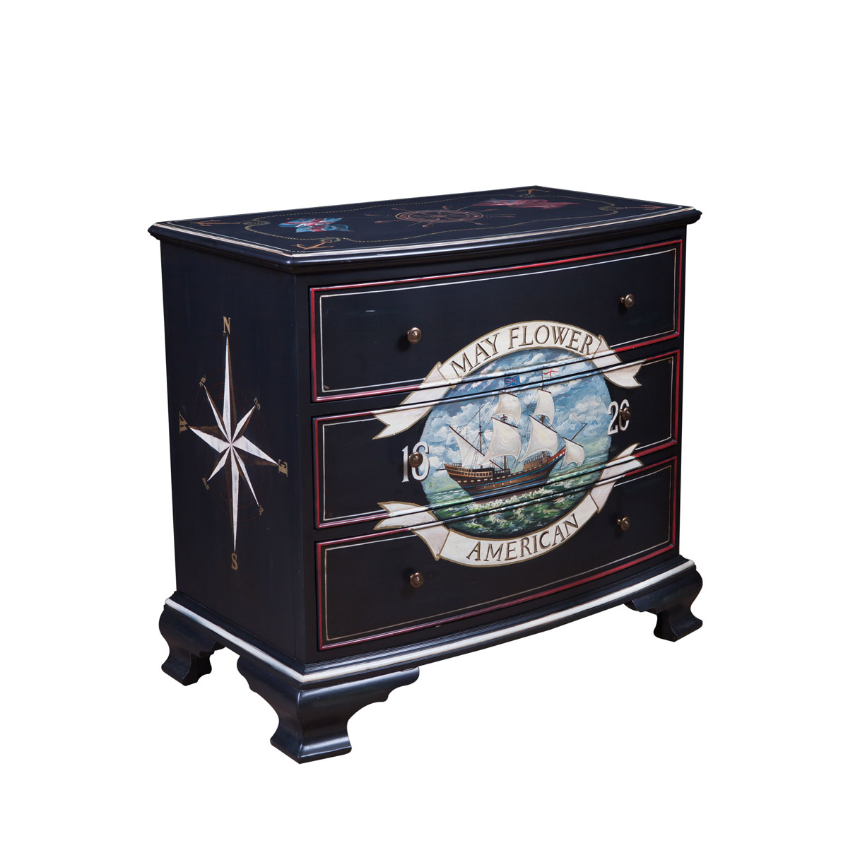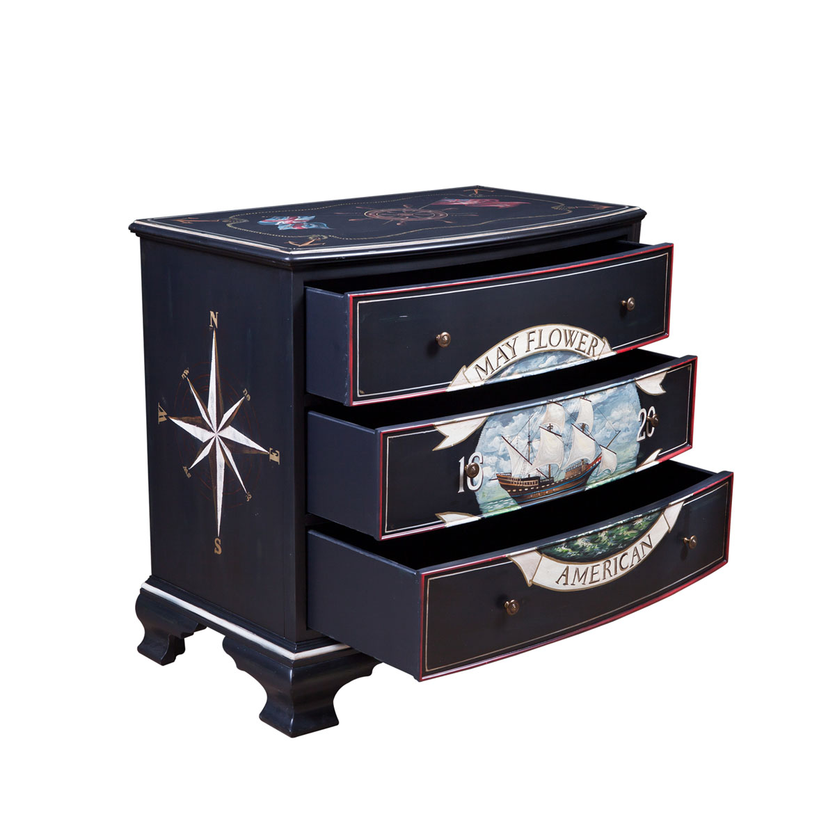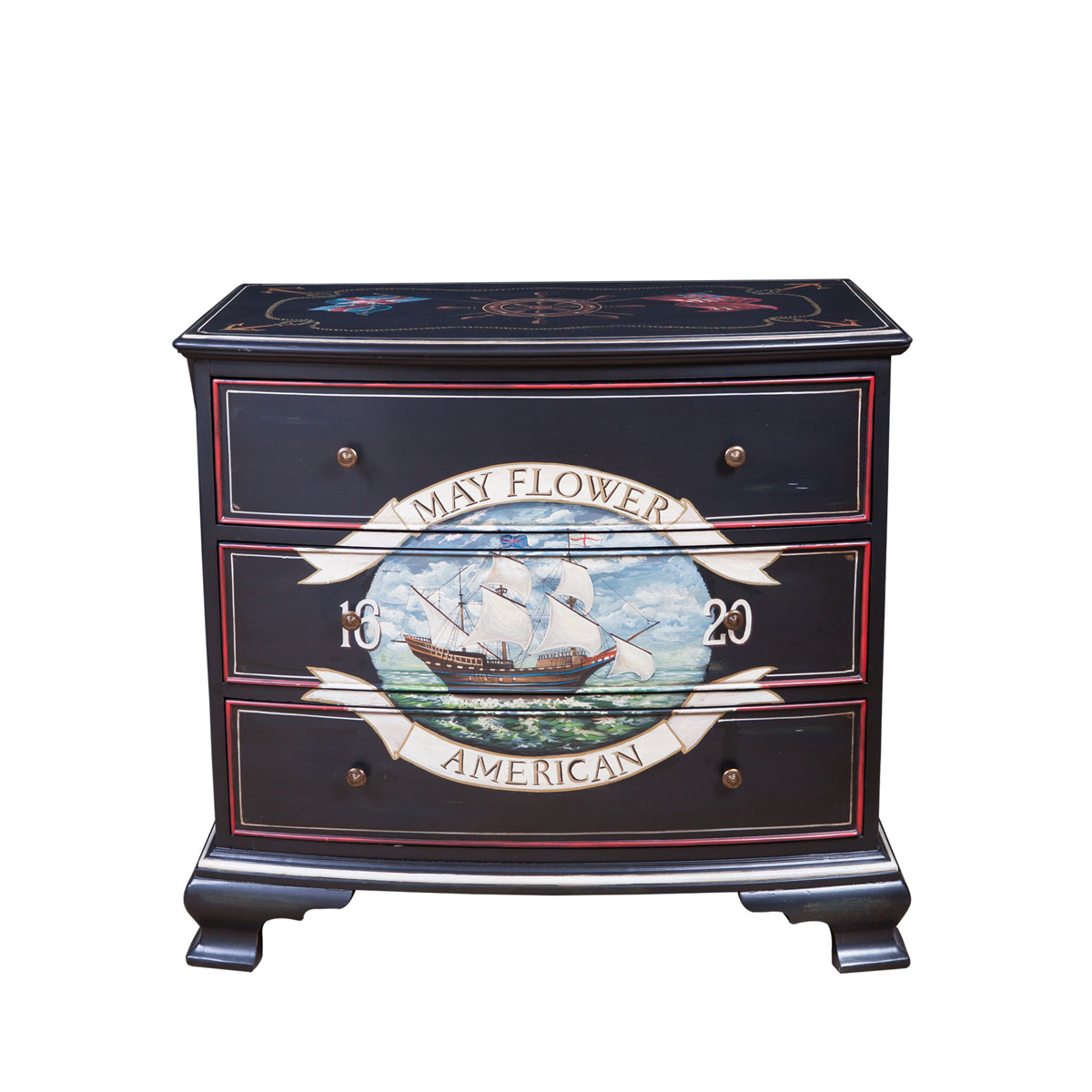 * 代表自由的五月花號(hào)不單只把不同地方的文化帶到美洲大陸,更把不同國(guó)家的風(fēng)格帶到這里。如使用航海元素的手繪工藝配搭經(jīng)典的黑色油漆,黑色油漆來(lái)至于中國(guó)風(fēng)水中的黑色,是北方和“水”的象征,自古有水能生財(cái)一意,充分表現(xiàn)了美國(guó)果敢堅(jiān)毅的開(kāi)拓精神與多元融合的美式家具特色