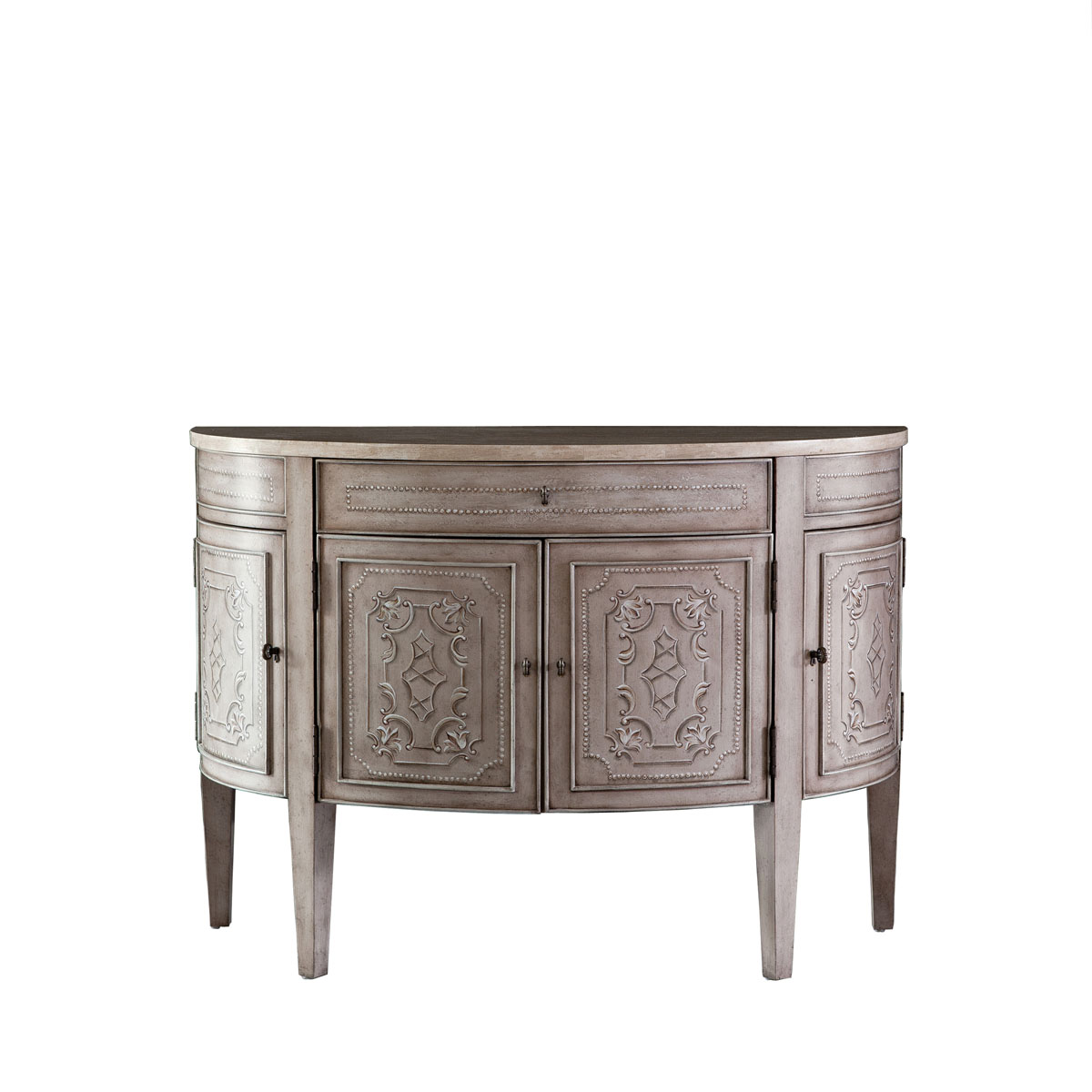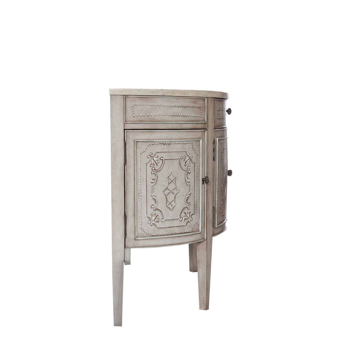 * 高貴的古銀色為這款半圓柜鍍上了一層永不過時的經典外衣,開裂紋、明暗不一的色澤等做舊工藝留住了歲月的印跡,洋溢著古董家具的藝術風骨;簡潔優雅的雕刻圖案,蘊藉著耐人尋味的美學內涵,如若傳之后世更顯光彩榮耀。