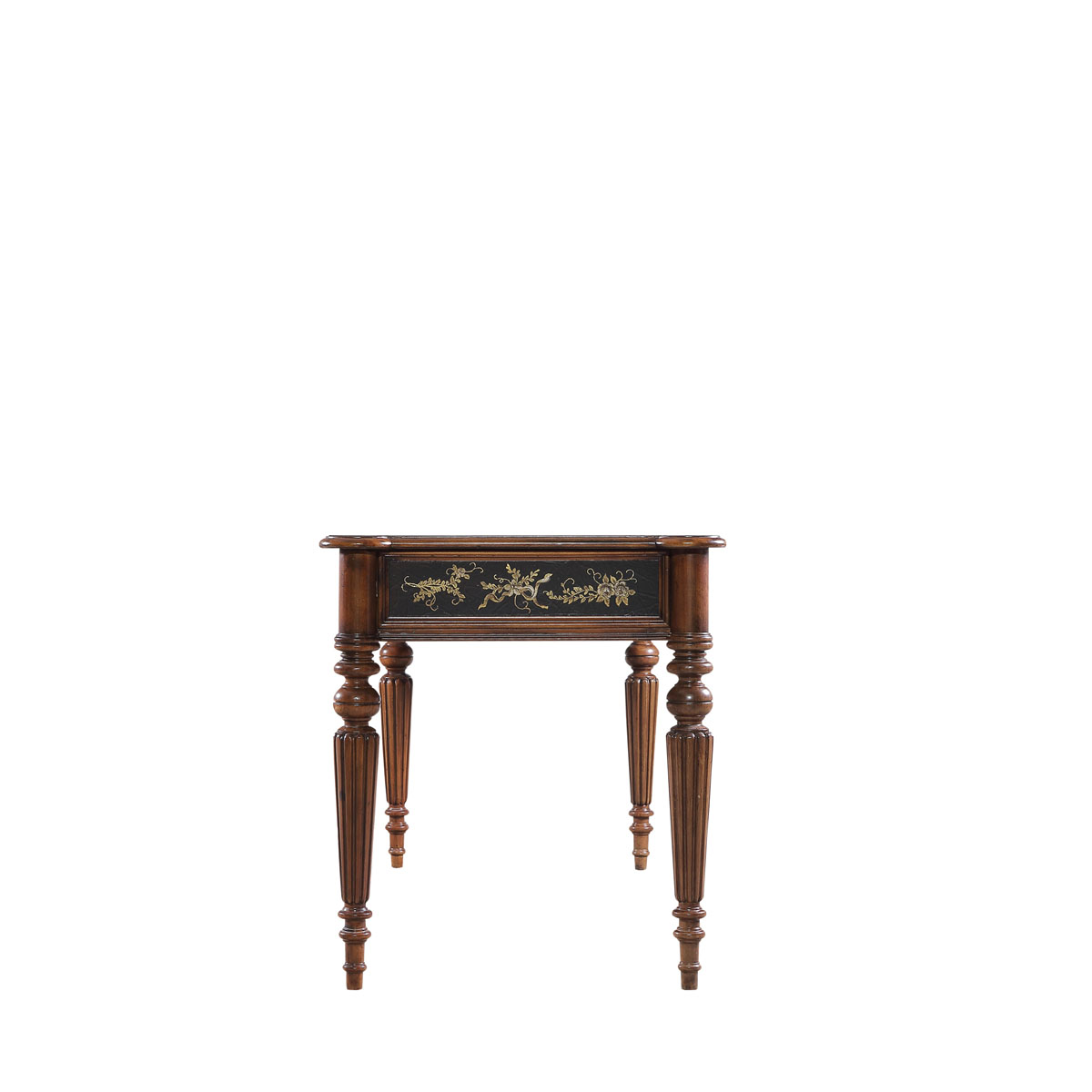 * 以18世紀(jì)英吉利——“日不落帝國(guó)”為設(shè)計(jì)主題,將東西方的多種藝術(shù)元素結(jié)合在一起。精致的木皮貼面,展現(xiàn)了高檔木材的天然紋理,帶出獨(dú)特的立體感;黑底金漆的山水手繪,頗具東方情調(diào)。配上Sheraton(謝拉頓風(fēng)格)的錐形凹槽柱和層板設(shè)計(jì),是經(jīng)典系列英吉利經(jīng)典英式長(zhǎng)方咖啡桌的特色。