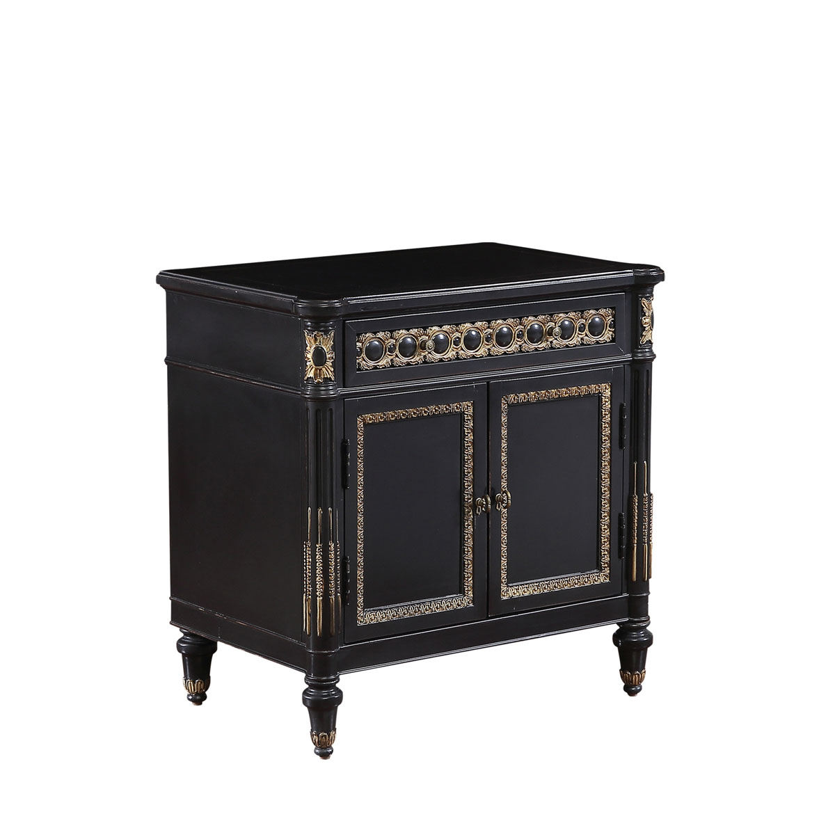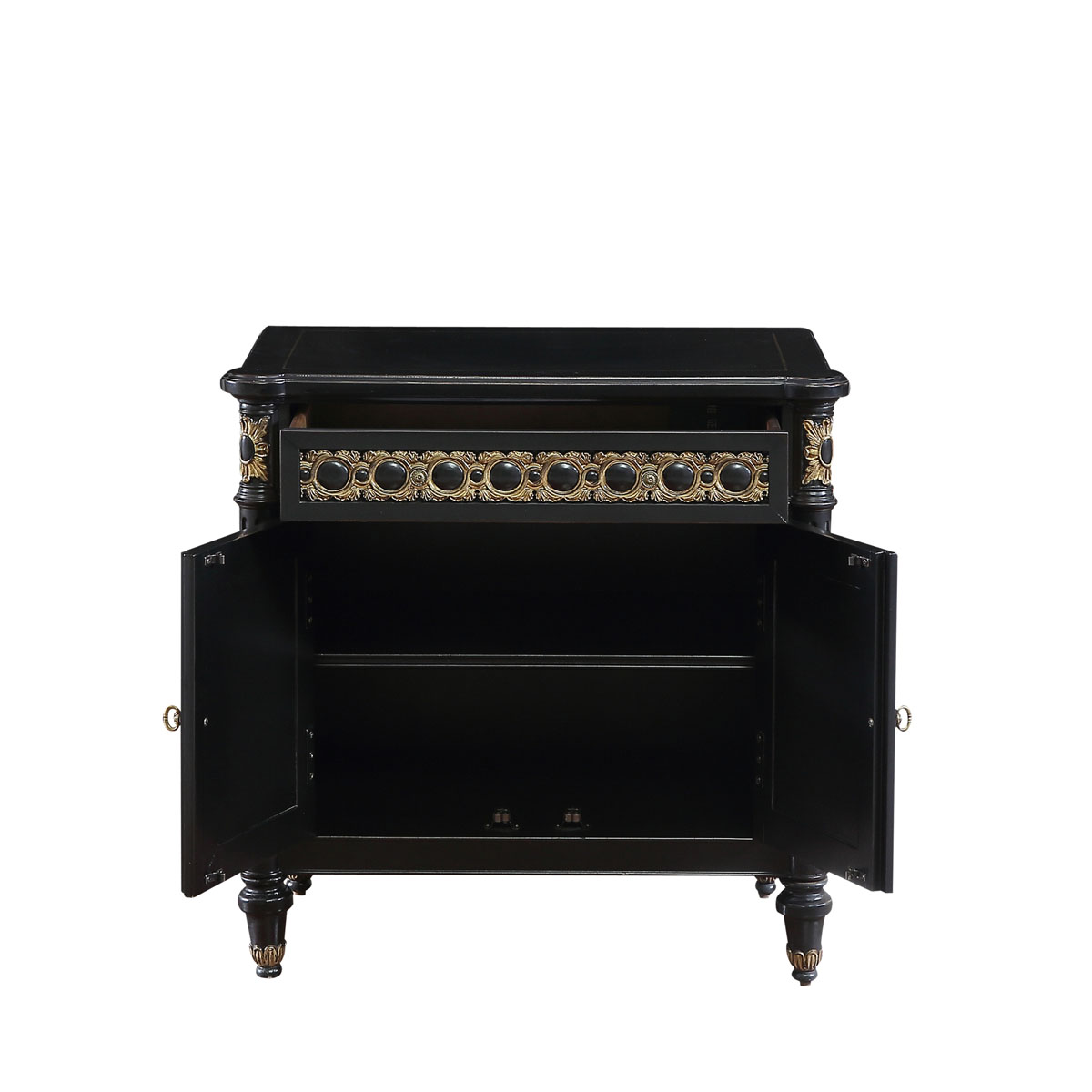 * 手工雕刻的工藝細節; * 結實的連接技術 * 一個儲物抽斗,而在其底部采用英式經典硬木實木滑軌設計; *門內一塊活動層板 * 仿金箔工藝配上十八道油漆工藝讓每一件家具都是工藝品;