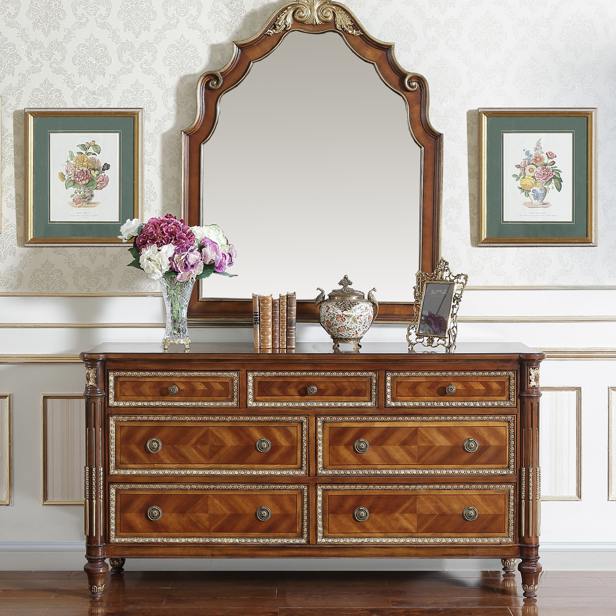 * 為表現法國路易時期的莊嚴和浪漫,以法國凡爾賽宮為設計元素。使用歌頌路易十四時期的太陽花雕刻,顯示其王權穩固地位的錐形腿腳設計,配以鉆石圖案的木皮貼面、古銅色的球形把手和貼金工藝,完美演繹了法式宮廷家具的奢華尊貴。