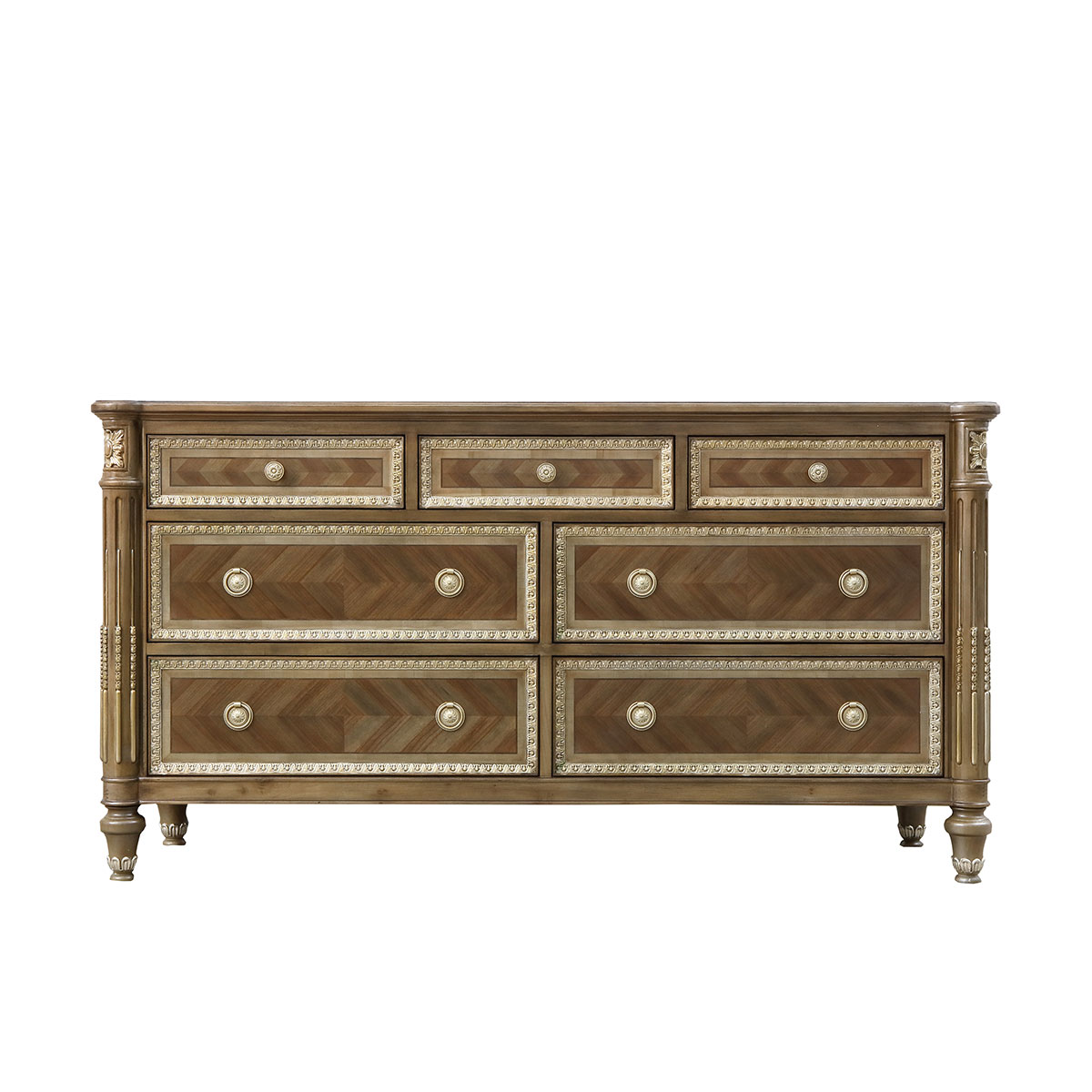 * 為表現法國路易時期的莊嚴和浪漫,以法國凡爾賽宮為設計元素。使用歌頌路易十四時期的太陽花雕刻,顯示其王權穩固地位的錐形腿腳設計,配以鉆石圖案的木皮貼面、古銅色的球形把手和貼金工藝,完美演繹了法式宮廷家具的奢華尊貴。
