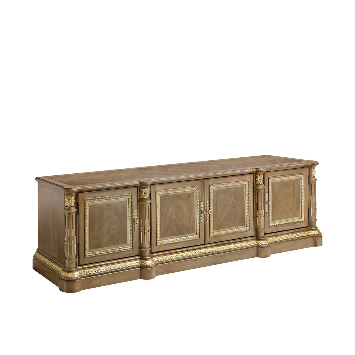 * 手工雕刻的工藝細節,結實的連接技術; * 中間兩個儲物抽斗配有CD/DVD隔板,可CD/DVD更好的存放,其底部采用經典硬木實木滑軌設計; * 兩扇門內各有1塊可調層板;上部為開空設計,可在內放播放器等電子器材; * 腳底部裝有可調腳釘;