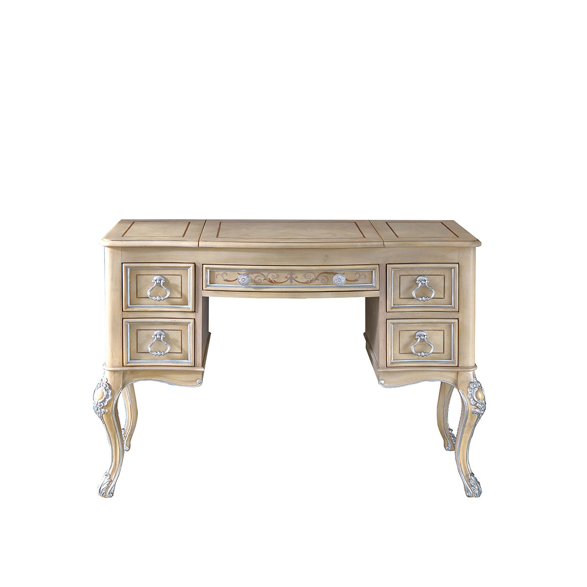 * 四個儲物抽斗,底部采用硬木實木滑軌.中間抽斗的設計可翻下斗面,用來放置鍵盤,抽斗內側有電線孔,抽斗兩邊裝有兩條三節消聲鐵滑軌,滑順耐用; * 中間面板可打開,里面有鏡子和絨布戒指格; * 腳底部裝有可調腳釘