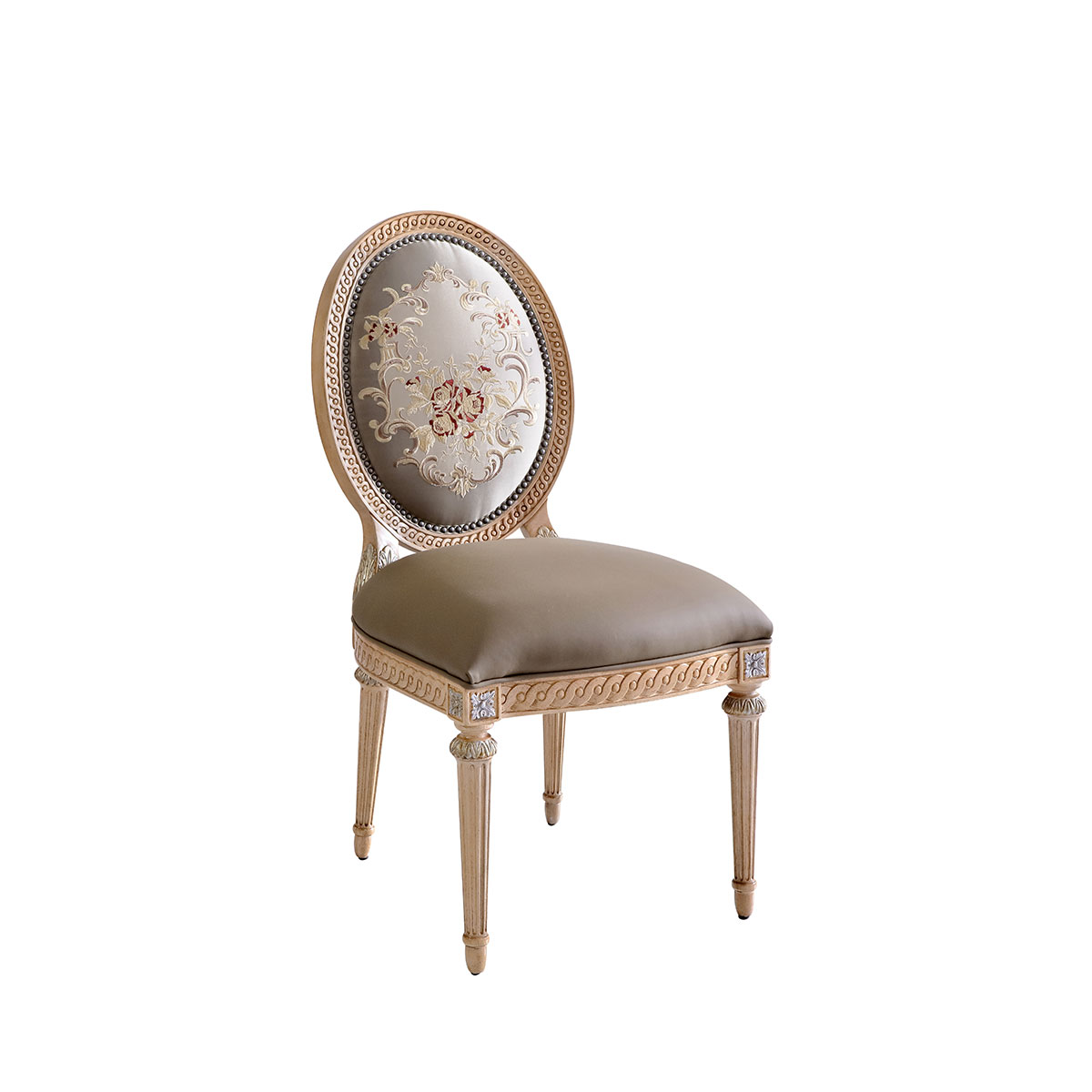 參考18世紀法國路易十六時期涂金扶手椅古董設計,并結合同時期的圓面背板設計。配上精致的連續雕刻和貼金鉑工藝、錐形腳設計、觸感舒適的布藝和包有豐厚的填充物坐墊和靠背。