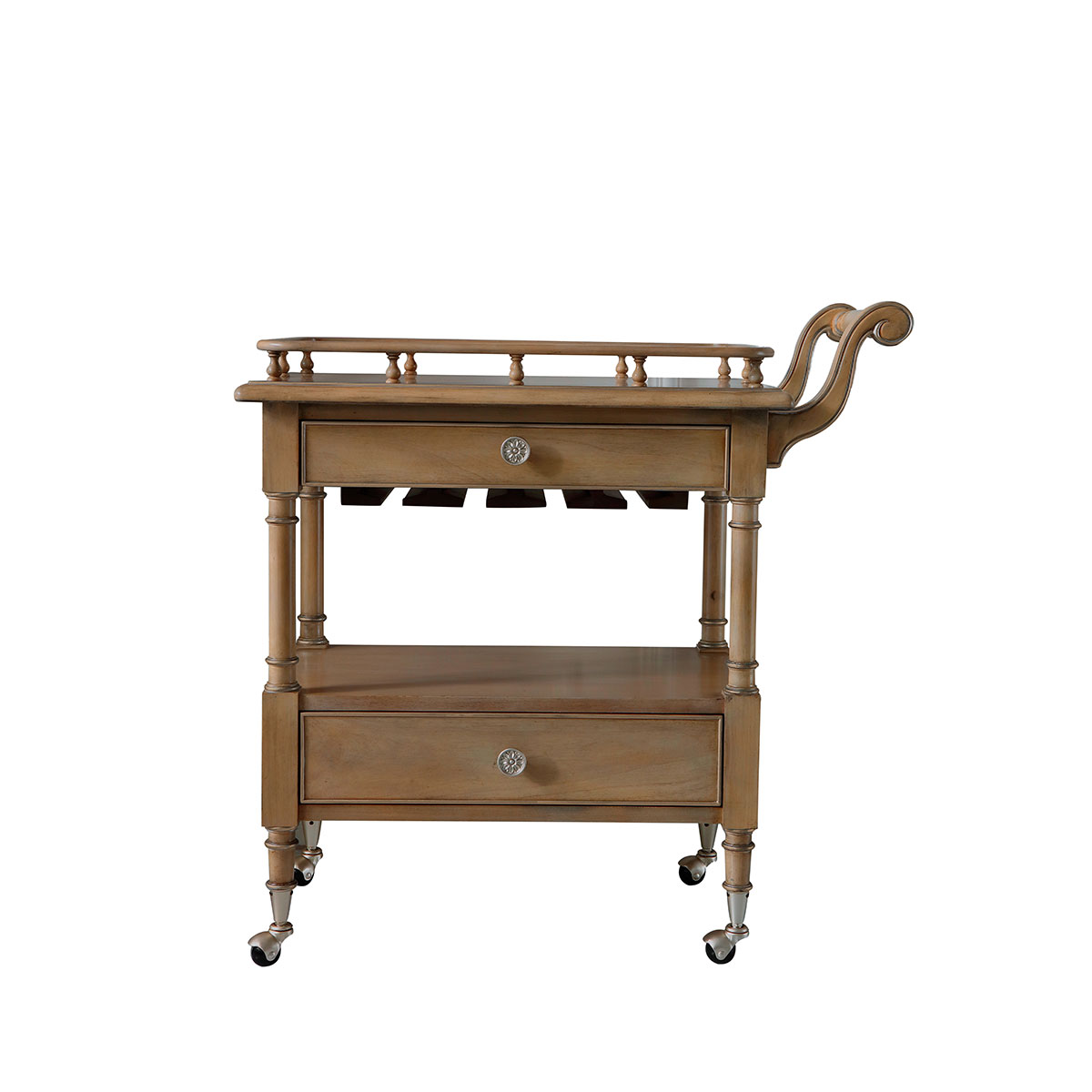 * 二個儲物抽斗,底部采用經典的硬木實木滑軌 * 頂上有護邊帶推手,底下帶腳輪,中間帶掛酒杯的木制瓶架。