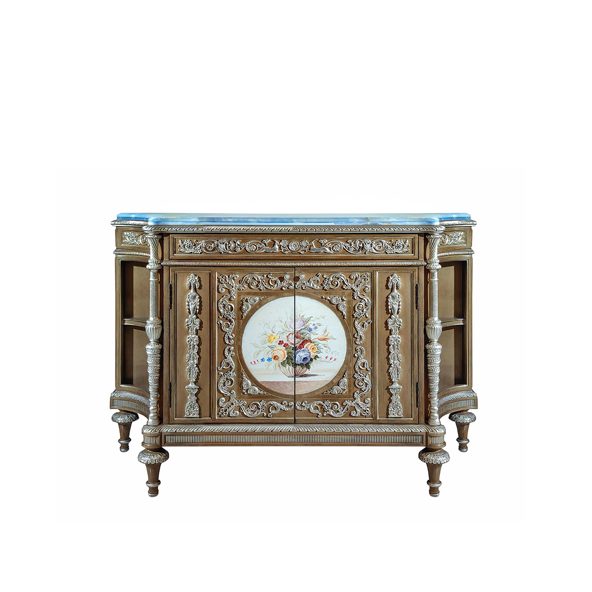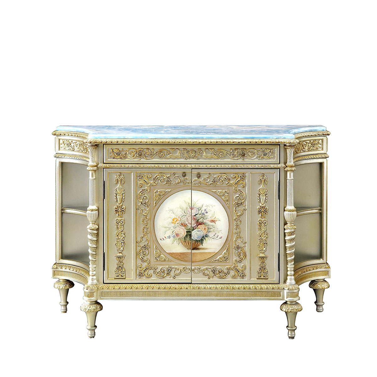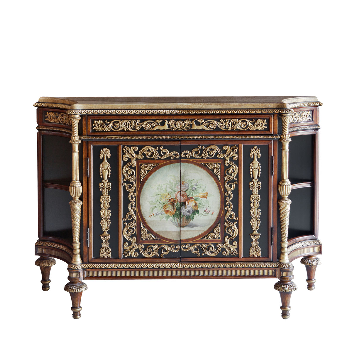 * 這是設計意念來自于英國溫莎堡中安妮女王時期的走廊柜。柜門上的花草彩繪是安妮女王喜歡觀賞園藝的寫照。羅馬短劍裝飾花紋,則表現軍隊的強悍和靈活。配上精致的手工雕刻細節和貼金工藝,是豪華系列溫莎堡英式走廊柜的特色。