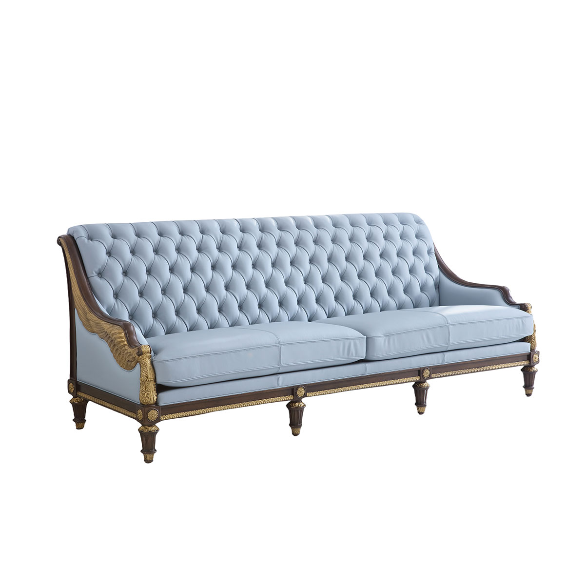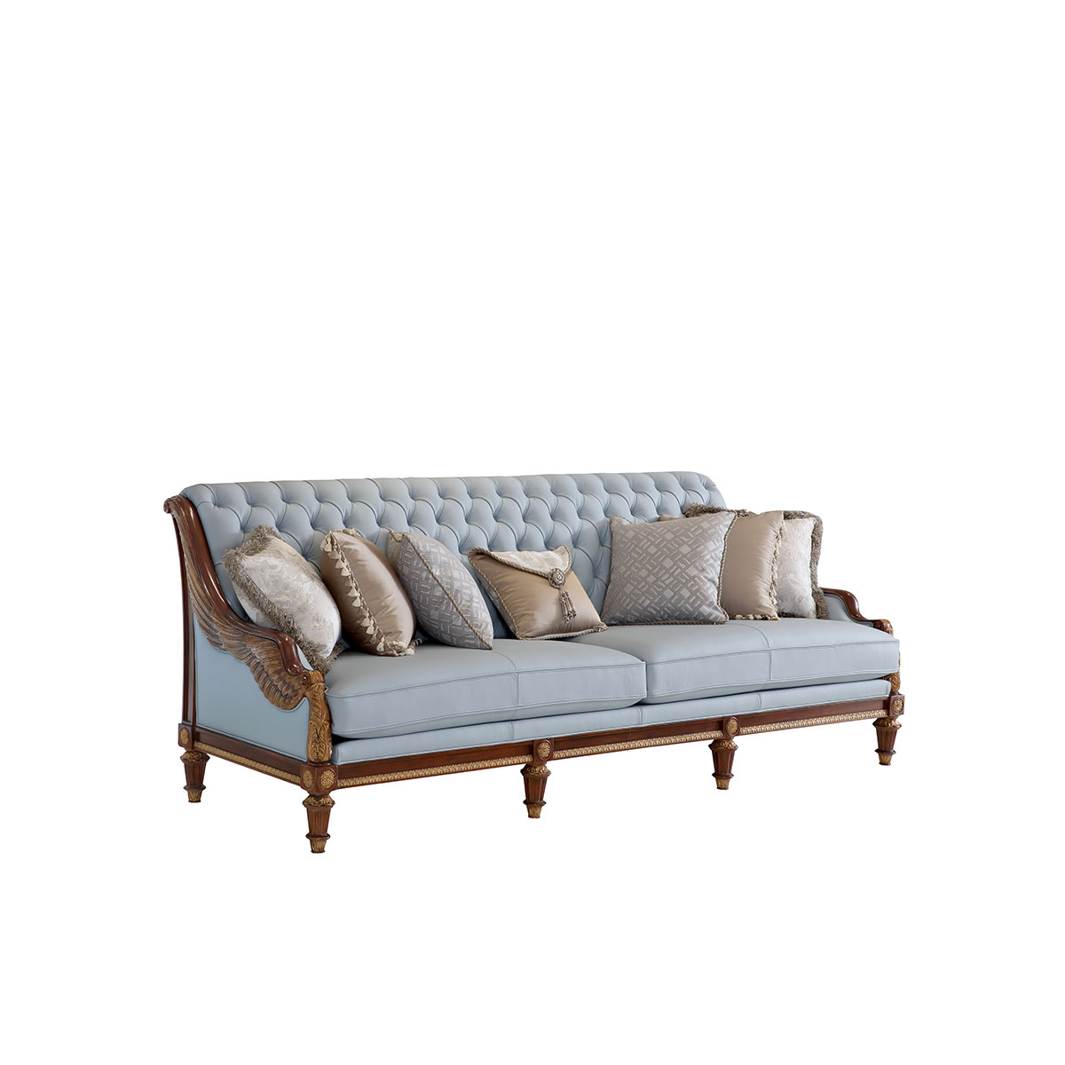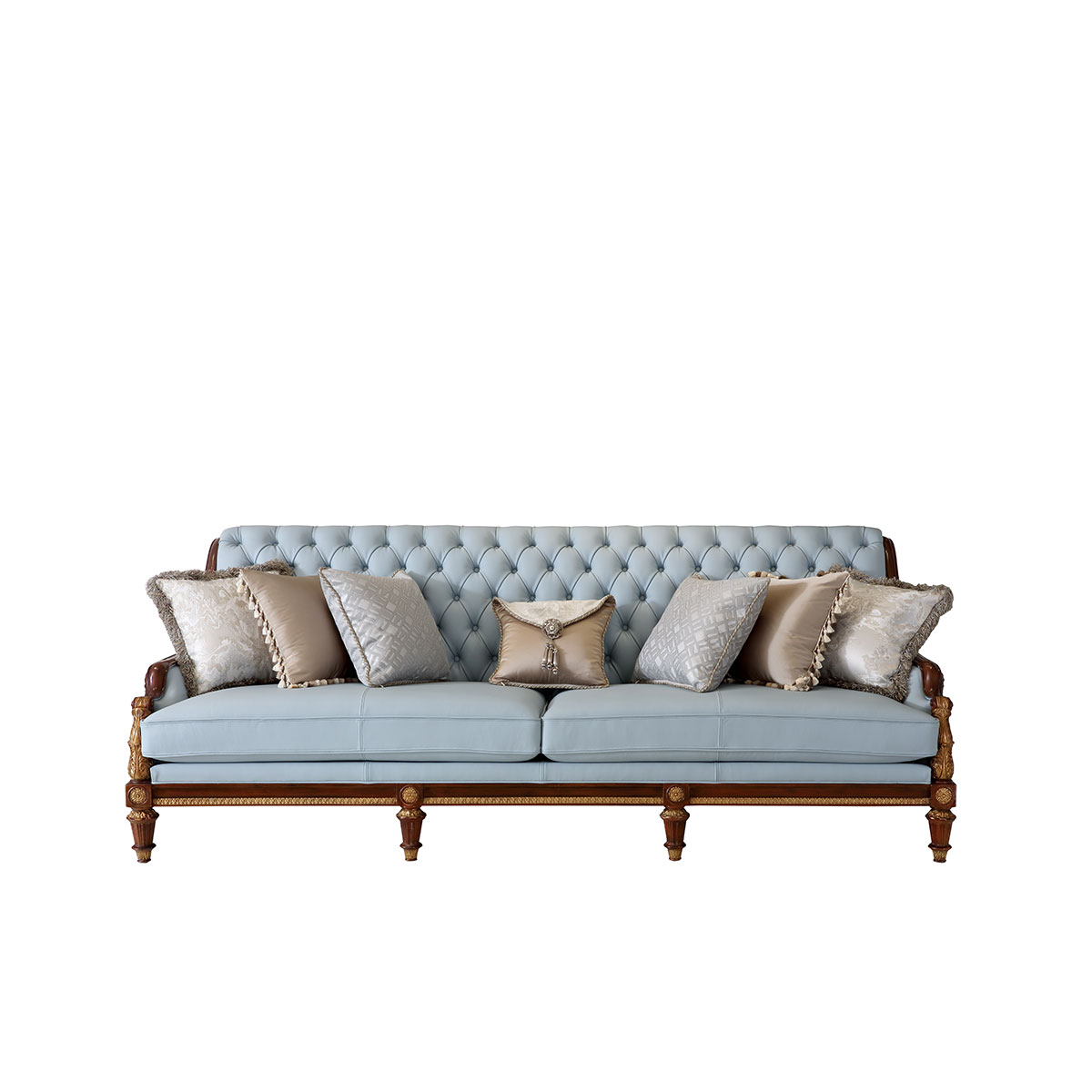* 本款沙發可選擇四片拆裝(底座、左扶手、右扶手、后背) * 手工雕刻的工藝細節 * 細致的拉扣工藝和包有豐厚的填充物坐墊; * 標配抱枕:550*550 6個 480*480 1個 * 提供多種面料可供選擇;