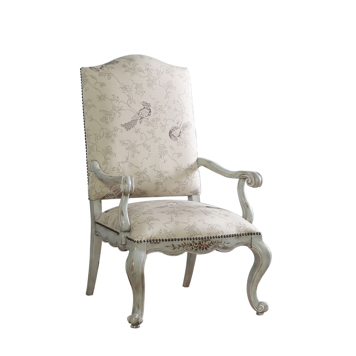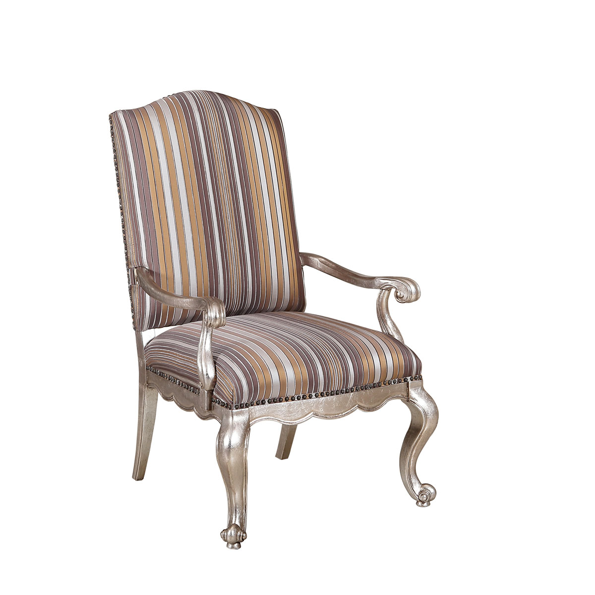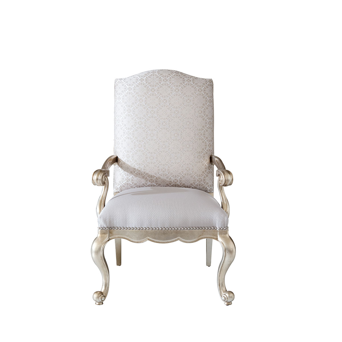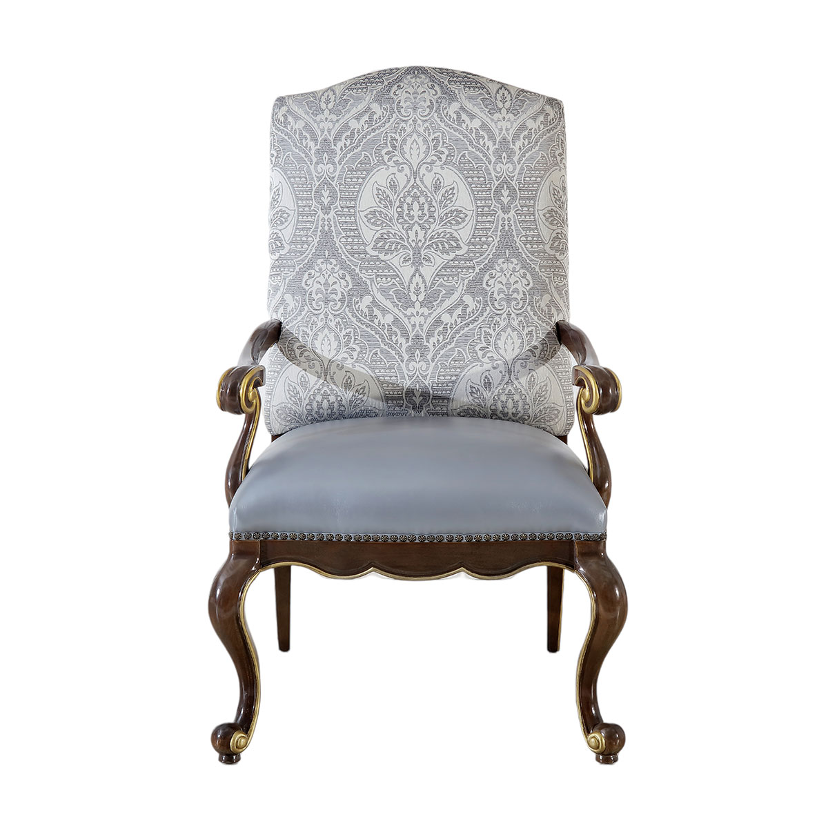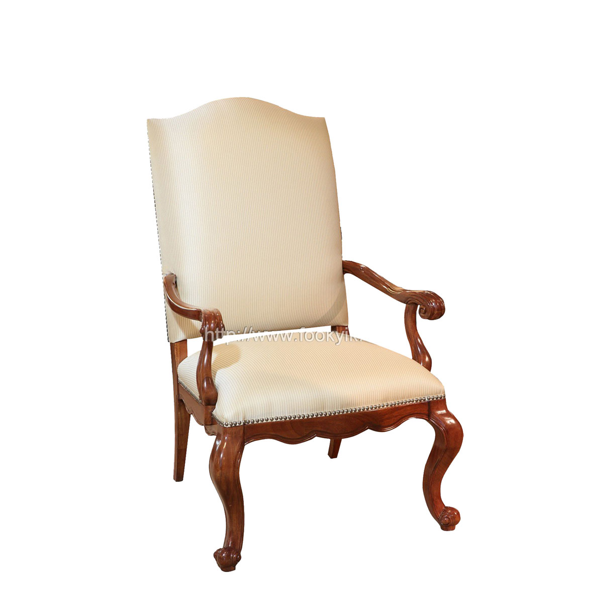 一款集合法式元素包括Camelback Silhouette(駝峰輪廓)造型、旋渦形扶手和S形彎腳的高背休閑椅,并配上觸感舒適的布藝和包有豐厚的填充物坐墊和靠背。