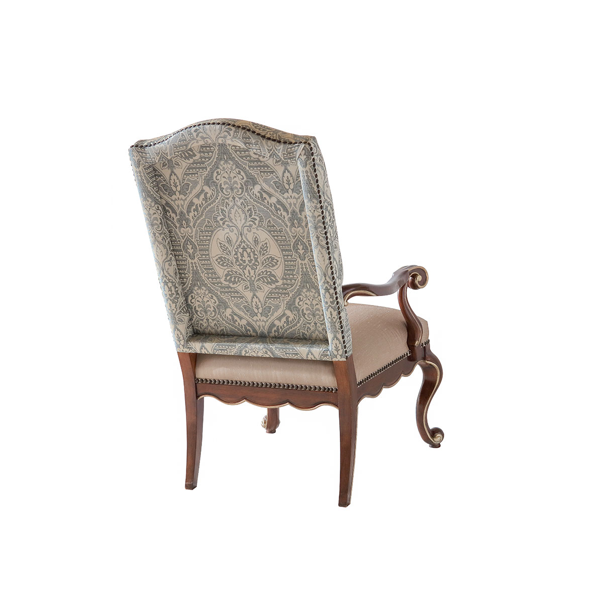 一款集合法式元素包括Camelback Silhouette(駝峰輪廓)造型、旋渦形扶手和S形彎腳的高背休閑椅,并配上觸感舒適的布藝和包有豐厚的填充物坐墊和靠背。