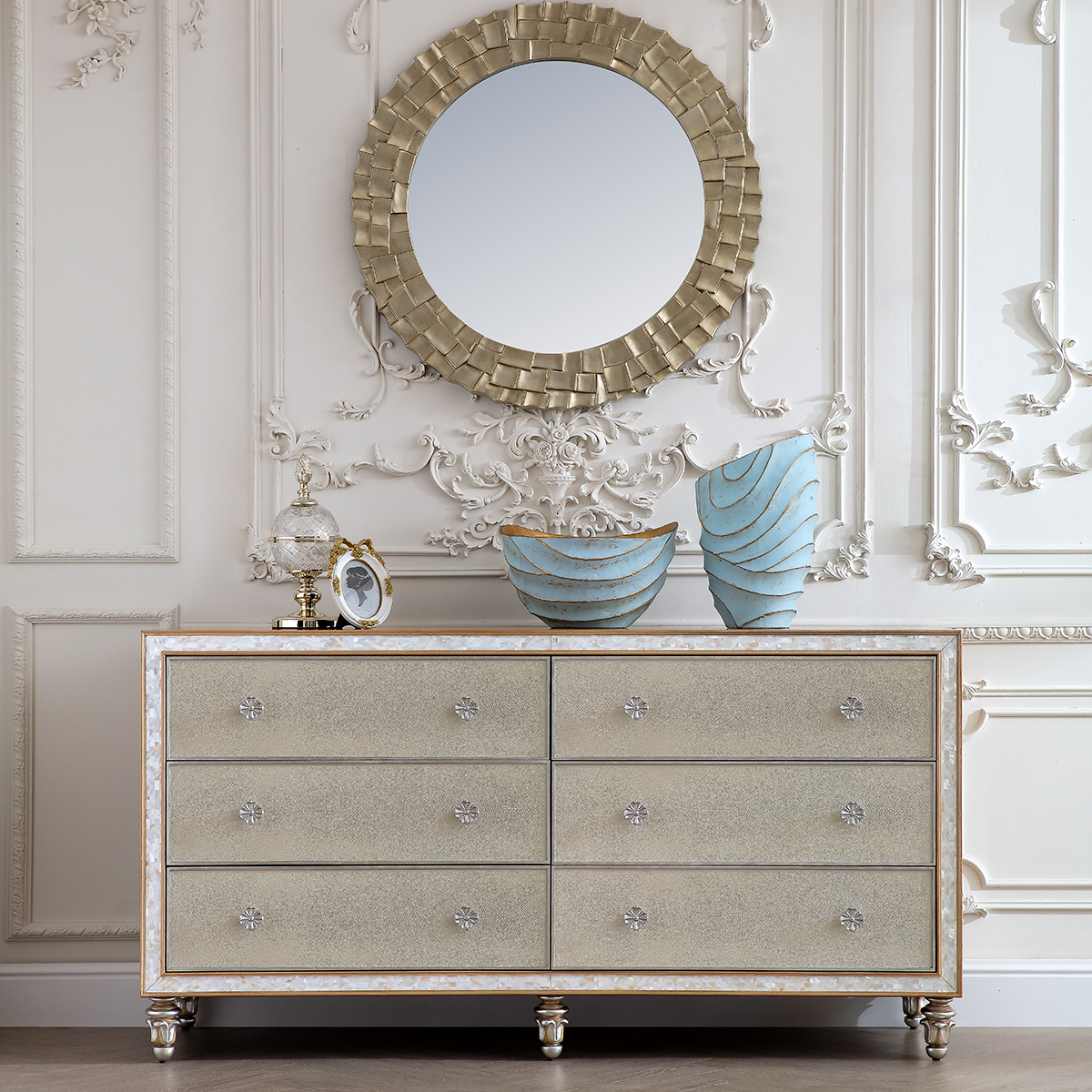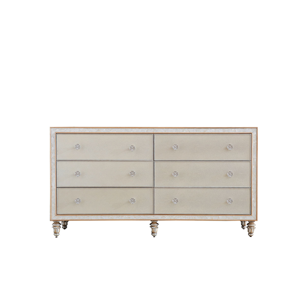 橡膠木+環(huán)保人造板+貝殼+黑胡桃+艷陽(yáng)花+櫻桃木等木皮貼面+皮革