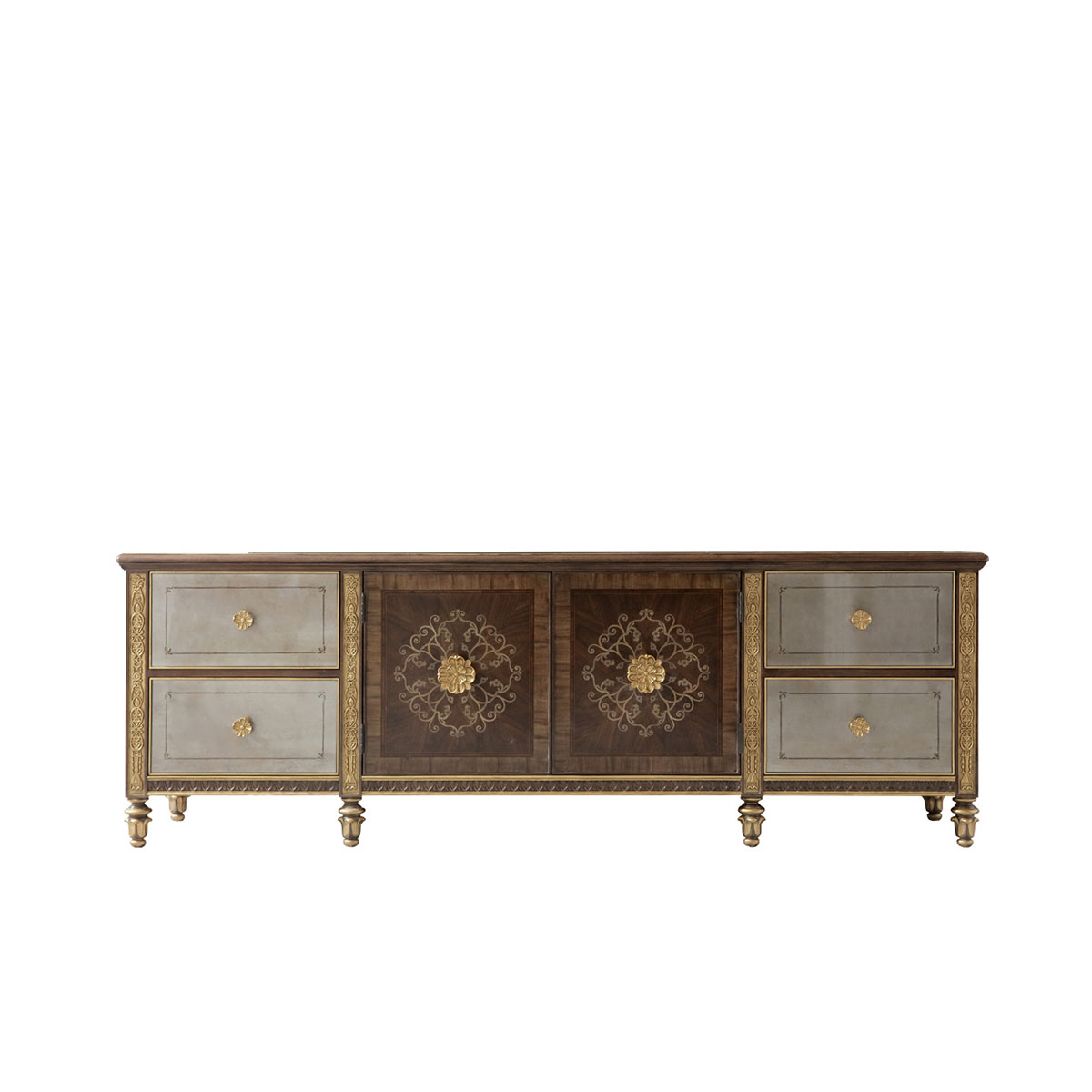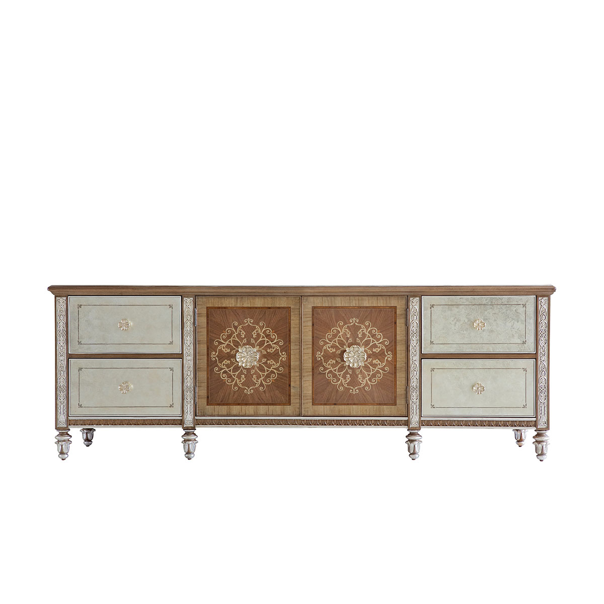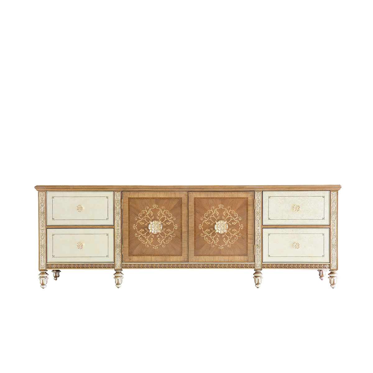 橡膠木+環保人造板+黑胡桃+艷陽花+櫻桃木等木皮貼面+藝術玻璃