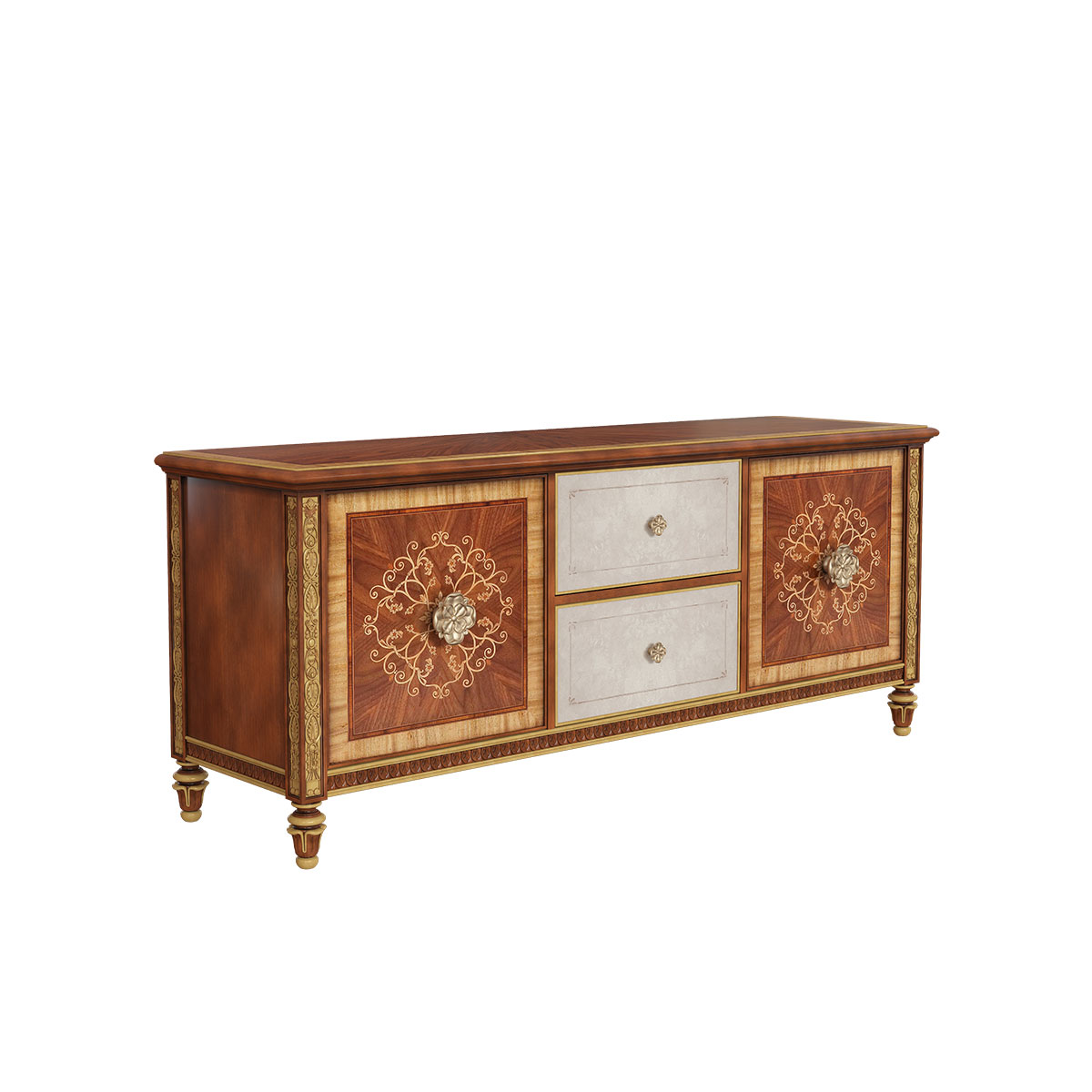 橡膠木+環保人造板+黑胡桃+艷陽花+櫻桃木等木皮貼面+藝術玻璃