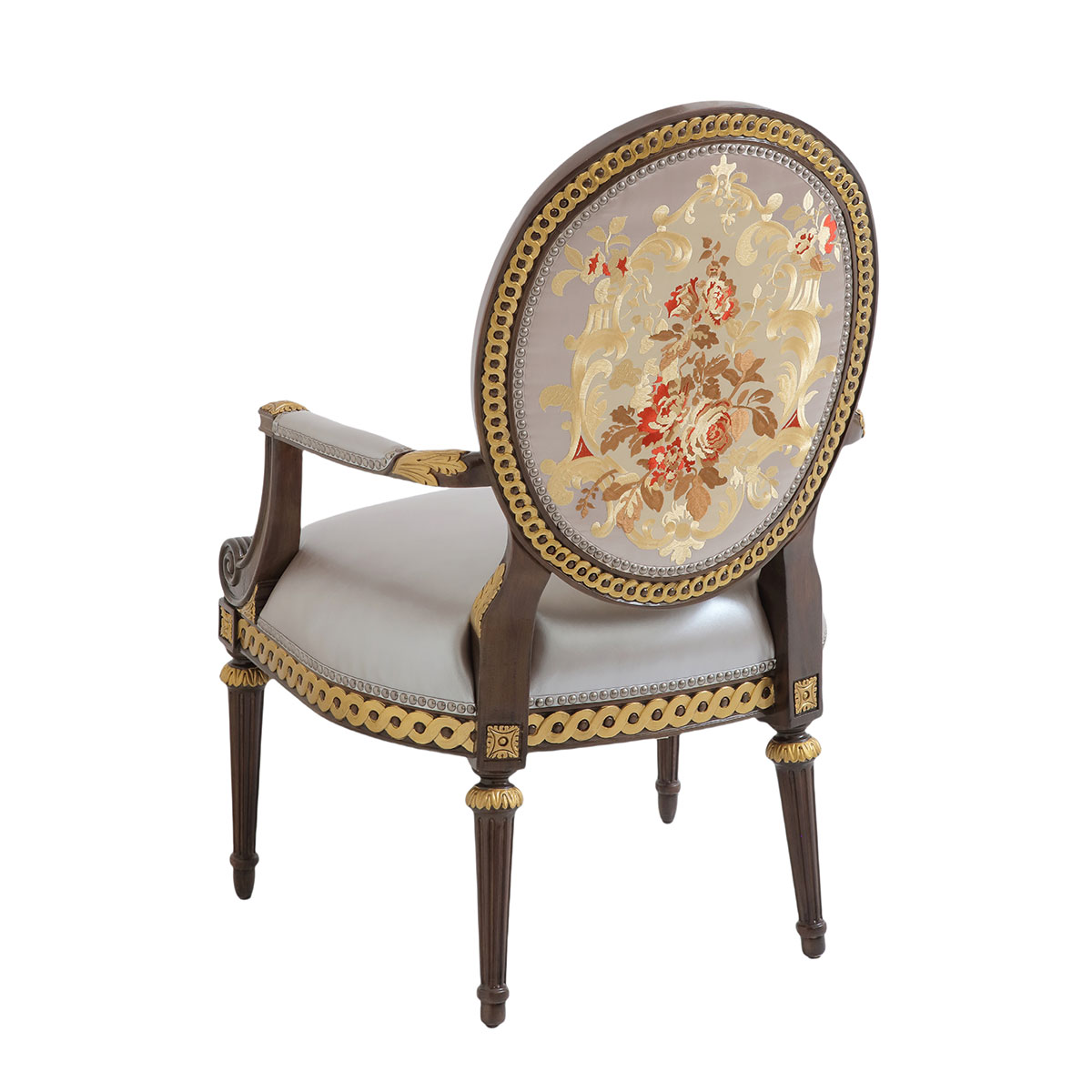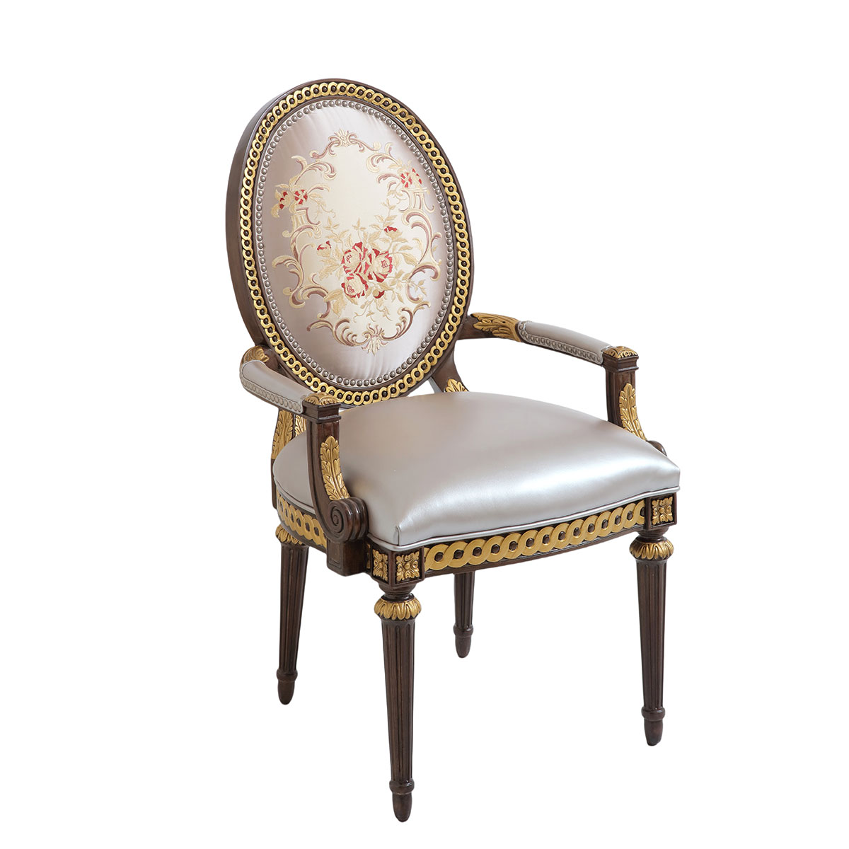 參考18世紀(jì)法國(guó)路易十六時(shí)期涂金扶手椅古董設(shè)計(jì),并結(jié)合同時(shí)期的圓面背板設(shè)計(jì)。配上精致的連續(xù)雕刻和貼金鉑工藝、錐形腳設(shè)計(jì)、觸感舒適的布藝和包有豐厚的填充物坐墊和靠背。