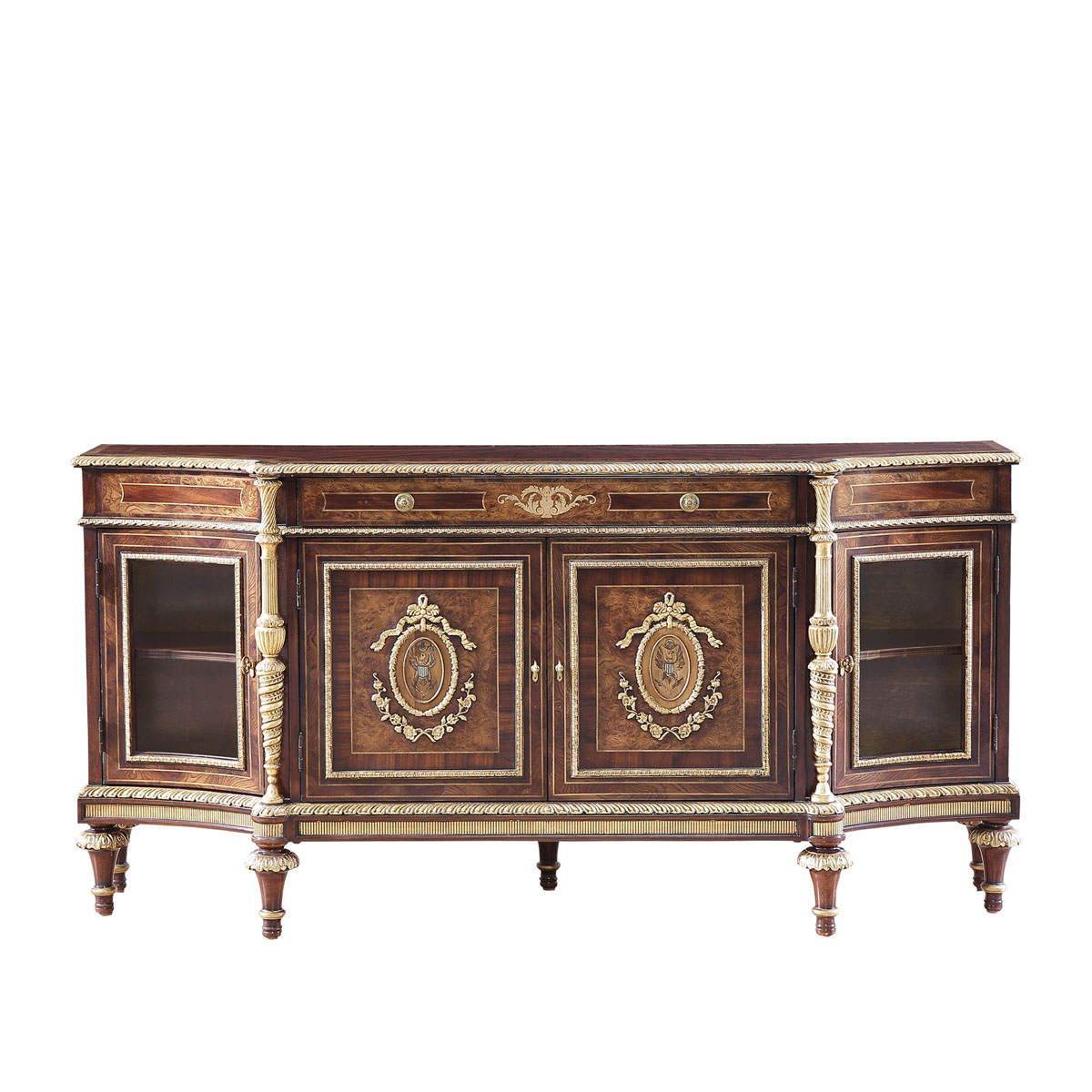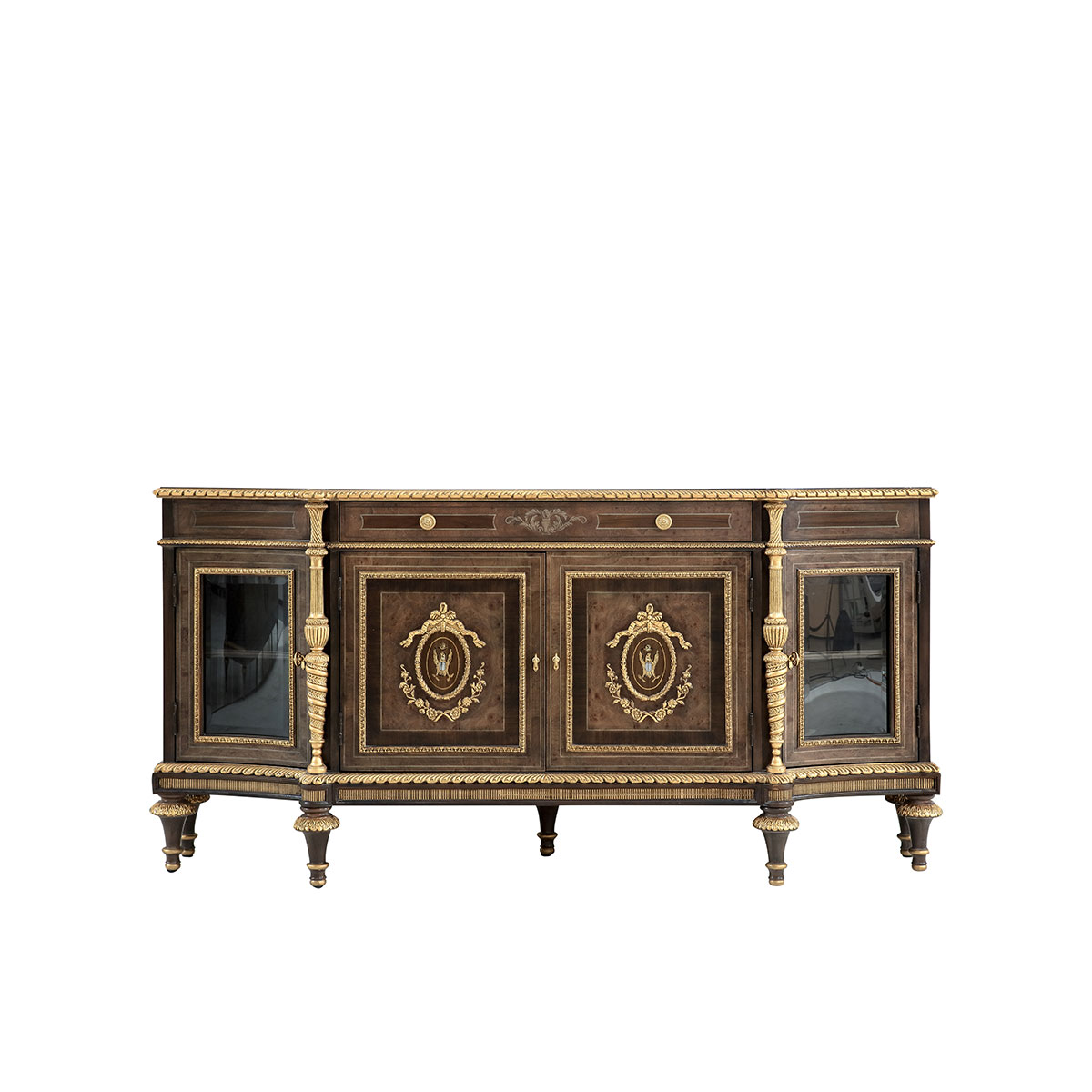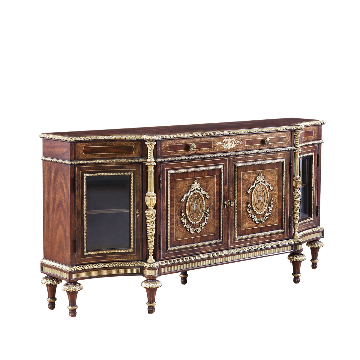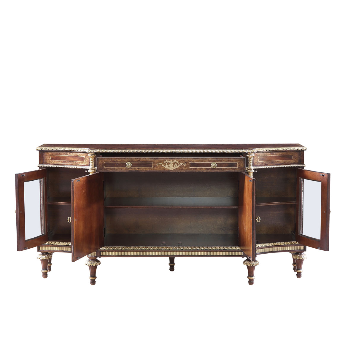 * 精致的手工雕刻細(xì)節(jié)和貼金工藝; * 一個(gè)儲(chǔ)物抽斗,底部采用硬木實(shí)木滑軌; * 左右兩邊為實(shí)木框玻璃門,四扇門內(nèi)各有一塊可調(diào)層板; * 腳底部裝有可調(diào)腳釘;