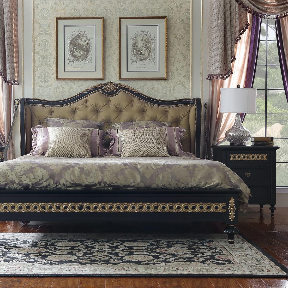 * 為表現(xiàn)法國(guó)路易時(shí)期的莊嚴(yán)和浪漫,以法國(guó)凡爾賽宮為設(shè)計(jì)元素。使用歌頌路易十四時(shí)期的太陽(yáng)花連環(huán)雕刻,配以優(yōu)雅的花形腿腳設(shè)計(jì)、古銅色的球形把手和貼金工藝,完美演繹了法式宮廷家具的奢華尊貴。