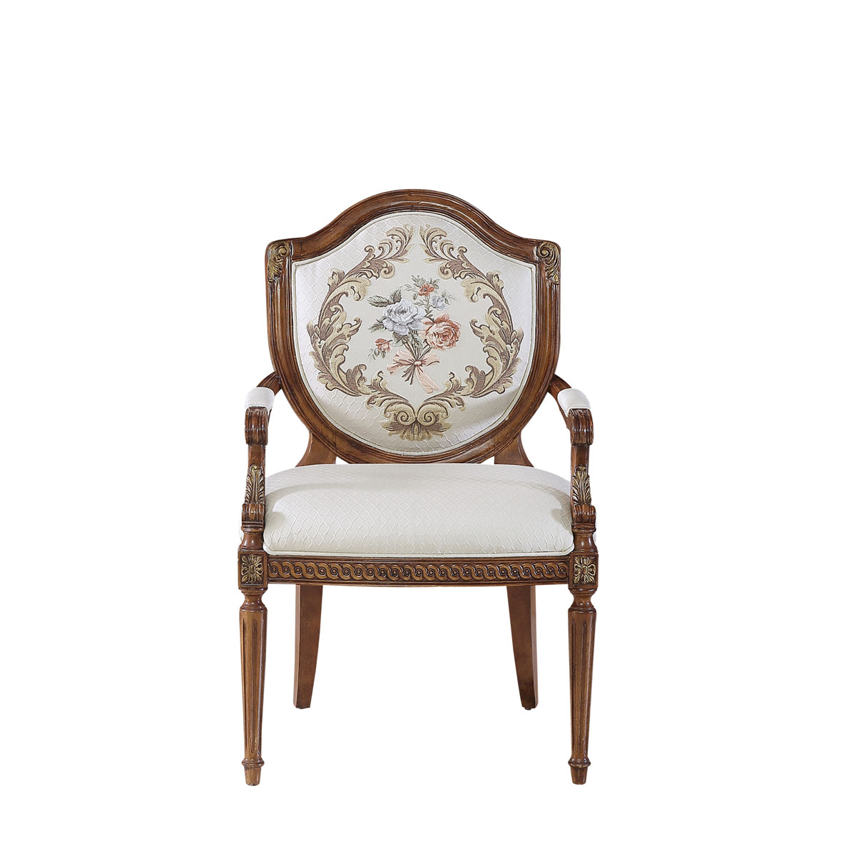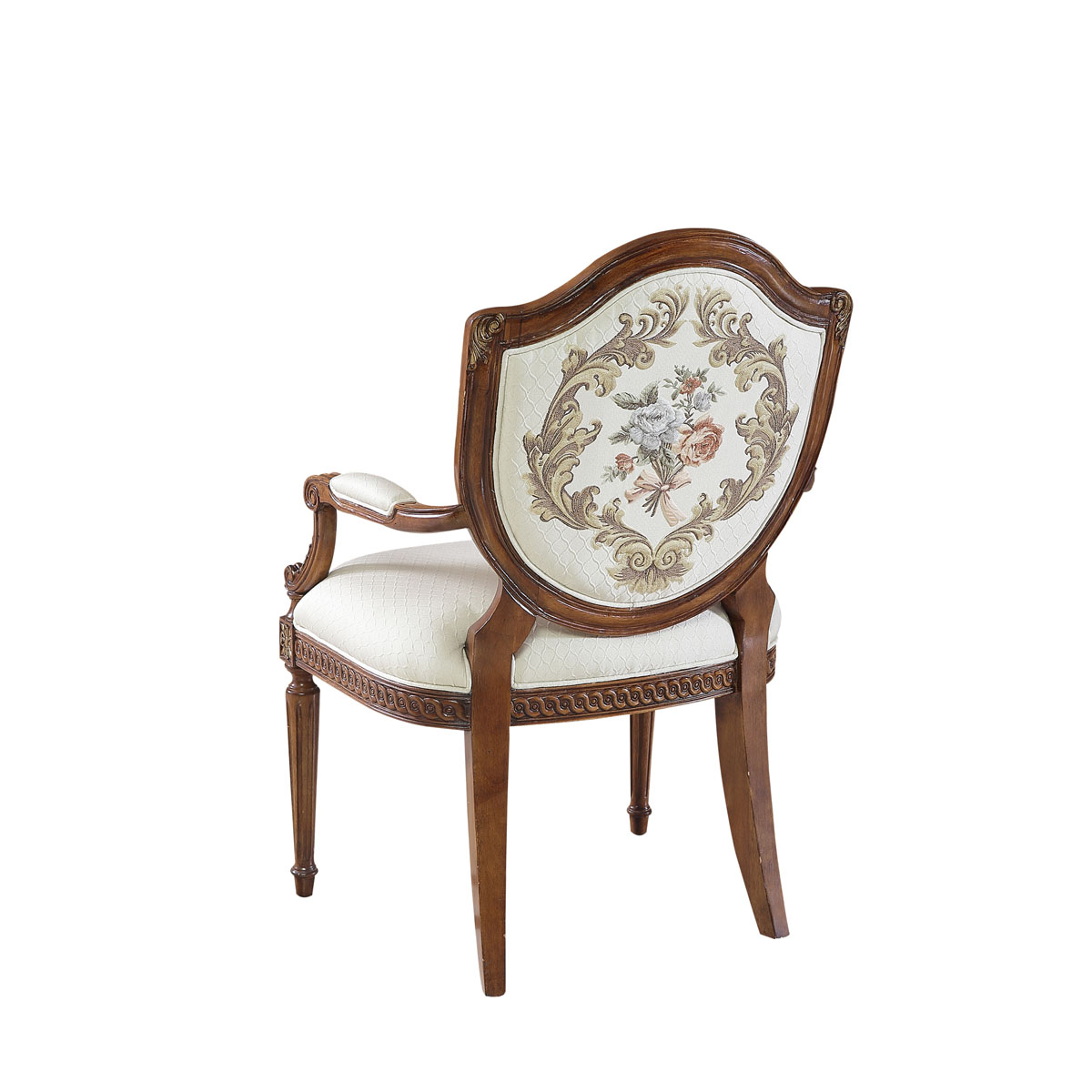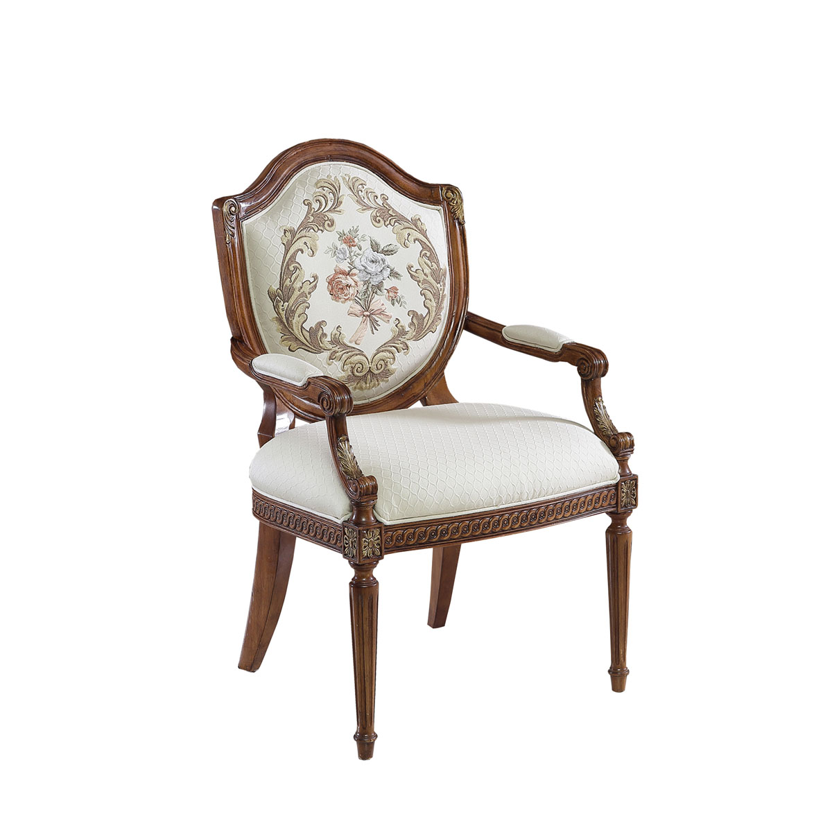 法國(guó)新古典和洛可可風(fēng)格,盾型椅背造型簡(jiǎn)約大方,建筑柱雕刻柱腿簡(jiǎn)約的直線條造型,端莊大氣,采用印花布藝,非常有田園風(fēng)的感覺(jué)。