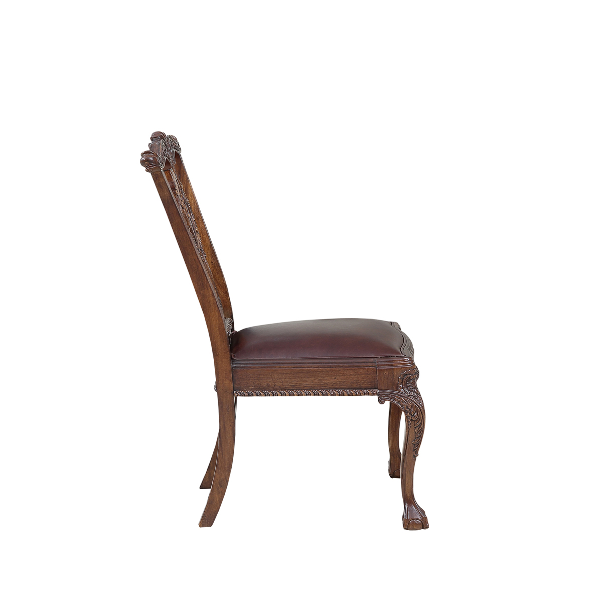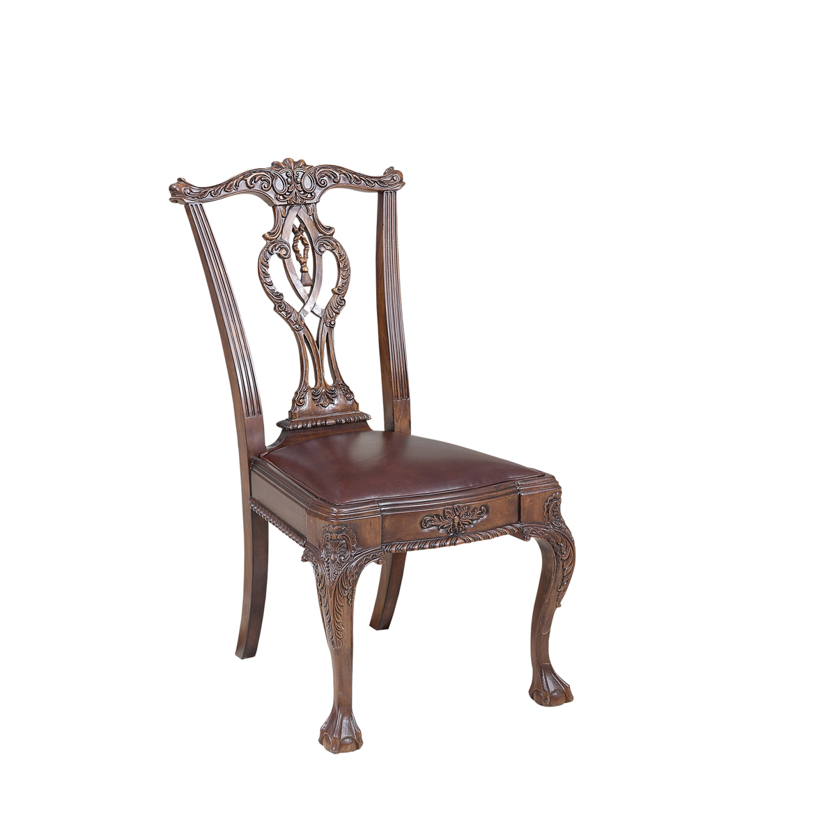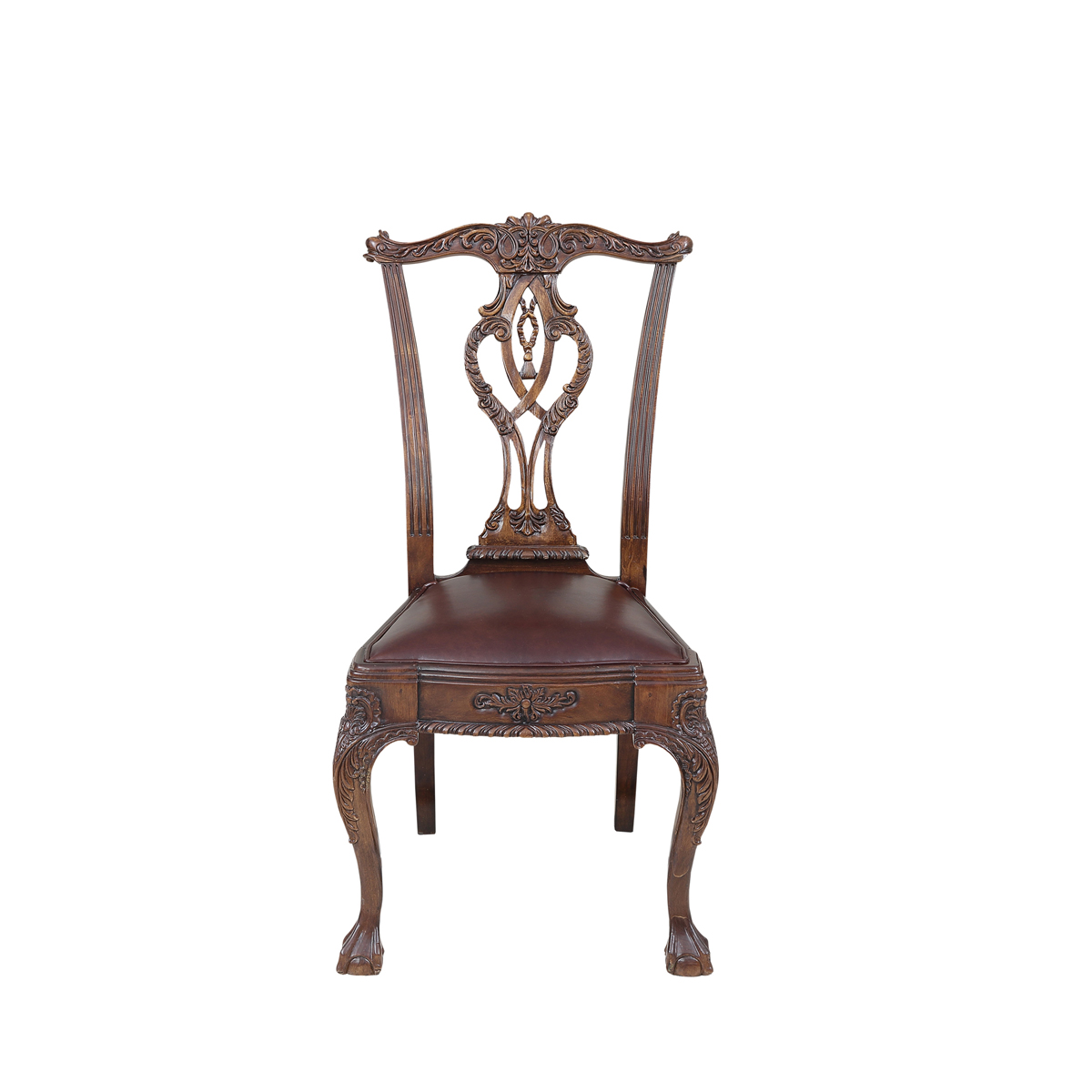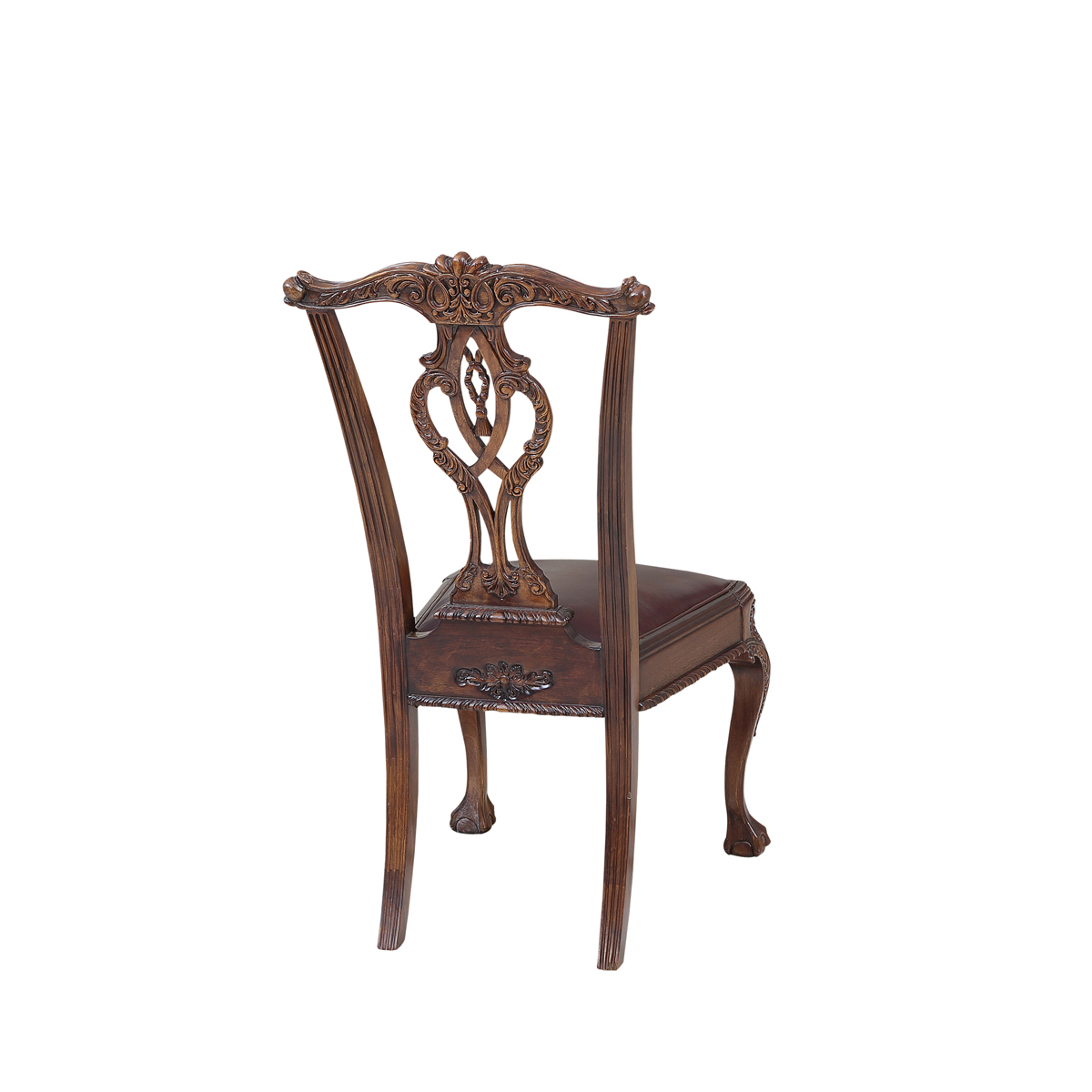 * 以明式家具為藍(lán)本的 Chippendale(齊彭代爾式)鏤空椅背和與卷葉雕刻結(jié)合的獸抓球彎腿設(shè)計(jì), 表達(dá)美國(guó)對(duì)英國(guó)潮流和中國(guó)文化的向往; 配以過(guò)百款布藝和皮革選擇, 讓傳統(tǒng)風(fēng)格充滿(mǎn)獨(dú)特性, 是豪華系列溫莎堡英式扶手椅的特色。