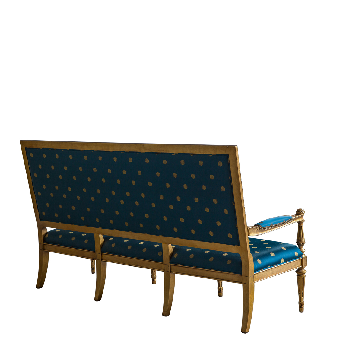 * 這是以美國白宮的Blue Room(藍色房間) 為意念并結合法國元素而設計的沙發。包括建筑雕刻錐形腳、 權杖狀的扶手柱、葉形雕刻外框和貼金鉑工藝,配上代表自由的藍色布藝和包有豐厚的填充物坐墊和靠背。