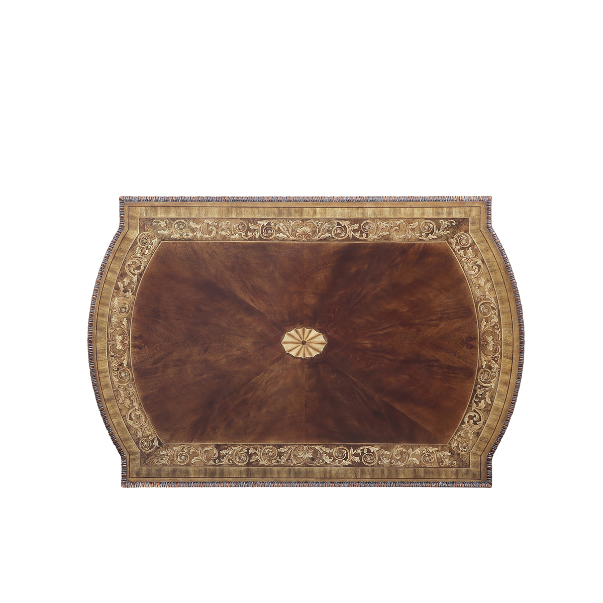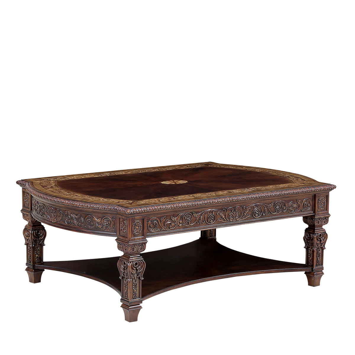 * 以現位于美國白宮中象征友誼和權力的堅毅桌(英語:Resolute desk)為設計意念, 以實木拼貼和雕刻工藝,將具有紀念意義的歷史時刻融入其中,實用性的功能設計更是把藝術和生活完美結合, 是宮廷系列華盛頓美式咖啡臺的特色。(注:咖啡桌前方有兩個儲物抽斗)