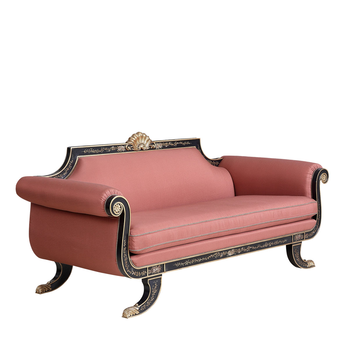 沙發(fā)采用五月花號(hào)輪船的造型,兩卷軸扶手向外翻轉(zhuǎn),纖細(xì)的四個(gè)彎腿支撐,粗中有細(xì),體現(xiàn)出航海的自由與勇敢,紅色的面料配黑色手繪的邊框,典型的中西文化合壁,典雅穩(wěn)重又倍顯多元文化的交匯融合。