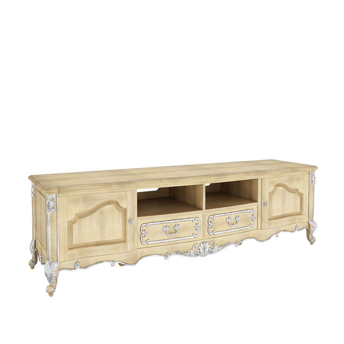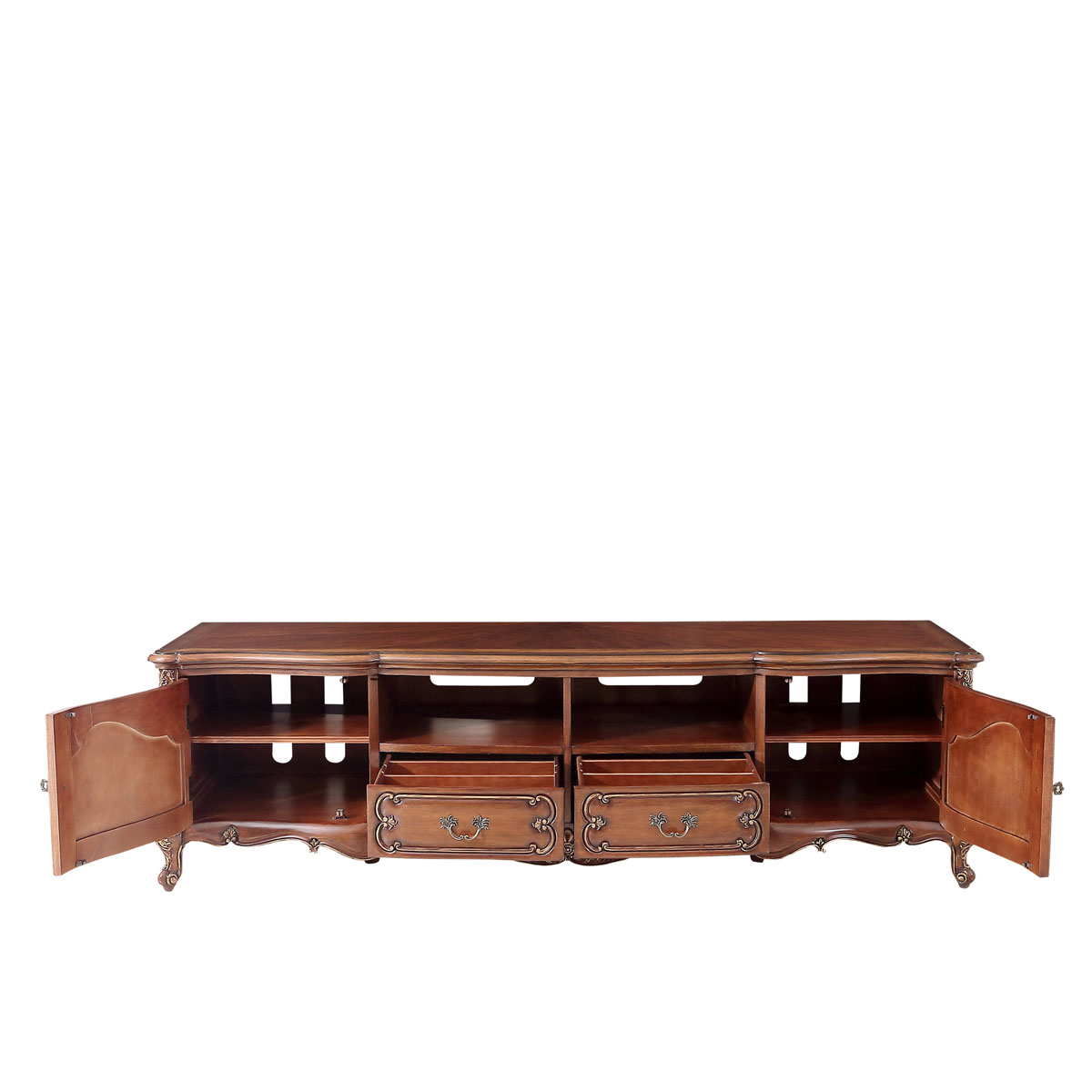* 手工雕刻的花圃、藤蔓、阿坎瑟斯卷葉圖案和彎腳設計 * 結實的連接技術 * 兩個儲物抽斗并配有CD/DVD隔板,而在其底部采用經典硬木實木滑軌設計;門內配有可調層板