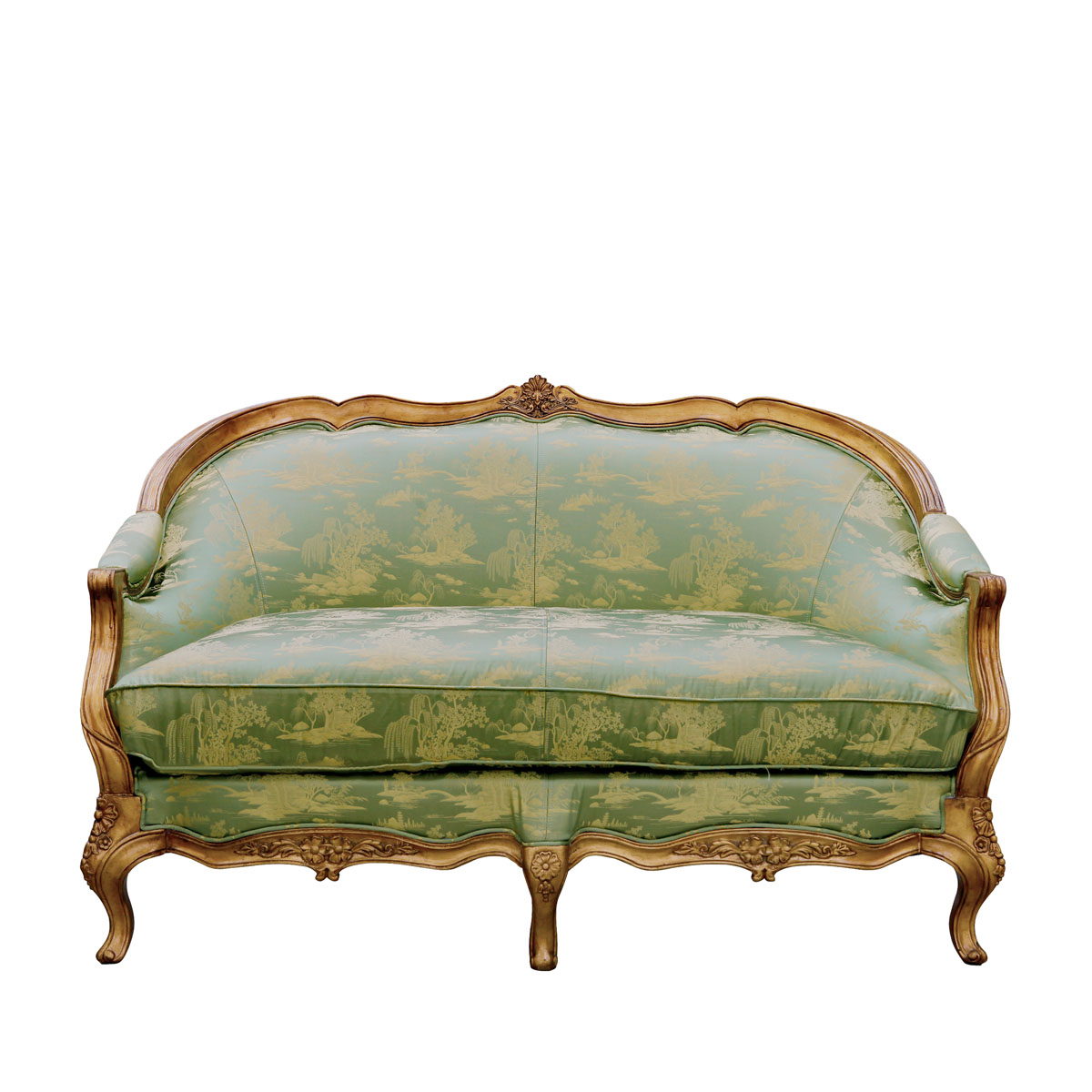 * 從法國十八世紀(jì)初攝政時(shí)期的風(fēng)格中汲取靈感制作而成,采用了同風(fēng)格的彎腳設(shè)計(jì),阿坎瑟斯葉雕刻造型和金箔貼飾,再飾以中國山水圖案的絲綢和包有豐厚的填充物坐墊和靠背,使得這款沙發(fā)閃耀著華麗高貴的光環(huán);