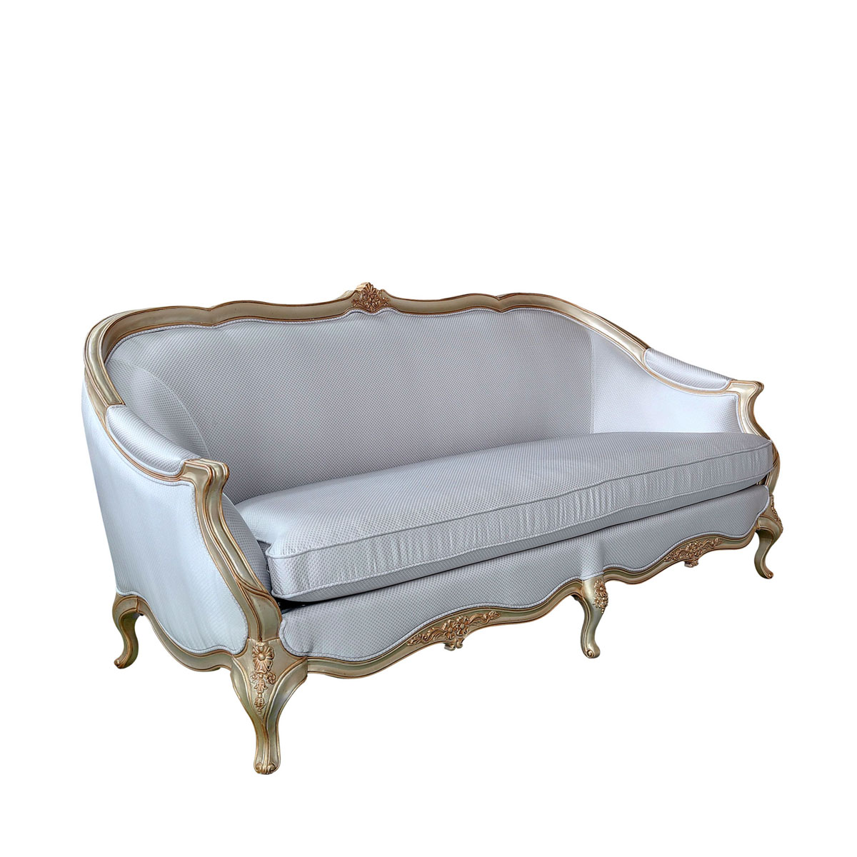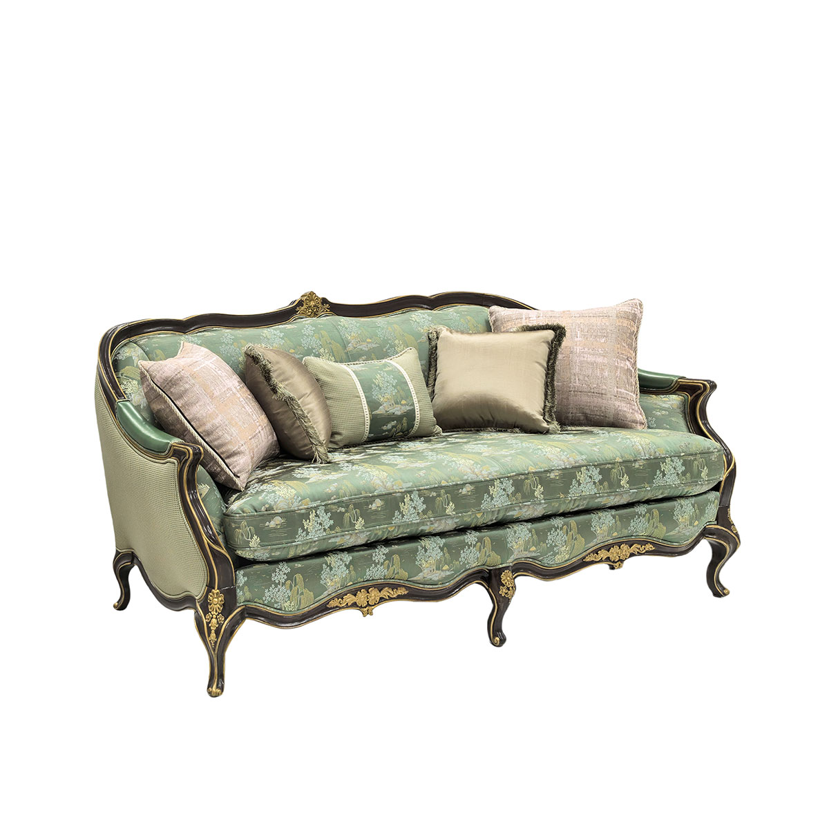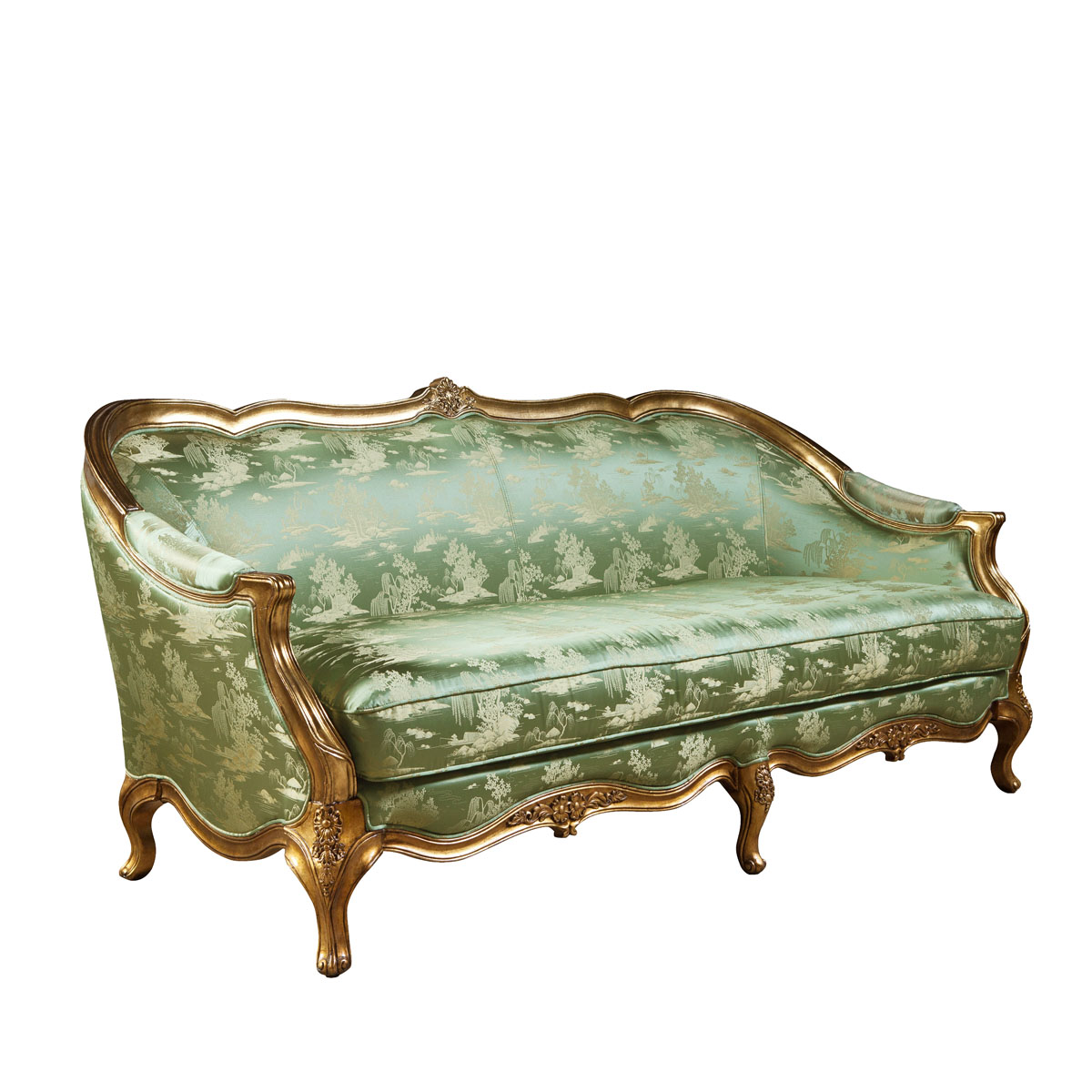 * 從法國十八世紀初攝政時期的風(fēng)格中汲取靈感制作而成,采用了同風(fēng)格的彎腳設(shè)計,阿坎瑟斯葉雕刻造型和金箔貼飾,再飾以中國山水圖案的絲綢和包有豐厚的填充物坐墊和靠背,使得這款沙發(fā)閃耀著華麗高貴的光環(huán);
