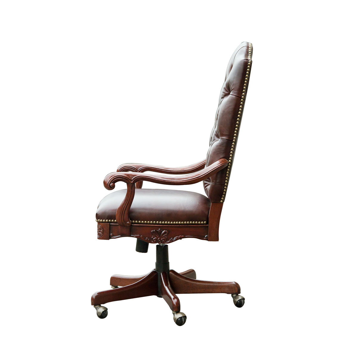 * 作為一個移民國家,各種文明在美國這片神奇的土地上兼容并蓄,在家具上亦如是;這款美式辦公椅用細膩的牛牛皮包裹著Camelbac Silhouette(駝峰輪廓)椅背,配上歐式家具的經典表現形式——拉扣設計,不僅造型美觀而且舒適實用;再點綴一些精致的花朵雕刻,辦公空間也變得如此生意盎然;