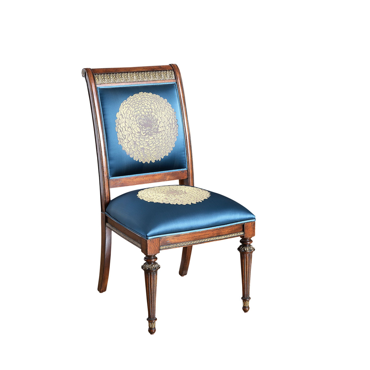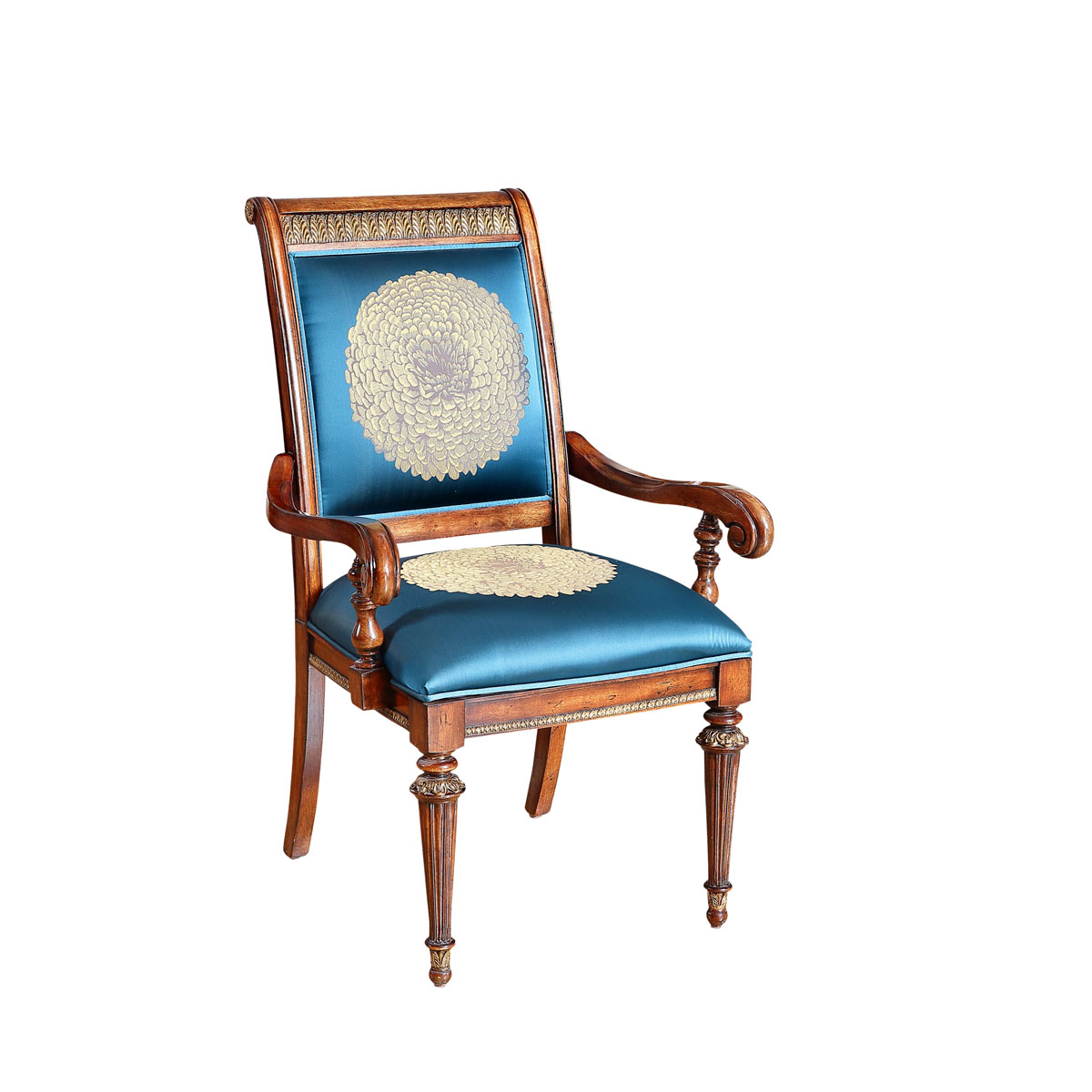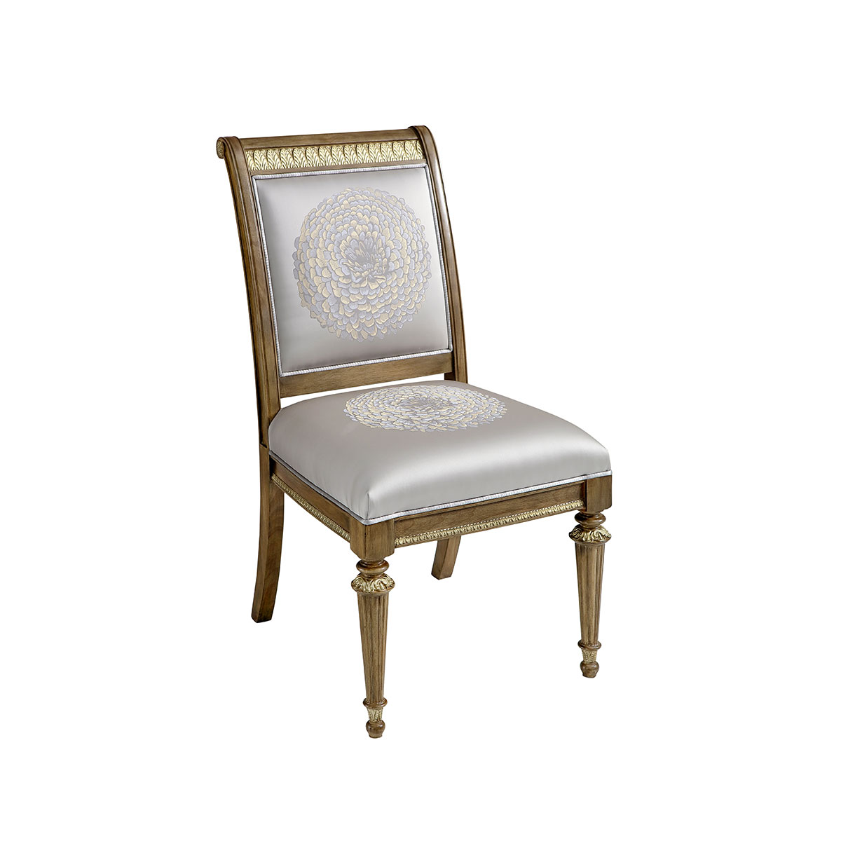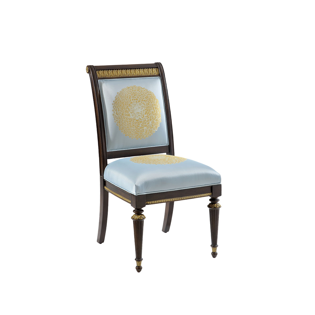 * 以17世紀意大利帝國EMPIRE風格為設計元素,結合意大利人重生活懂藝術的品位追求,使用代表榮譽的月桂葉型雕刻和錐形的腿腳設計、精致的手工雕刻細節和描金工藝,以顯示王權的穩固地位;搭配以意大利國花 ——雛菊為意念的金菊圖案,還有布藝和厚實柔軟的填充物,精彩展現了意式家具奢華絢麗而又極富藝術人文氣息的迷人魅力;