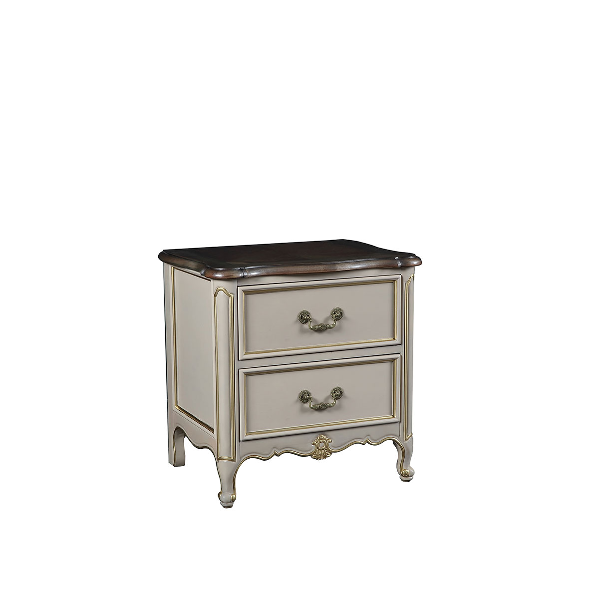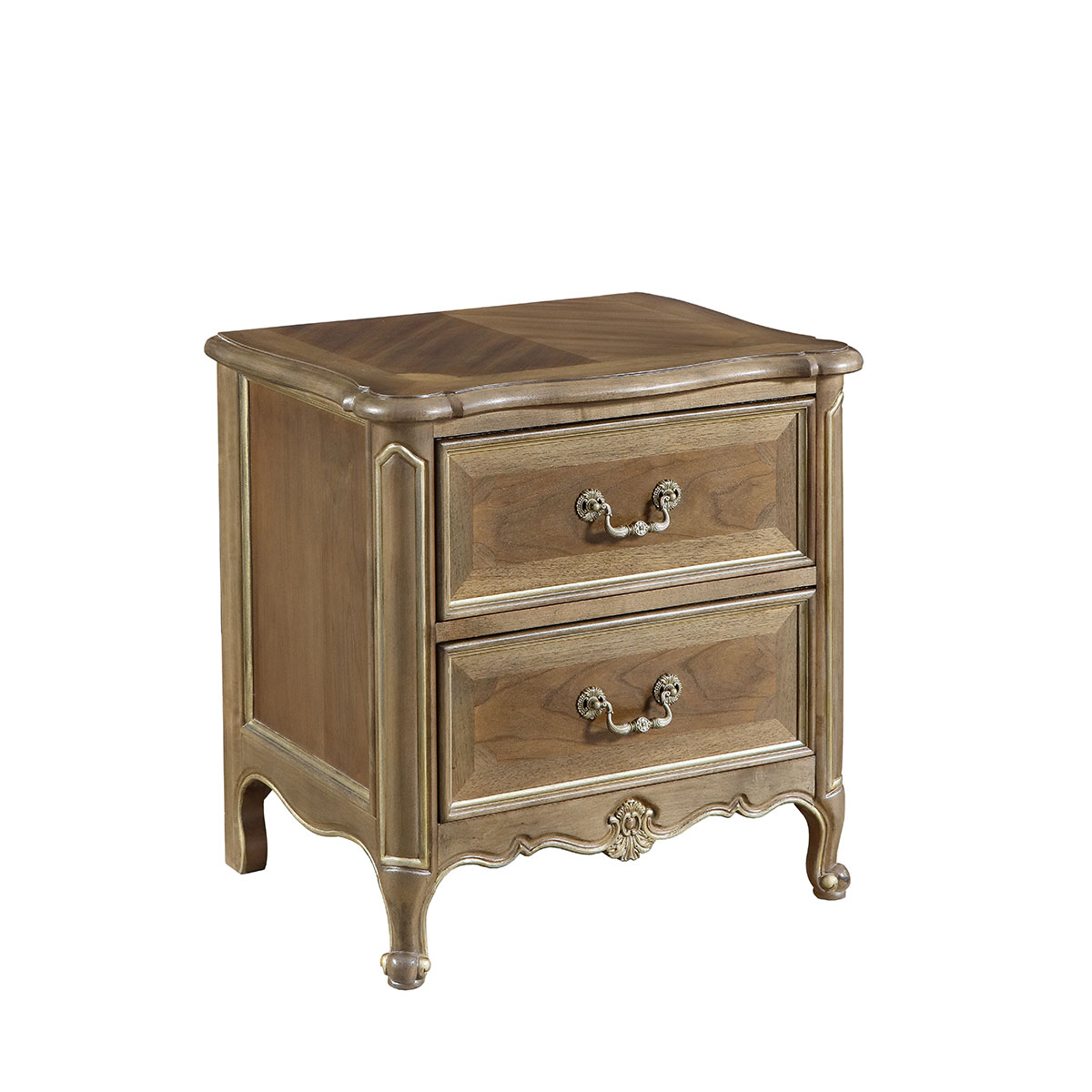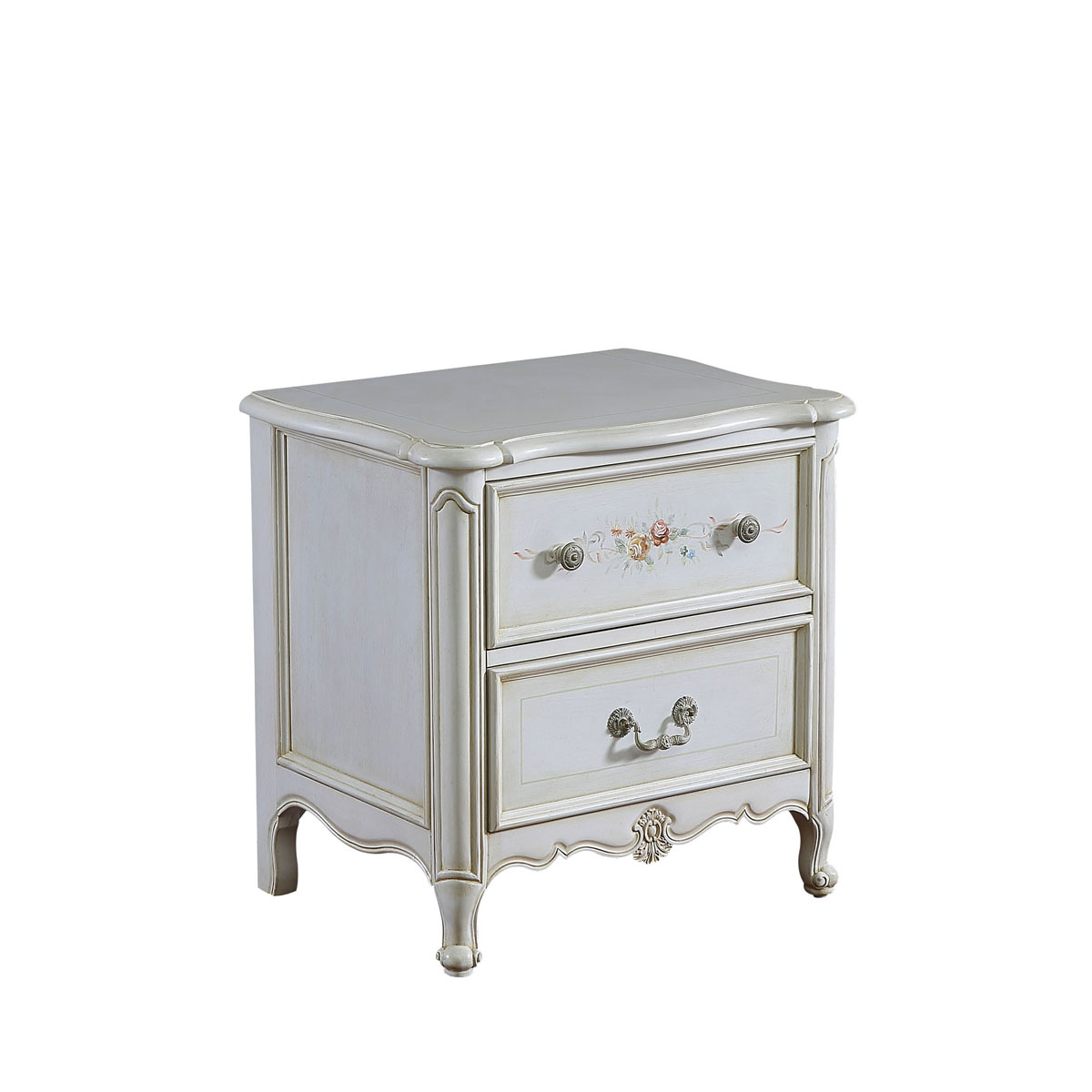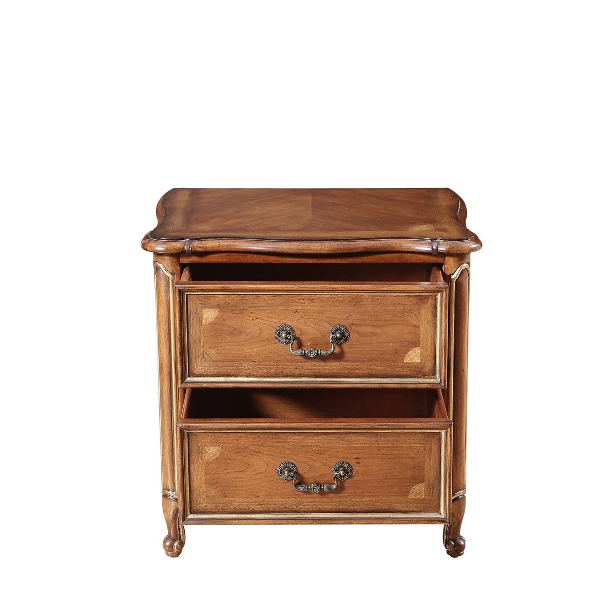 * 手工拼花藤蔓效果,用多種上等木皮拼制而成 * 二個儲物斗,底部采用經典的硬木實木滑軌; * 腳底部裝有可調腳釘