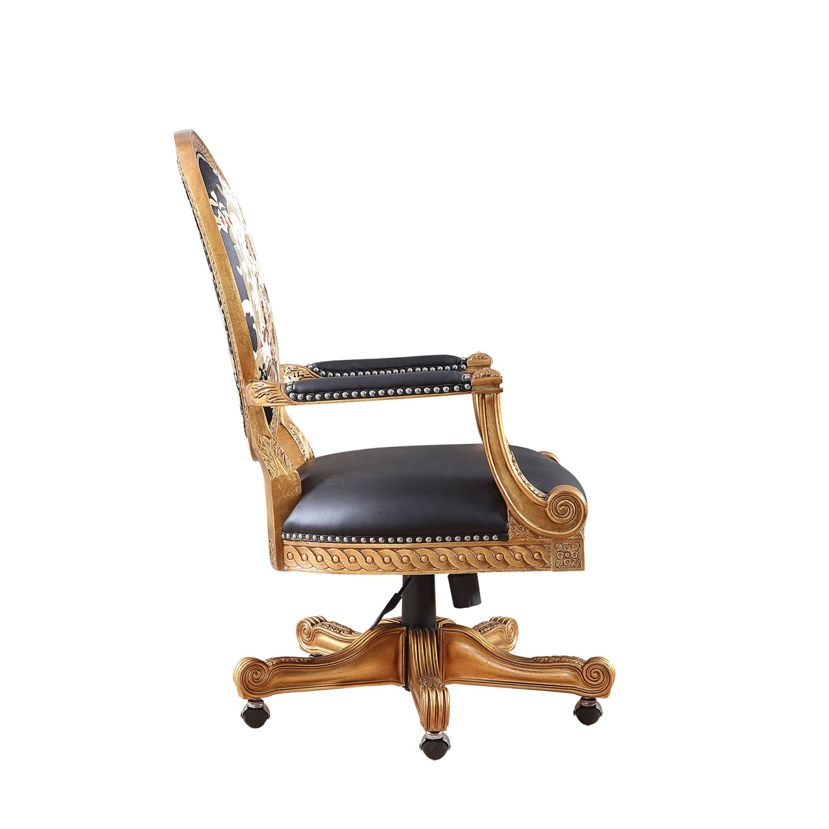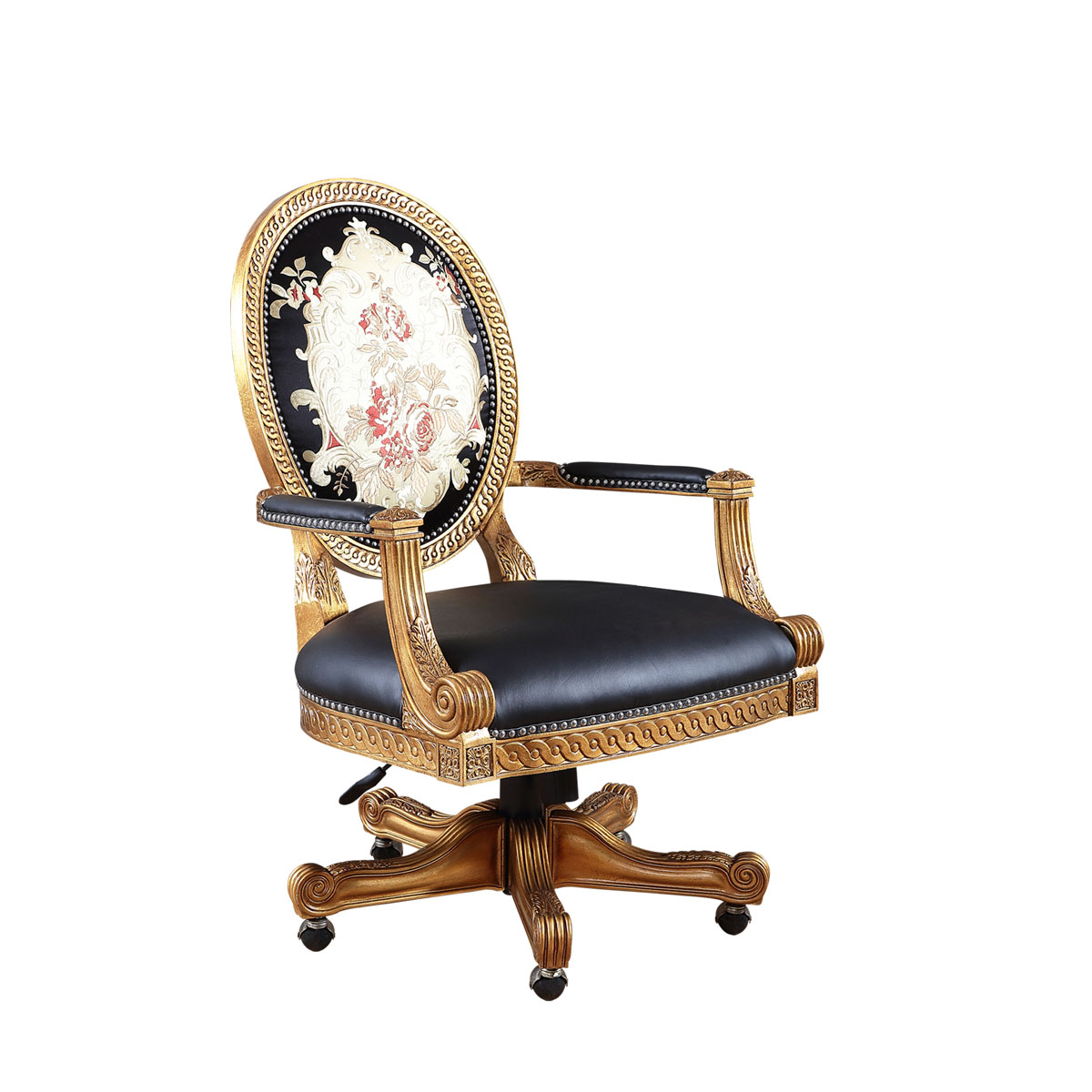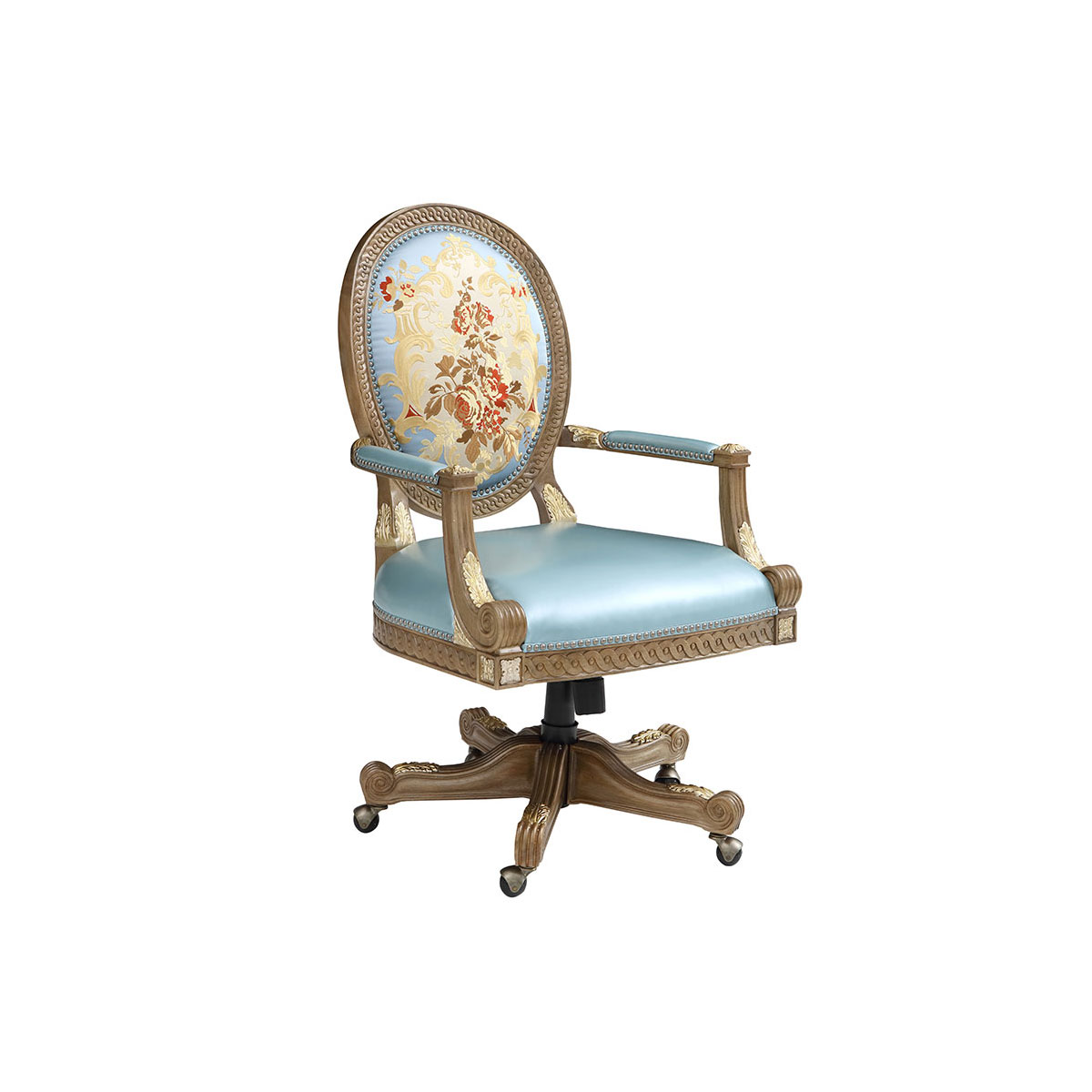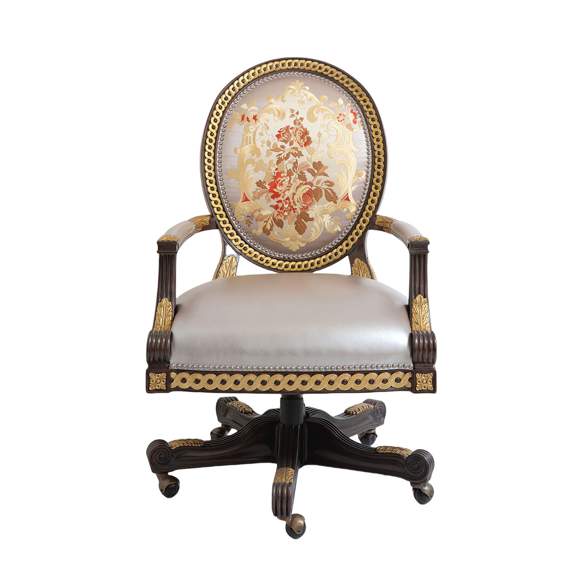 * 參考18世紀法國路易十六時期涂金扶手椅古董設計,并結合同時期的圓面背板設計。配上精致的連續雕刻和貼金鉑工藝、錐形腳設計、觸感舒適的布藝和包有豐厚的填充物坐墊和靠背。