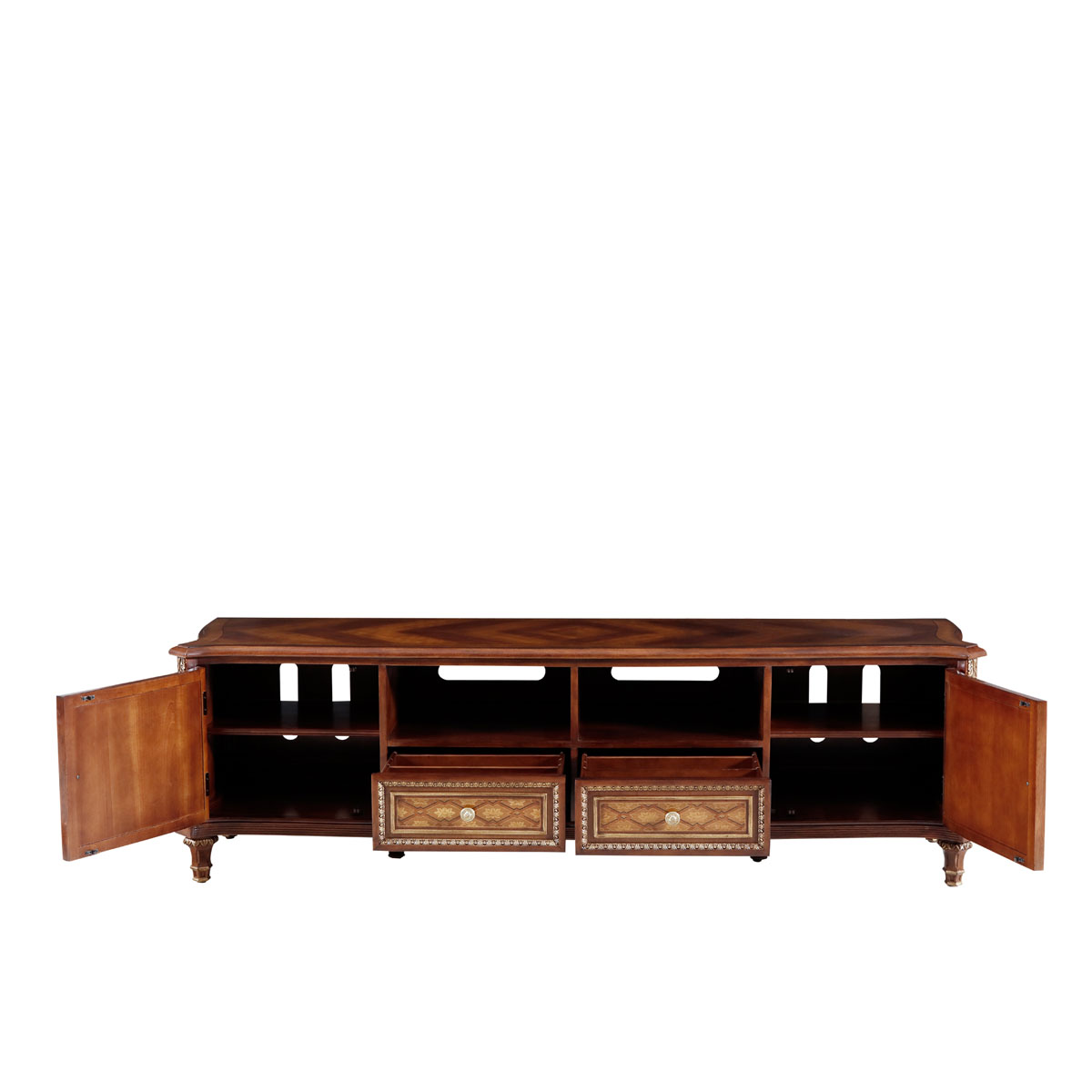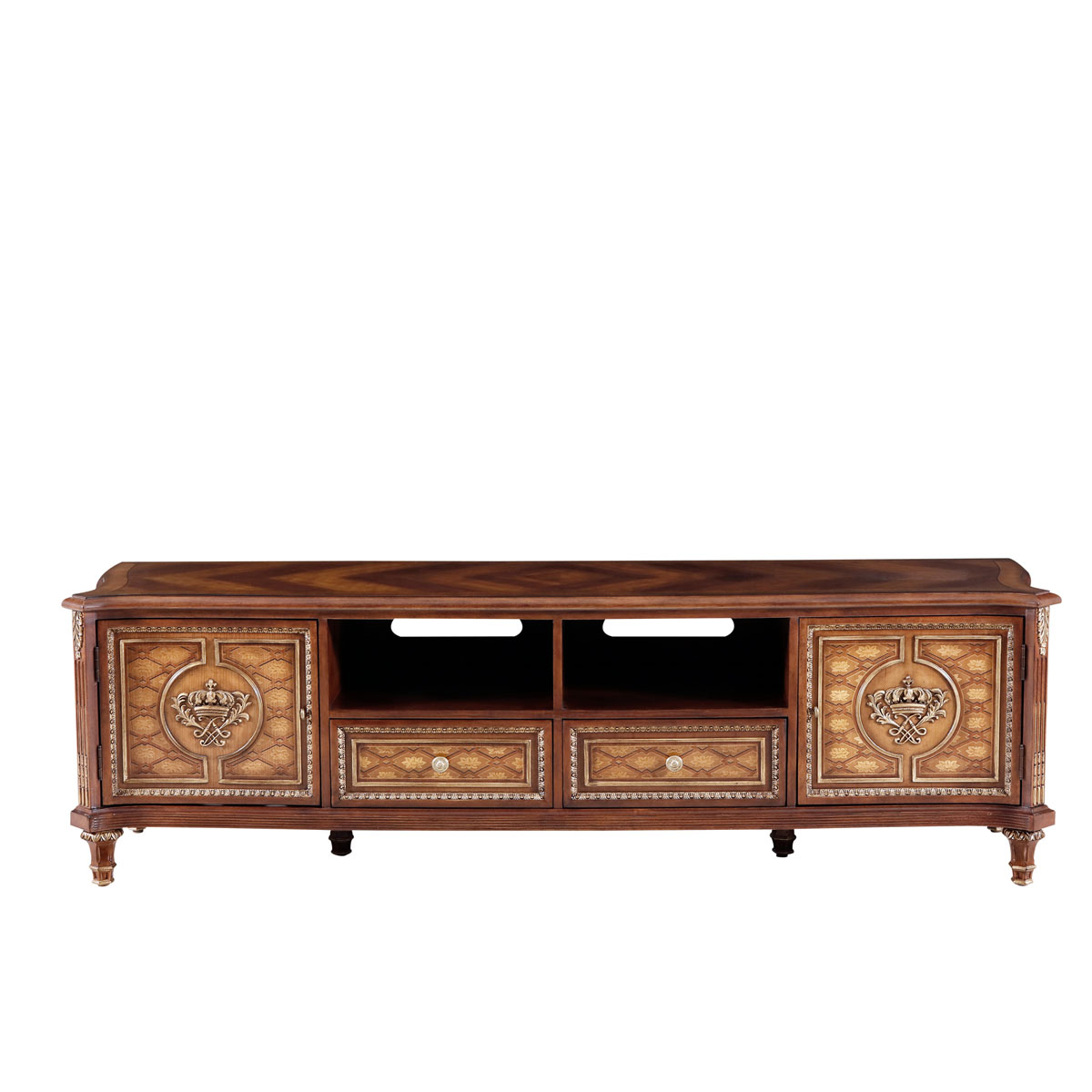 凡爾賽玫瑰電視柜 以 Louis路易時期 Bombe Chest(邦貝柜)新古典風格為設計靈感,多種珍稀木皮貼飾成的木皮拼花清晰美觀,斗面鑲嵌路易十四太陽王的“L”字圖騰雕刻,沐浴著太陽之光象征王權榮耀,