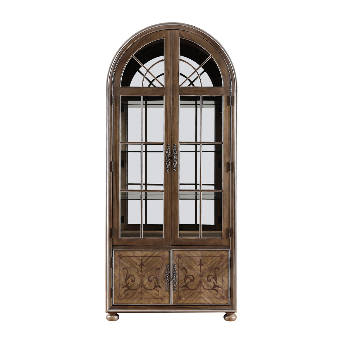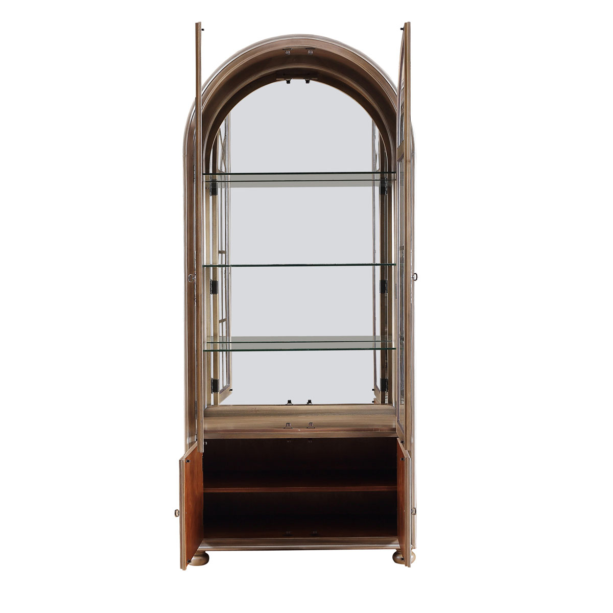 * 門內(nèi)有三塊玻璃層板,背板處裝有背鏡,使柜身內(nèi)部的光線更通亮; * 下門內(nèi)有一塊可調(diào)木制層板;