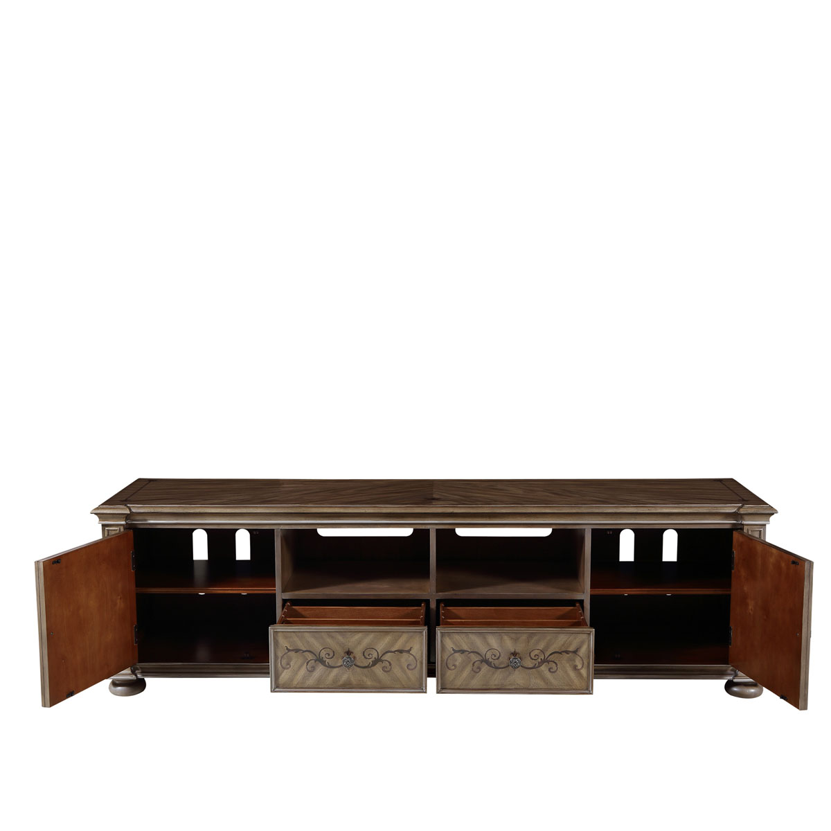 * 中間兩個儲物抽斗配有CD/DVD隔板,可CD/DVD更好的存放,其底部采用經典硬木實木滑軌設計; * 兩扇門內各有一塊可調層板;上部為開空設計,可在內放播放器等電子器材; * 腳底部裝有可調腳釘;