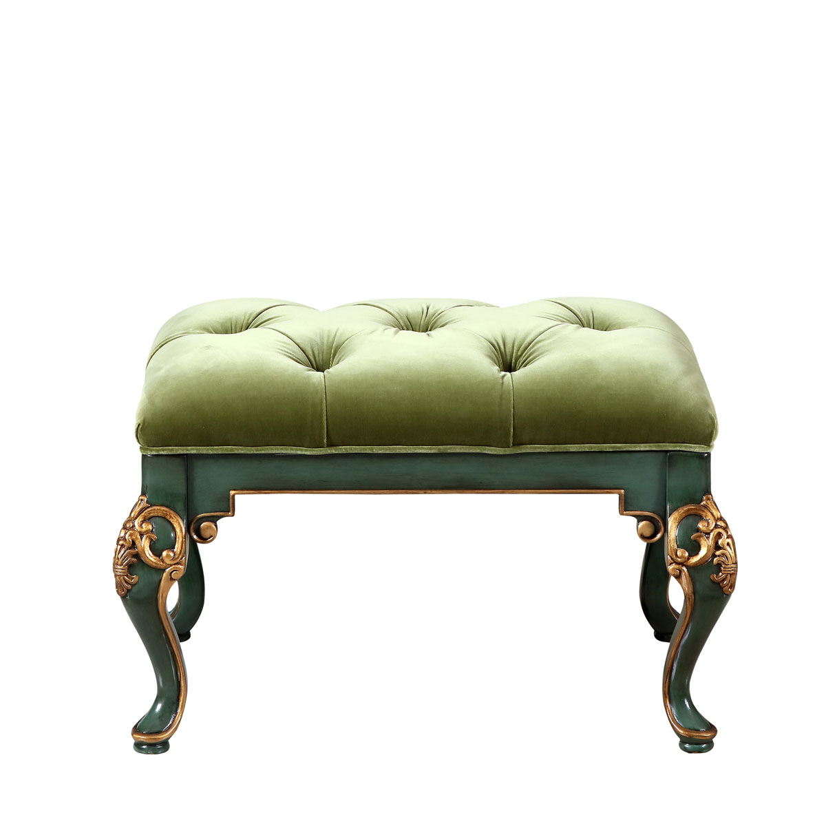 安妮皇后時期的S型彎腿,表現出流暢優雅的動態美感,高檔的布藝面料和厚實柔軟的填充物完美結合,賦予了這款梳妝凳極強的實用功能;富麗堂皇的卷葉雕刻在金箔貼飾的裝扮下,渲染出極致奢華的視覺震撼,這種裝飾手法一度是王室貴族的專屬。